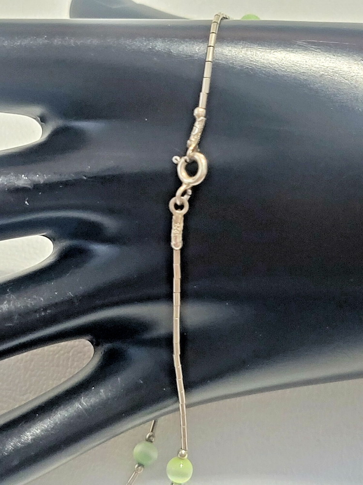 925 LIQUID SILVER GREEN CA'S EYE ANKLET BRACELET 10" BOHO SURFER SOUTHWEST 1078 ****************************** Thank you for your interest in our jewelry. We'd like to introduce ourselves. We are just a retired couple who love matching our customers with great jewelry. We're not professional jewelers. To have the best shopping experience we like to recommend the following: Please measure your hand, wrist, finger or neck to ensure the best fit. We can use your measurements to help with sizing. Please ask all the questions you want. We know some stuff and, if we don't, we'll do the research. We like to learn too. More Stuff: If an item is described as "gold over 925 sterling silver" this means it is gold vermeil. Vermeil is the process by which a layer of gold (usually 14k or 18k) is bonded to sterling silver. We only clean with gentle soap and warm water to avoid damage. The items we sell may be new or pre-owned and may have normal wear, slight damage, and/or tarnish. We make every effort to ensure the items we sell are as described. This includes testing to confirm metal purity if the item isn?t marked, and testing for gemstone identity. We try to put measurements in the jewelry description and include a photo of each piece with a U.S. quarter (25mm).
