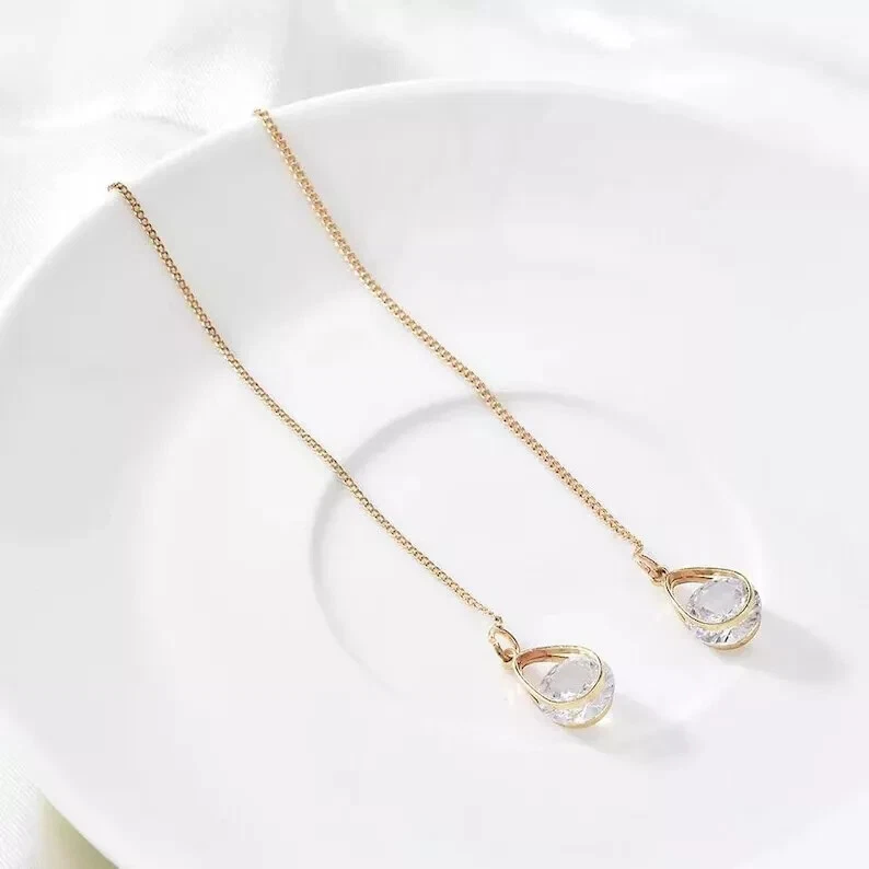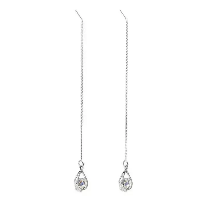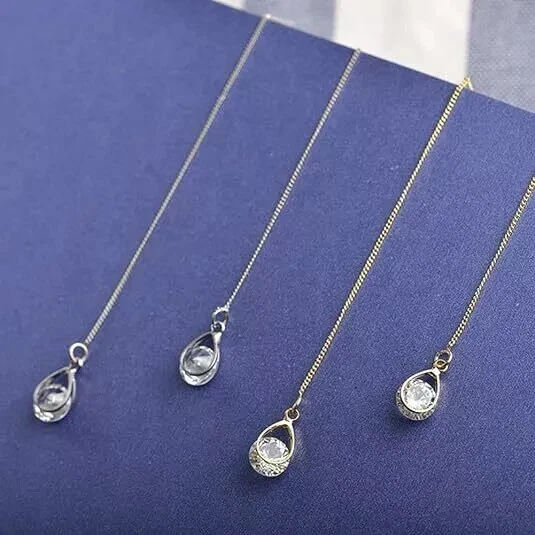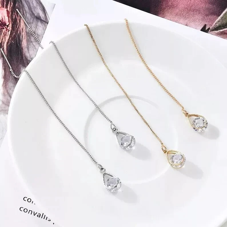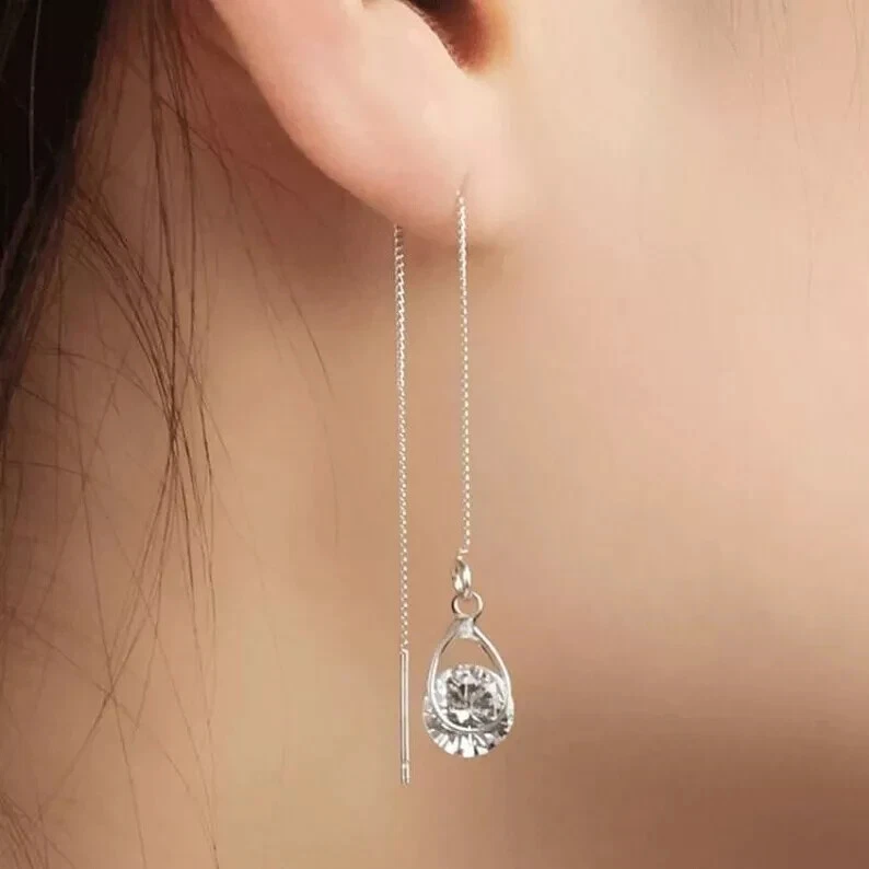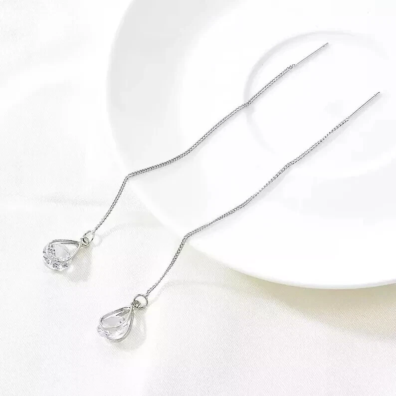 925 Silver Hot Long Chain Earrings Stud Threader Long Drop Tassel Crystal Dangle