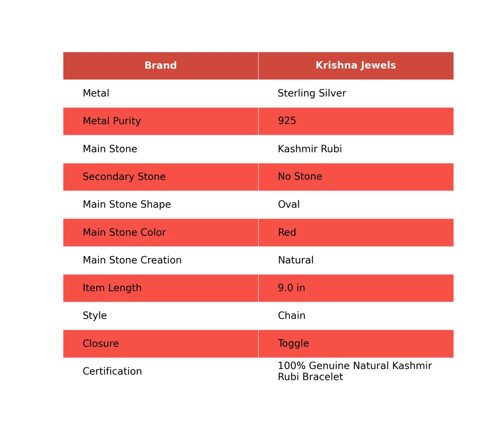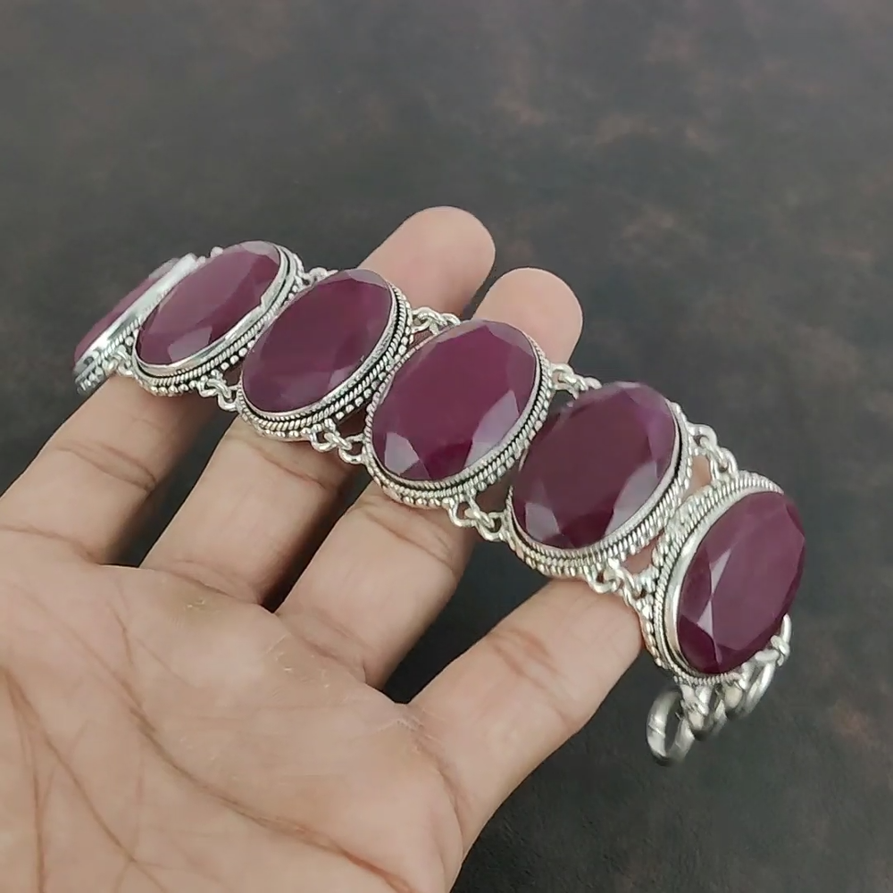 Note: Natural gemstones can vary slightly in design and color due to their unique formation. Welcome to KrishnaJewels123 Explore Our Handmade Sterling Silver Jewelry Collection Product Details: SKU: KKB-1372 Gemstone: Kashmir Rubi Stone Shape: Oval Metal Purity: 925 Sterling Silver Length: 9 Inches $ Width: Inches $ Sterling silver has long been cherished for its sophisticated charm and enduring quality. Valued for its elegance and versatility, sterling silver is a staple in jewelry design, offering a perfect balance of beauty and durability. Our sterling silver jewelry combines timeless appeal with modern craftsmanship. Known for its hypoallergenic qualities and resistance to tarnish, sterling silver enhances the natural brilliance of gemstones, creating a stunning, refined look. Ideal For: Mother’s Day Father’s Day Promises Valentine’s Day Halloween Celebrations Christmas Gifts New Year Festivities Gifts for Mom Gifts for Her Need more details or personalized advice? Don’t hesitate to reach out! We’re here to assist you promptly. Each piece at KrishnaJewels123 is handcrafted with care and passion. As experts in creating exquisite sterling silver jewelry, we take pride in our meticulous craftsmanship. Our collection features a diverse range of designs, each enhanced by genuine gemstones and created by our skilled artisans. Thank you for visiting KrishnaJewels123. We hope you find joy in exploring our collection and enjoy your shopping experience with us!