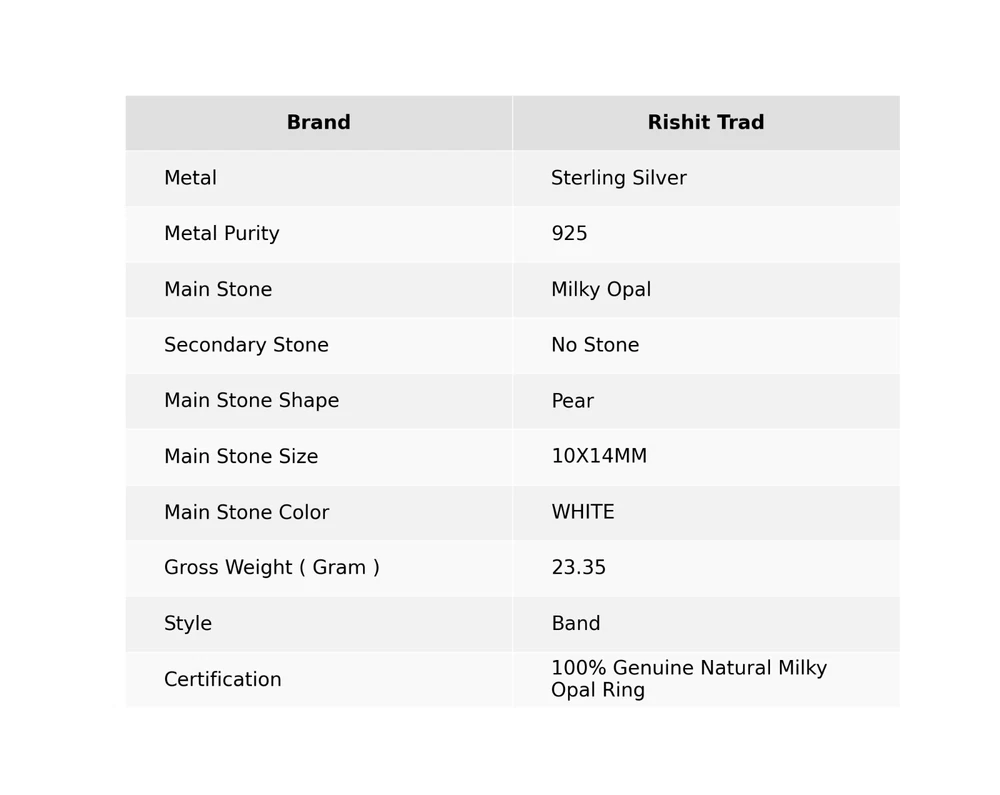 Add vivacity to your glamorous look by wearing this Rings by Rishit Trad. Featuring an ethnic handmade design, this Ring is embellished with Milky Opal for a more feminine effect. Wear these 925 Sterling Silver Ring with your best casual outfits to look iconic. ---------------------------------------------------- ------------ Welcome to Our Shop Rishittrad ---------------------------------------------------- ------------ Milky Opal Gemstone Band Ring Size 925 Sterling Silver For Women Description:- SKU : - RR-57-19 Metal : - Sterling Silver Metal Purity : - 925 Gemstone : - Milky Opal Gemstone Color : - WHITE Gemstone Shape : - Pear Gemstone Origin : - Setting : - Ring Size : - US ---------------------------------------------------- ------------ -------- ------------ Elegant Birthday Tribute:- Discover the essence of sophistication with our Birthday Radiance collection. Crafted with exquisite attention to detail, each piece embodies the timeless elegance and symbolic significance of birthdays. Craftsmanship Excellence:- Meticulously fashioned from premium 925 sterling silver, our jewelry pieces boast a classic and enduring design. The rich tones of natural gemstones complement the silver setting, creating a captivating harmony that resonates with wisdom and truth. Symbol of Personal Growth:- Gift with intention and meaning. Our Emblem of Wisdom pieces symbolize heartfelt wishes for personal growth and enlightenment on the recipient's special day, making it a cherished gesture of love and appreciation. Versatile Elegance:- Measuring at 1.2 inches, our creations seamlessly blend into any ensemble, offering both daily wearability and the ability to elevate sophisticated looks for special occasions. Their adaptable design ensures they become treasured additions to any jewelry collection. Thoughtful Expression of Love:- Surprise your beloved with a gift that transcends mere adornment. Our Natural Gemstone 925 Sterling Silver collection is a stylish and thoughtful token, exuding elegance and emotion while conveying warmest wishes with enduring grace. Exquisite Presentation:- Delight in the joy of gifting with our meticulously presented pieces, elegantly housed in an exquisite gift box. Make their birthday truly memorable by presenting them with a gift that captures the allure and timeless elegance of sterling silver. -------------------------- Image Policy----------------------------- All images are captured in natural lighting. The product showcased is the exact item you'll receive. -------------------------- Delivery Policy-------------------------- Standard Shipping typically takes 15-25 days, depending on your location. For expedited shipping, additional charges will apply. --------------------------- Product Policy--------------------------- You will receive the exact product depicted in the photos. All items are meticulously handcrafted. ------------------------------ Order Policy------------------------------ We welcome orders from around the globe. Custom orders are also accepted. Bulk orders are available upon request. Should you have any queries about our products, please don't hesitate to reach out. Upon receiving your product, we'd appreciate your feedback. ⋆⋆✦✧✦⋆⋆⋆⋆✦✧✦⋆⋆⋆⋆✦✧✦⋆⋆⋆⋆✦✧✦⋆⋆⋆⋆✦✧✦⋆⋆⋆⋆✦✧✦⋆⋆⋆⋆✦✧✦⋆⋆ "Discover a captivating collection of handcrafted gemstone jewelry at our boutique." https://www.ebay.com/str/rishittrad0 ♥ Thank you for choosing us ♥