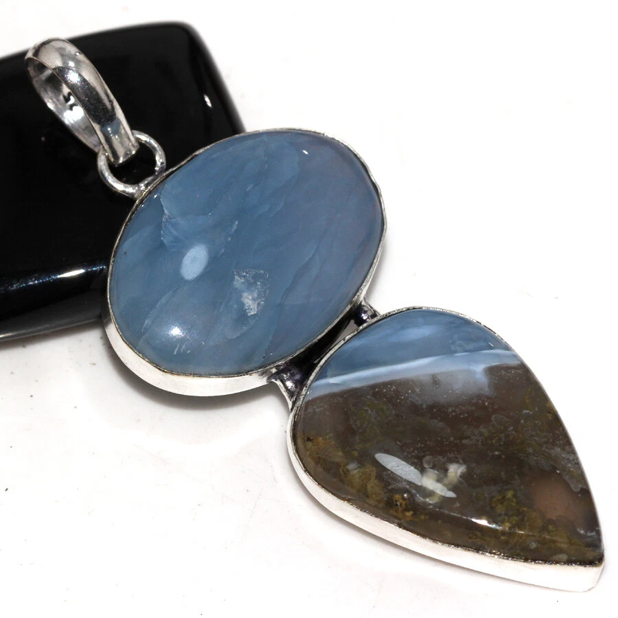 925 Silver Plated Owhyee Blue Opal Ethnic Long Pendant Jewelry Size 2.6" JW