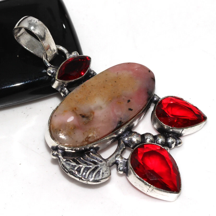 925 Silver Plated Peruvian Pink Opal Garnet Long Pendant Jewelry Size 2.1" JW