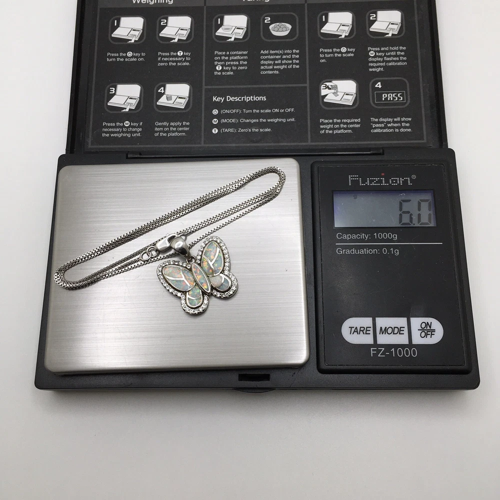 925 Sterling Silver 1” White Fire Opal Butterfly Pendant Necklace 18" #1810 Unknown origin of stones. Could be lab created. Hand polished. Previously owned. Measuring Tools & display not included. Combined Shipping! 1st item $4.59, each additional item is $1. Max shipping cost $10. Combine shipping for up to 7 days! We value YOU! Items are returnable and fully refundable! SilverSchark began as a hobby that grew into a business. We take old retired sterling silver jewelry and revitalize it to wearable condition. Utilizing an ultrasonic machine with sterling silver solution most items are restored to their original beauty. Occasionally scratches are buffed out and some minor repairs are made to bring these tired pieces back to life. Diamonds are always tested. If a piece is not stamped or is suspected of not being sterling silver, the item is acid tested for confirmation. Tests will always be listed in the description. We understand that patina is desired on vintage or antique items so some of the listings will not be cleaned and polished. The description of each listing will tell its tale of restoration. Combined shipping is always welcome! Just ask for an invoice if your cart doesn't look correct. Max shipping cost is $10 per shipment regardless of number of items!