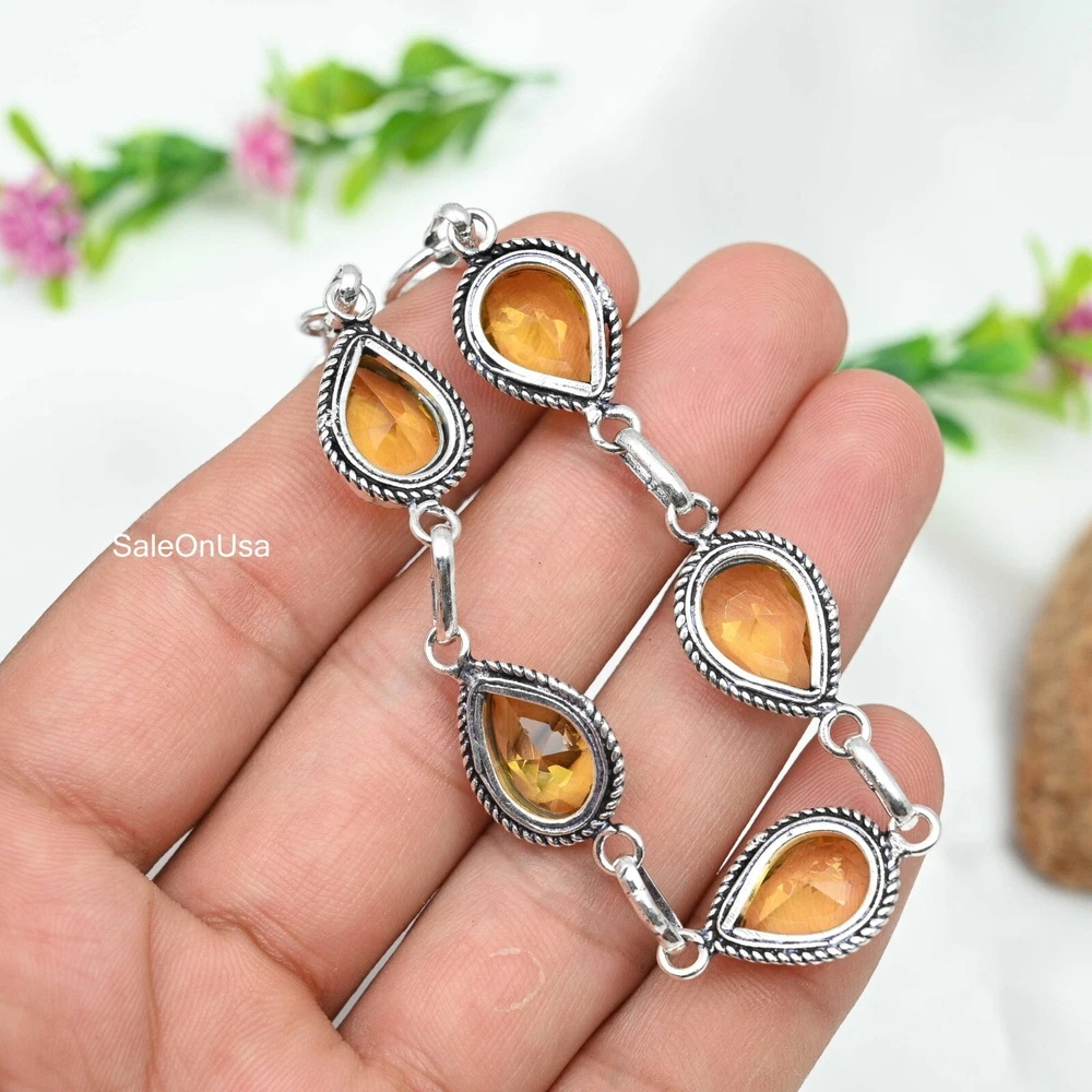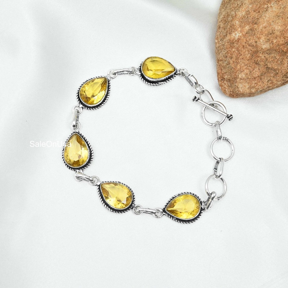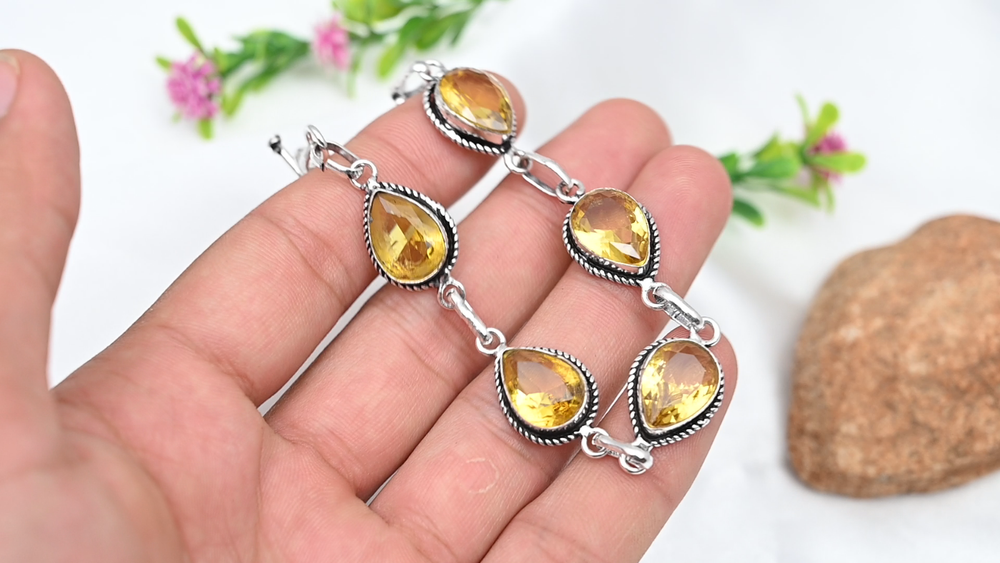 Main Stone Depth:N/ABase Metal:Sterling SilverItem Length:8 inches with Adjustable ChainFeatures:AdjustableMain Stone Color:YellowNumber of Gemstones:5Main Stone Treatment:Not EnhancedCut Grade:ExcellentClosure:ToggleMetal:Sterling SilverTotal Carat Weight:10 carat and aboveColored Diamond Intensity:N/AChain Type:N/AColor:SilverBrand:HandmadeMain Stone:CitrineCertification:N/ASecondary Stone:CitrineStyle:ChainShape:Same As PictureDiamond Color Grade:N/ASetting Style:BezelCharm Type:Same As PictureCountry/Region of Manufacture:IndiaMain Stone Creation:Lab-CreatedMain Stone Width:N/AMain Stone Shape:PearCollection:HandmadeMetal Purity:925Country of Origin:IndiaMaterial:GemstoneMain Stone Length:N/AOccasion:Anniversary, Birthday, Christmas, Engagement, Mother's Day, Valentine's Day, WeddingDiamond Clarity Grade:N/ATheme:Beauty, Bohemian, Ethnic, Halloween, LoveType:BraceletNumber of Diamonds:N/A