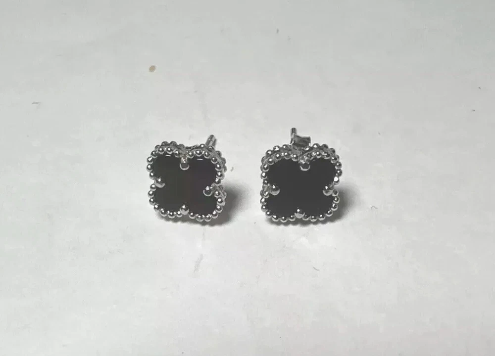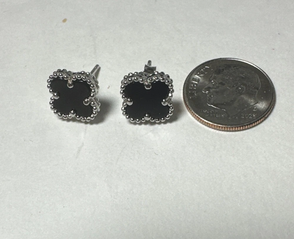 These are small 925 Sterling Silver Clover Stud Earrings with a butterfly closure. The earrings are black in color and have a stylish stud design. Earrings are size small which are a little bigger than the mini clover.