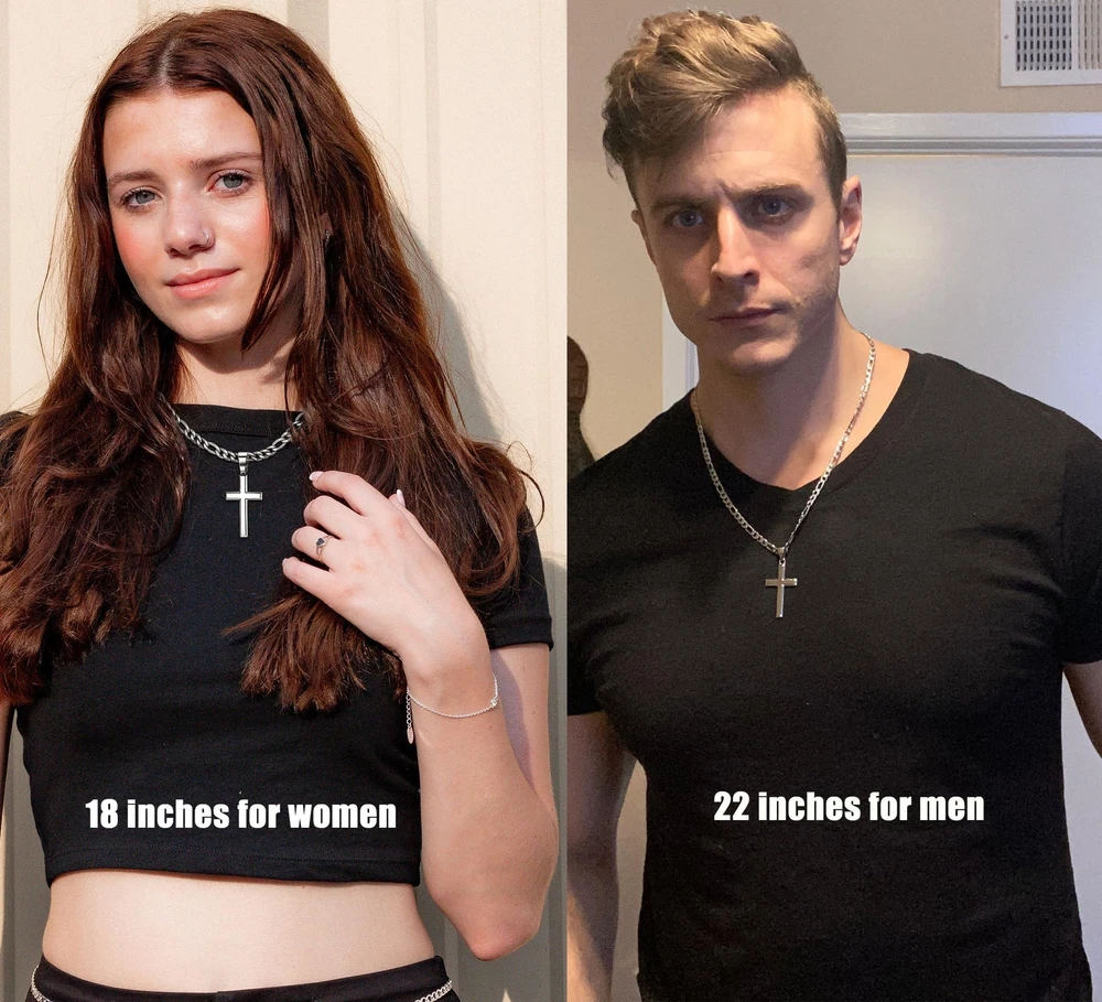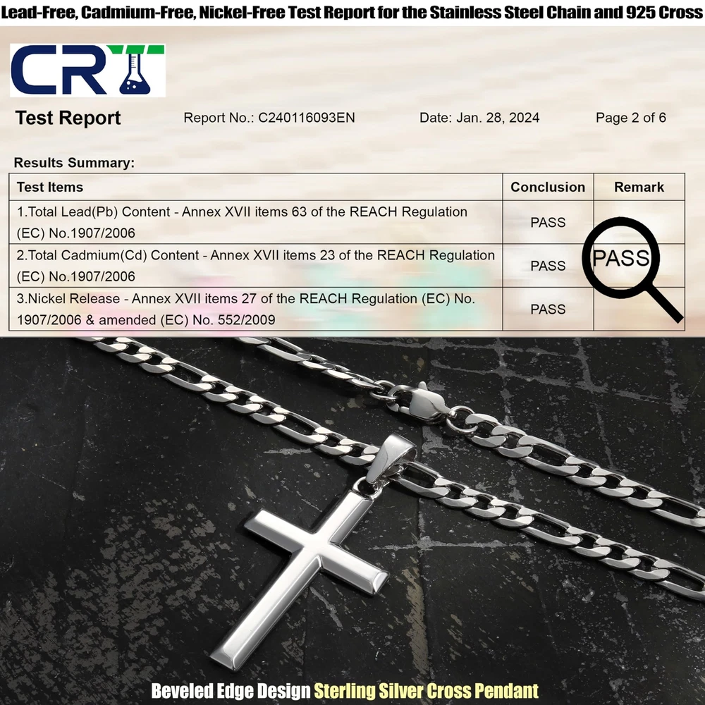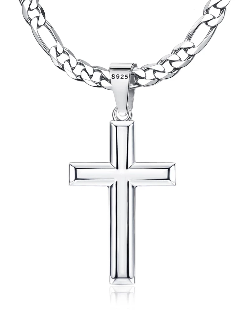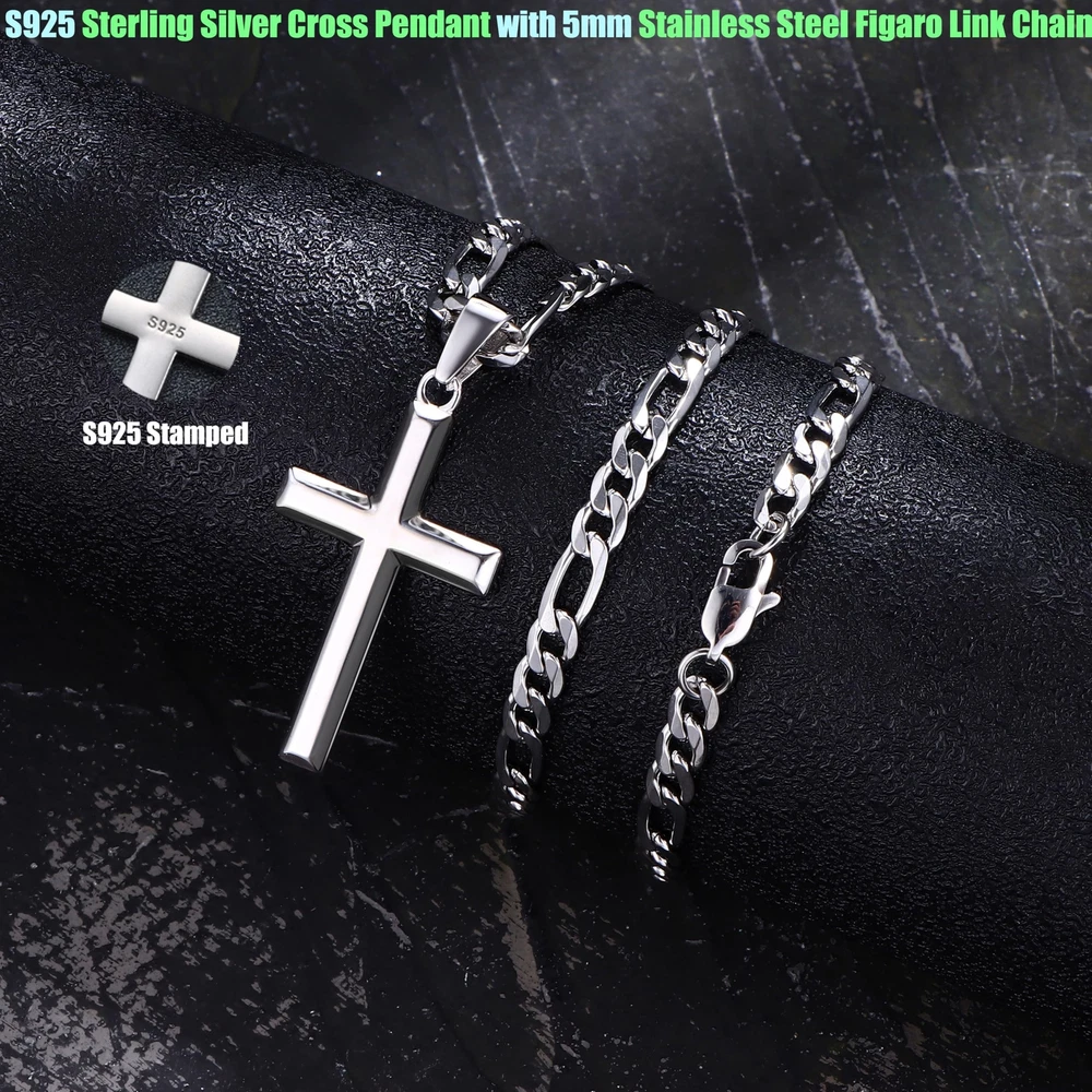 Built to Last : You will get a solid s925 sterling silver cross pendant, a durable stainless steel figaro chain, both packaged with exquisite gift box, choose it as your fashion silver men necklace or silver chain for men. This silver cross chain offers durability and shine that lasts making it perfect for everyday wear and special occasions Pure 925 Sterling Silver Cross : Beveled edge cross pendant crafted of pure 925 sterling silver with a plating of 18k white gold to increase shine, luster and durability, more scratch resistant and less prone to tarnishing, authenticated with a 925 stamped on the back. Precious material and cross's meaning formed a people who strongly value belief and faith. Sterling Silver Cross Pendant for Men Women 316L Stainless Steel Chain : Figaro link chain was made of surgical steel, nickel and lead free, hypoallergenic for sensitive skin. It adopts diamond cut craft, polished hand by hand, match well with the cross pendant. Wear alone with casual or formal attire for everyday modern elegance, with your favorite pendant or charm for a personal statement or as a great layering chain. Modern Classic Necklace for Men Silver Cross Chain Size : Sterling silver cross pendant height: 1.57in(40mm), width: 0.98in(25mm). 3/16" wide(5mm) silver figaro chain in 16 to 30 inches chain length. Strong and smooth edge silver cross necklace with flexible long lobster-claw clasp, easy to use. Sterling silver cross chain with cool elegance for those who value beautiful and stylish cross necklace jewelry. Please Chose Right Size Cross Necklace Meaning : The cross symbolizes faith, love and redemption, show your deeply religious emotion to Jesus, to God, and to lover with this handcrafted 925 sterling silver cross pendant necklace. Wear the cross necklace as a symbol of your faith or as a daily jewelry parts, for timeless elegance and a stylish vibe, perfect cross necklace for men women wear. Give You Stronger Power of Faith Gift Box Included : Silver cross necklace was shipped in an elegant gift box, great gift for anniversary, birthday, wedding, graduation, Christmas, Father’s Day, Mother’s Day, Valentine’s Day. offer high quality affordable sterling silver cross necklace for men and women. Allow bathing, sleeping, running, working. 180-days quality after sales customer service