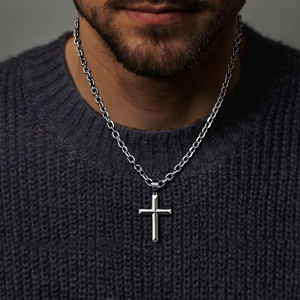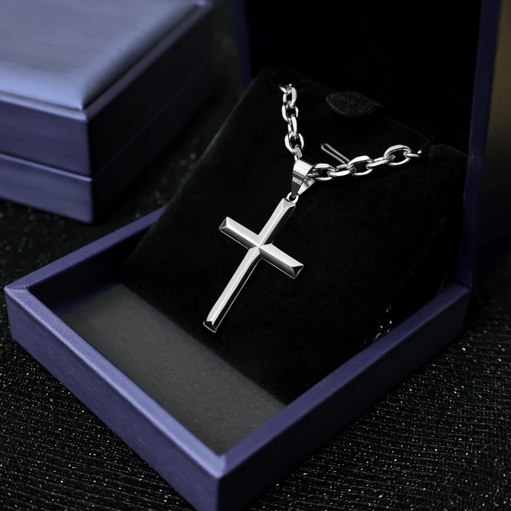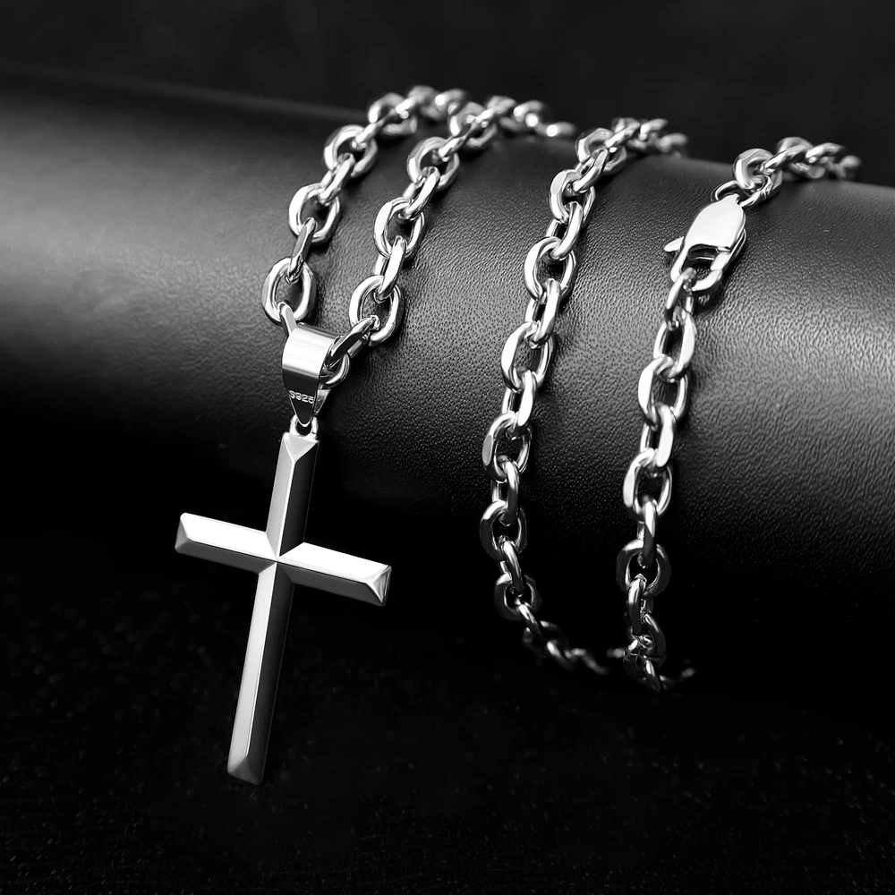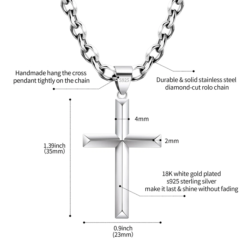 MATERIAL UPGRADES:The sterling silver cross pendant is plated with 18K white gold, the chain is polished, the buckle is upgraded to a lobster clasp, and it is packaged in a gift box, making it very suitable as a gift. MATERIAL: 925 sterling silver beveled edge cross pendant with stainless steel rolo chain..hypoallergenic, nickel free and lead free,comfortable to wear, you don't have to take it off even when you sleep. CLASSIC:The beveled edge treatment is added to the classic style, the edges and corners are more distinct, and the highly polished process fully reflects the bravery and faith. whether wear alone or match with your favorite pendant, show your charm all the time. SIZE:Polished cross pendant length 1.39 inche(35mm), width 0.9 inche(23mm).rolo chain necklace length 18 inche(46cm). strong and smooth edge silver cross necklace with flexible lobster-claw clasp, easy to use. GIFT:Come with a beautiful gift box and a polishing cloth to keep your necklace smooth and shiny all the time.perfect minimalist fashion jewelry for birthday gifts, valentines day gifts, christmas gifts, faith cross necklace, baptism gifts. AFTER SALES SERVICE:We provide 100% satisfaction and money back guarantee.if you have any questions after receiving the goods, you can contact us,we will reply you within 24 hours and give you a satisfactory answer.