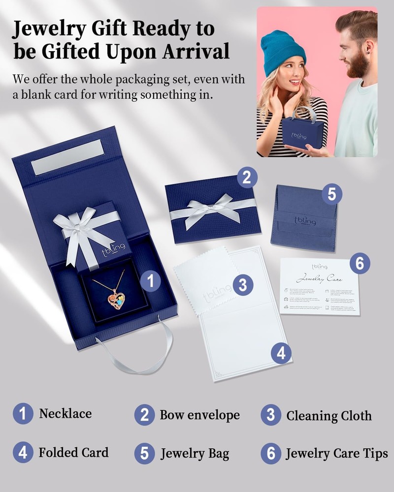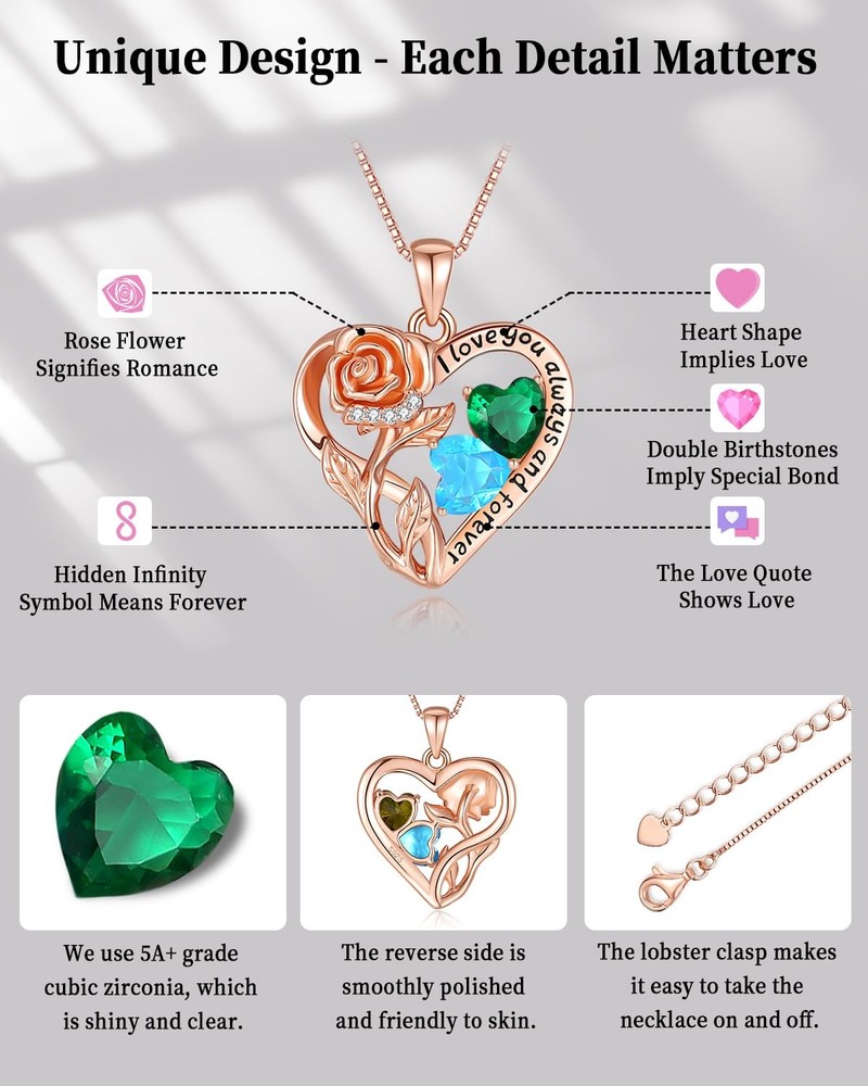 The Women's Double Birthstone Rose Flower Heart Pendant Necklace combines s925 sterling silver material, distinctive style, double birthstones, love forever quote, and a gift packaging set. Its heart design makes it a standout jewelry gift for loved ones. 【 Infinity Rose Flower Heart Necklace】This is a beautiful heart pendant within a rose in the upper left hand side and a heart shaped cz birthstone in the mid and lower right hand side. The necklace has an almost hidden infinity sign between the rose and the heart. It is also engraved with the love quote "I love you always and forever", being great birthday gifts for adult woman. 【Necklace with Two Birthstones - More Personal】Birthstones promise peace, luck to the wearer. For this piece of jewelry, you may choose two gemstones to symbolize your birth months and your loved ones. The 12 gemstones are garnet, amethyst, aquamarine, diamond, emerald, alexandrite, ruby, peridot, sapphire, tourmaline, citrine, and turquoise. 【Jewelry Gifts for Her with Exquisite Packaging】The diamond necklace for wife arrives in a custom blue box, including a matching bow envelope, a folded card, a jewelry bag, a silver cleaning cloth, and jewelry care tips card. Such packaging set is ready to be given upon arrival. 【925 Sterling Silver Womens Necklaces】The sterling silver metal provides a classy and polished look, while also ensuring durablitity and comfort. The jewelry necklace for wife is plated with rose gold rhodium layer, which is hypoallergenic and won't cause skin issues. The pendant necklace for woman comes with a classy 16''+2'' box chain. 【Necklace Gift for Women for Any Occasion】The rose gold necklace would be a sweet i love you gift for Mother's Day, birthdays, anniversaries, Valentines Day, wedding, christmas day, Anniversary day, Thansgiving, Easter. This charming womens necklace would make a sweet love gift for her like wife, sister, girlfriend, mom, grandma, etc.