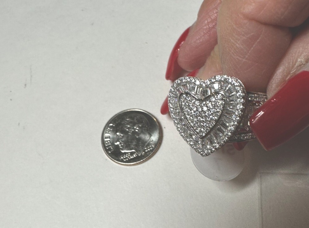 This is a women's 925 sterling silver ring featuring heart-shaped cubic zirconia stones with icy bling. The rings are in size 7 and have a silver color with a sterling silver metal composition. Ring has two rows of CZ baguettes around the heart and on both sides of ring.