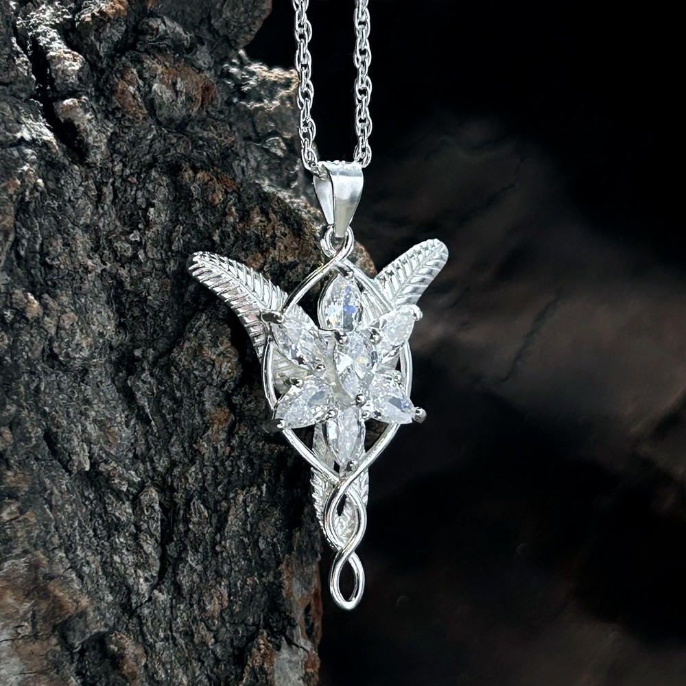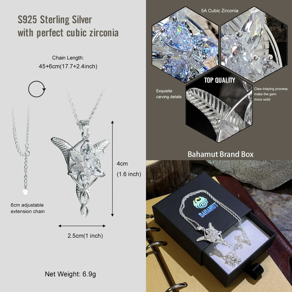 ✦【Meaning】The Elven princess Arwen, eternal beauty and life, like the eternal star, is called Evenstar. ✦【Craft】Capture the brilliance of the Evenstar's enduring beauty. Based on the actual pendant worn in the LOTR this piece is crafted in sterling silver.The solid 5A Cubic Zirconia gem is shining. ✦【Meaning】The Elven princess Arwen, eternal beauty and life, like the eternal star, is called Evenstar. ✦【Craft】Capture the brilliance of the Evenstar's enduring beauty. Based on the actual pendant worn in the LOTR this piece is crafted in sterling silver.The solid 5A Cubic Zirconia gem is shining. ✦【Size】Pendant:25x40mm(1x1.6inch) Chain Length :45+6cm(17.7+2.4inch) Net Weight: 6.9g ✦【Gift】This silver necklace perfect for any gift giving occasion, Birthday, Christmas, Thanksgiving, Graduation, Anniversary, Valentine’s Day, Mother’s Day, Wedding or any special private occasion. as a gift for women,teen,wife, fiancee, mother, daughter, girlfriend, sister, friends and business partner etc.