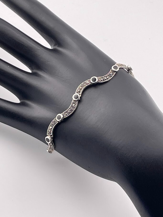 925 STERLING SILVER MARCASITE BLACK ONYX WAVY BRACELET 7.5" DECO STYLE 2542 ****************************** Thank you for your interest in our jewelry. We?d like to introduce ourselves. We are just a retired couple who love matching our customers with great jewelry. We?re not professional jewelers. To have the best shopping experience we like to recommend the following: Please measure your hand, wrist, finger or neck to ensure the best fit. We can use your measurements to help with sizing. Please ask all the questions you want. We know some stuff and, if we don?t, we?ll do the research. We like to learn too. More Stuff: If an item is described as ?gold over 925 sterling silver? this means it is gold vermeil. Vermeil is the process by which a layer of gold (usually 14k or 18k) is bonded to sterling silver. We only clean with gentle soap and warm water to avoid damage. The items we sell may be new or pre-owned and may have normal wear, slight damage, and/or tarnish. We make every effort to ensure the items we sell are as described. This includes testing to confirm metal purity if the item isn?t marked, and testing for gemstone identity. We try to put measurements in the jewelry description and include a photo of each piece with a U.S. quarter (25mm).