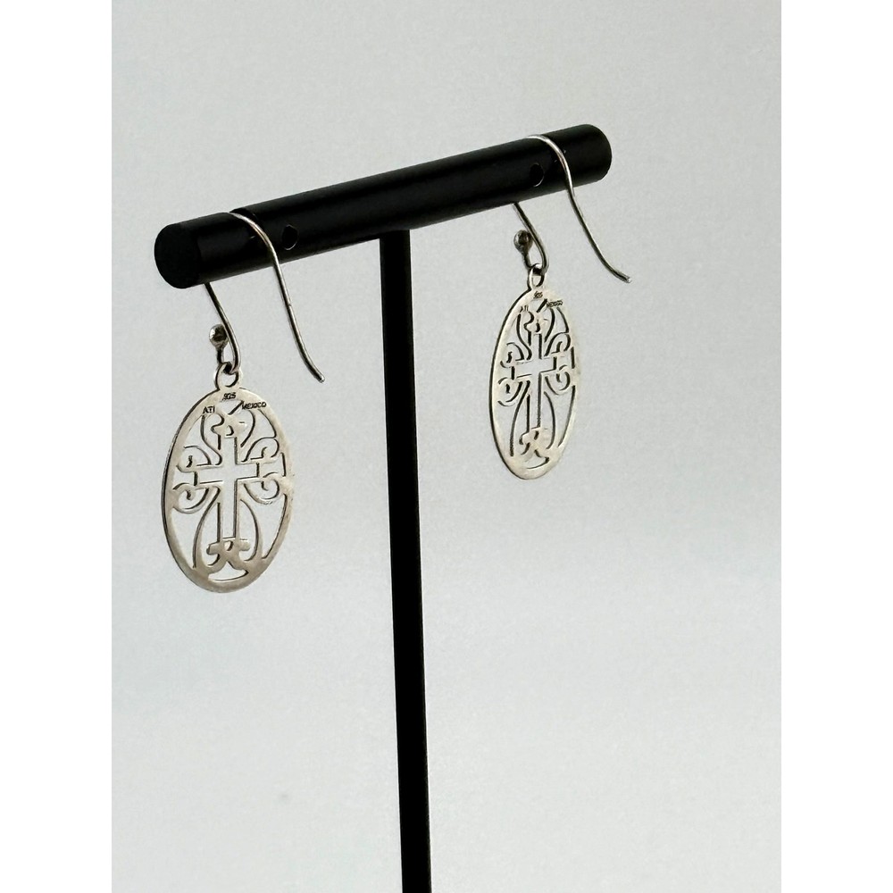 Beautiful earrings measure 0.9 inches in length and 0.5 inches wide. Fancy cross design and stamped '925'. Look simple and also elegant when paired with studs or with any outfit.