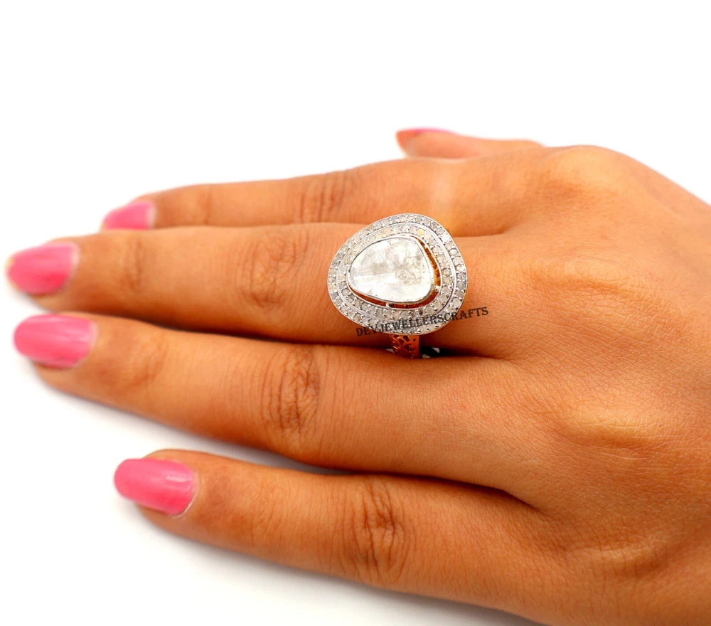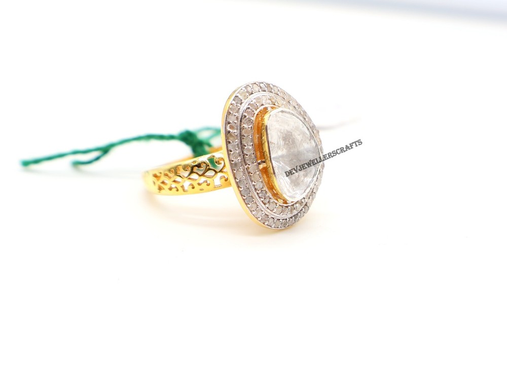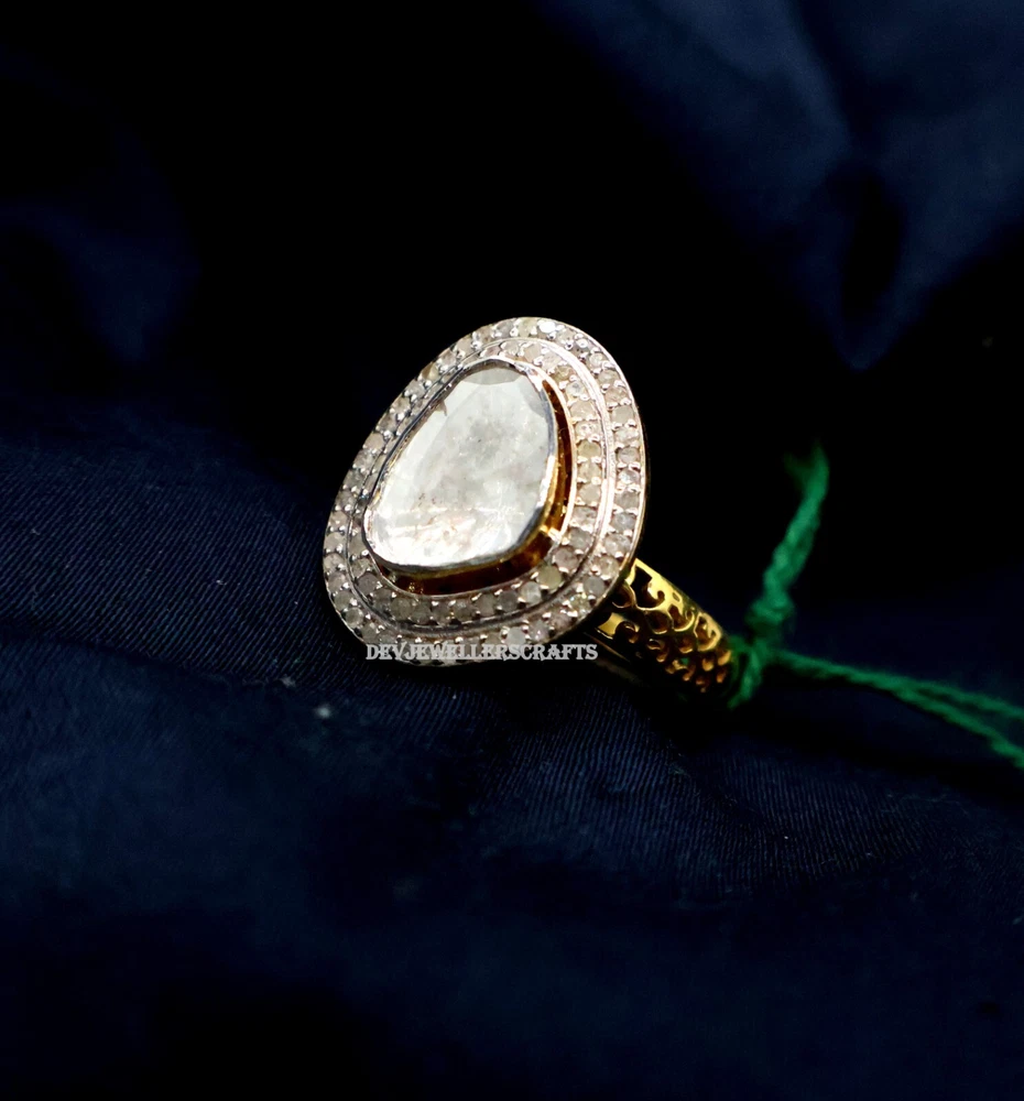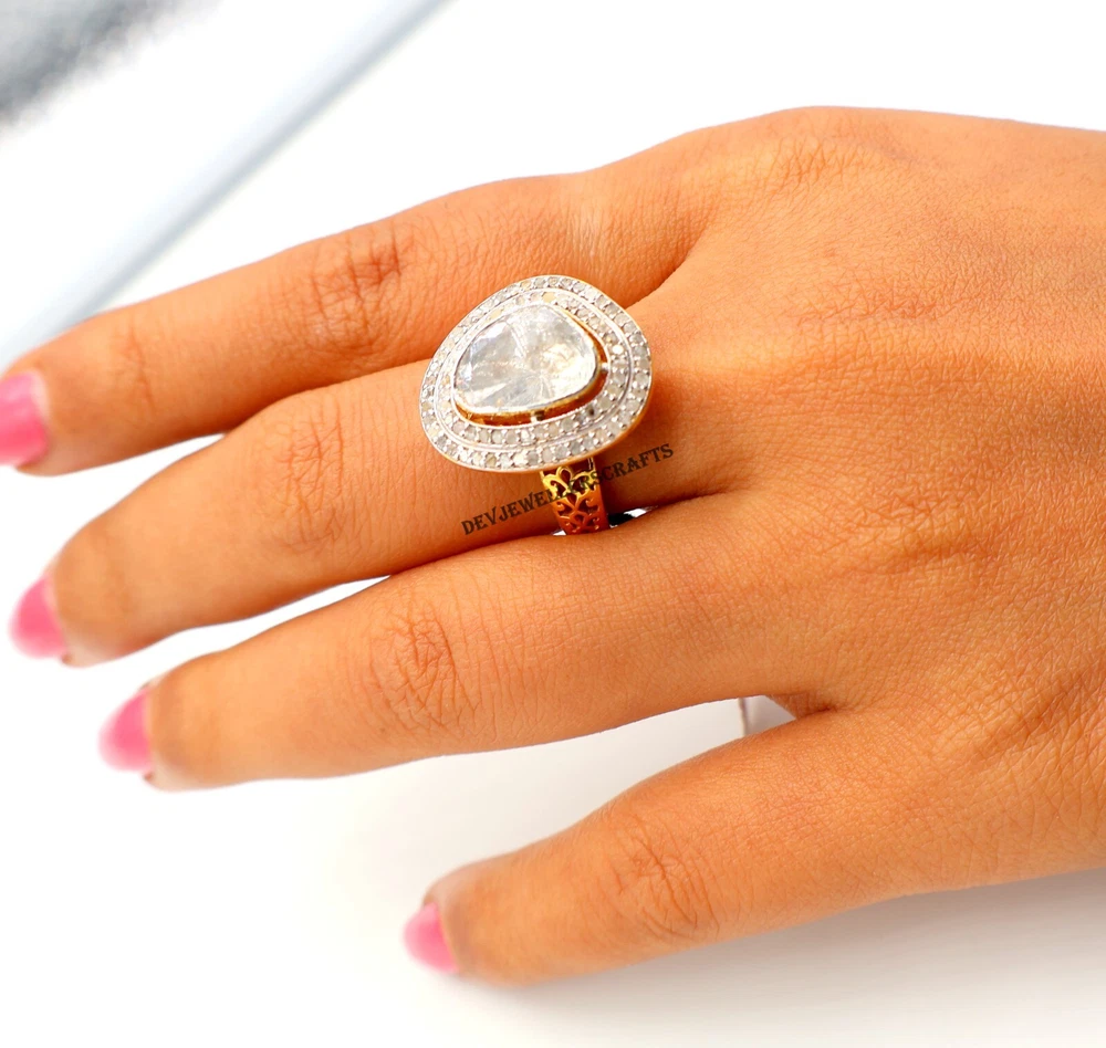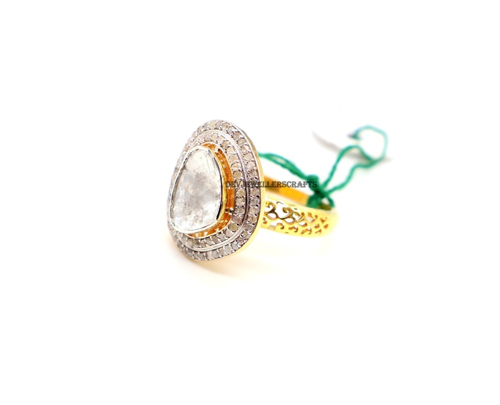 925 Sterling Silver Rose Cut Polki Diamond Gold Plated Cocktail Ring with Pave Detail