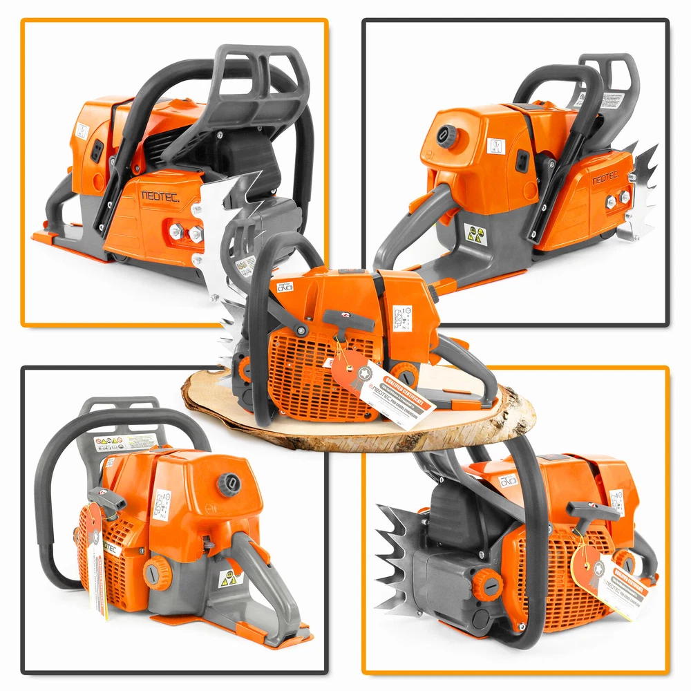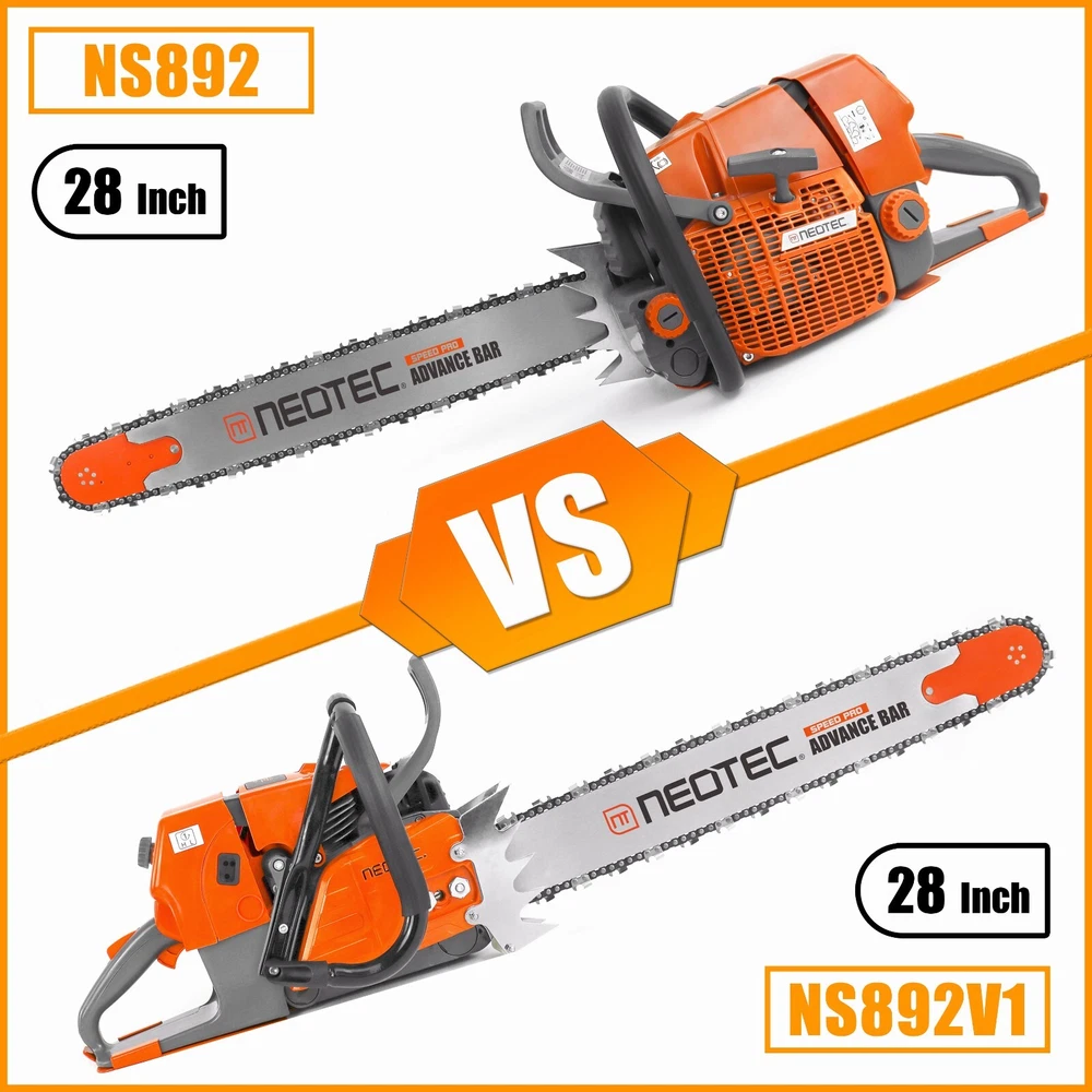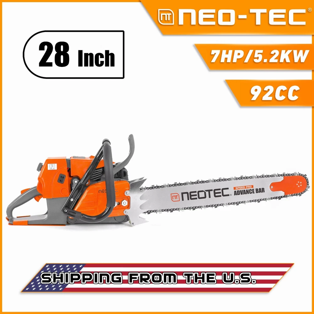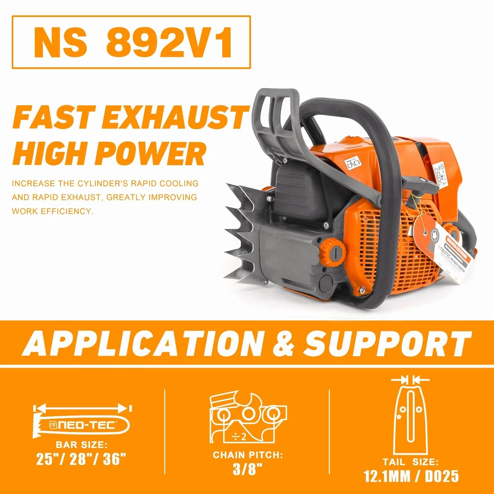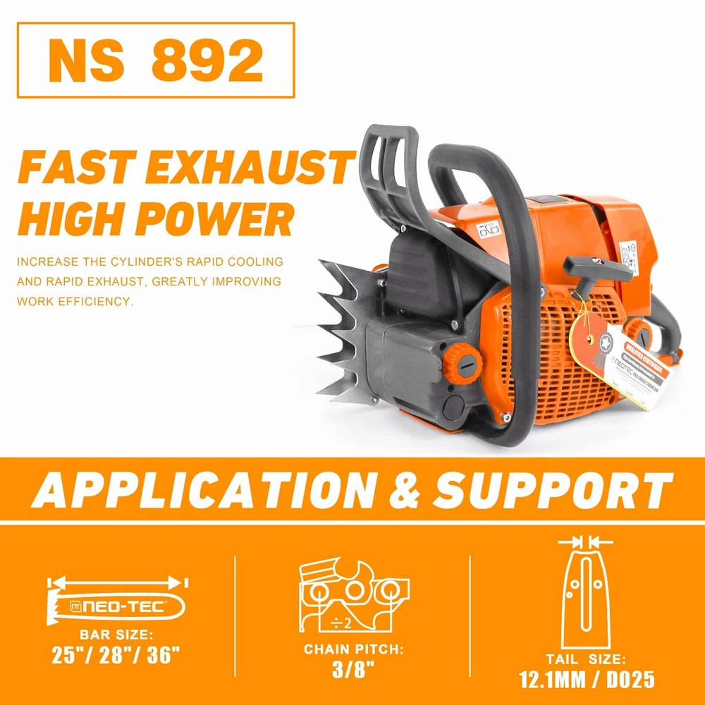 NS892 series 92cc Gas Chainsaw with 28'' Guide Bar Chain.The Power head and Bar Combo are two separate parcels. PRO Commercial 92cc Gas Chain Saw NEO-TEC pro gas chain saw power head NS892 fit for G660, all parts are compatible with MS660 066. 92 cc working power 5.2kw 7 HP Ideal for Big Wood Cut with Handle Bar NS892 chain saw fit for 25/28/36/42 inch guide bar which cuts through the woods or falling tree quickly and easier. Package Included 1PC Chainsaw Power Head 92CC 1PC Guide Bar Cover/Gloves 1PC Handle Tank Guard Protection Plate 1PC Tool Kit/Fuel Oil Mixing Bottle 1PC Instruction Manual 1PC Glasses/Earmuff Accessories It come with many accessories. Power: 5.2 KW Equipped with 3/8 Rim Sprocket Compatible with Up to 42 Inch Bar and Chain Engine Oil Selection Power Head Weight: 8.14 kg Country/Region : China Gasoline Ration: 35:1 Fuel Tank: 825 ml Engine oil Tank: 360 ml Assembled with High Quality Parts Chrome-Plated Cylinder HLHIC Carburetor Taiwan Crankshaft Torch Spark Plug Supper Power Igniton Coil Magnesium Crankcase,Starter,Sprocket Choosing The Right Guide Bar