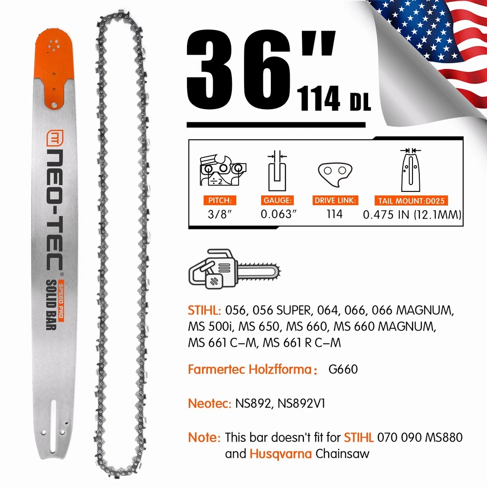 Neotec NS892V1 92cc Chainsaw with 36'' Guide Bar Chain.The Power head and Bar Combo are two separate parcels. PRO Commercial 92cc Gas Chain Saw NEO-TEC PRO Gas Chain Saw Power Head With Upgrade Handle Bar NS892V1 Fit For MS 660, All parts compatible with MS 660 066. 92 cc Working Power 5.2 kw 7 HP Ideal for Big Wood Cut with Plus Handle Bar NS892V1 Chain saw Fit For 25/28/36 Inch Guide Bar which cuts through the woods or falling tree quickly and easier. 1PC Chainsaw Power Head 92CC 1PC Guide Bar Cover/Gloves 1PC Handle Tank Guard Protection Plate 1PC Tool Kit/Fuel Oil Mixing Bottle 1PC Instruction Manual 1PC Glasses/Earmuff Choosing The Right Bar.