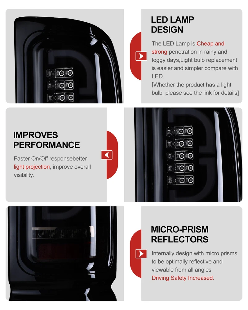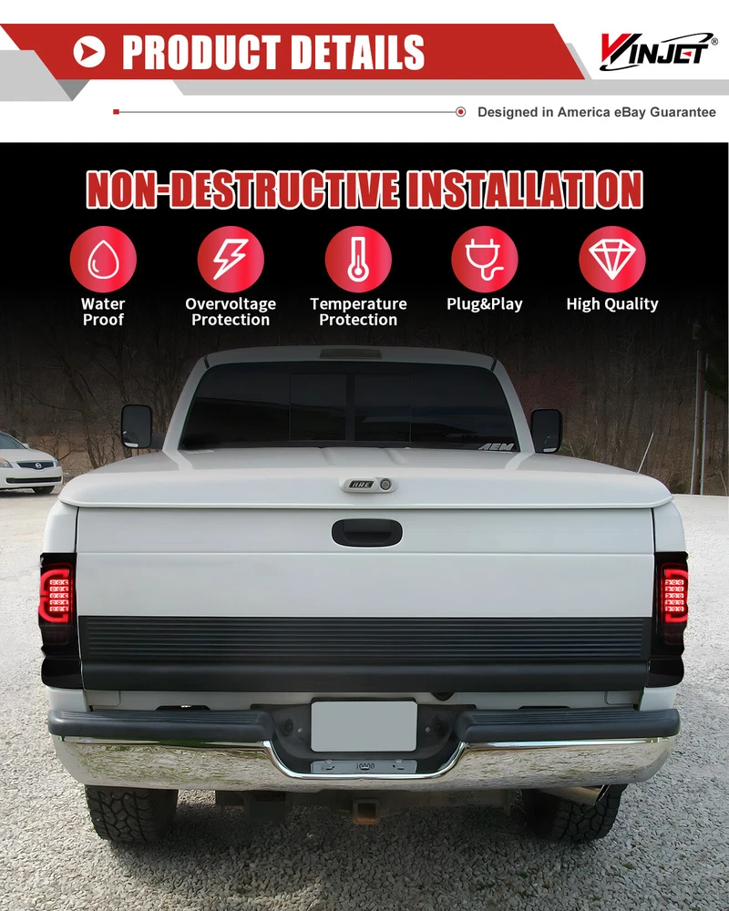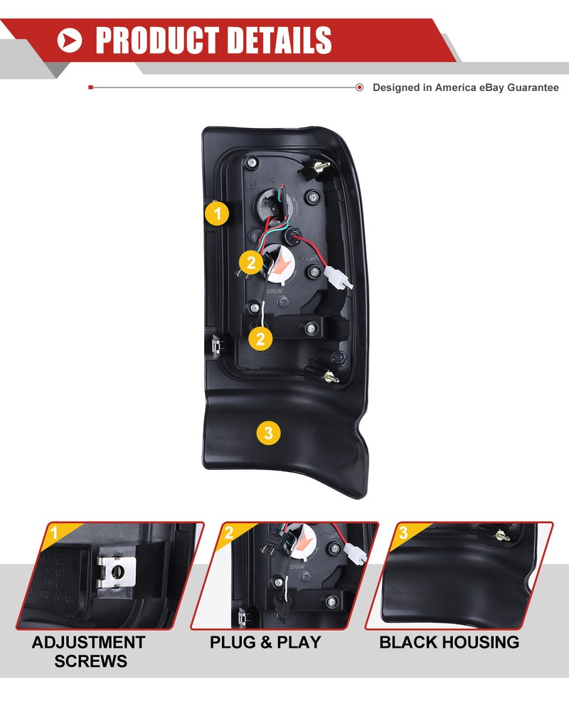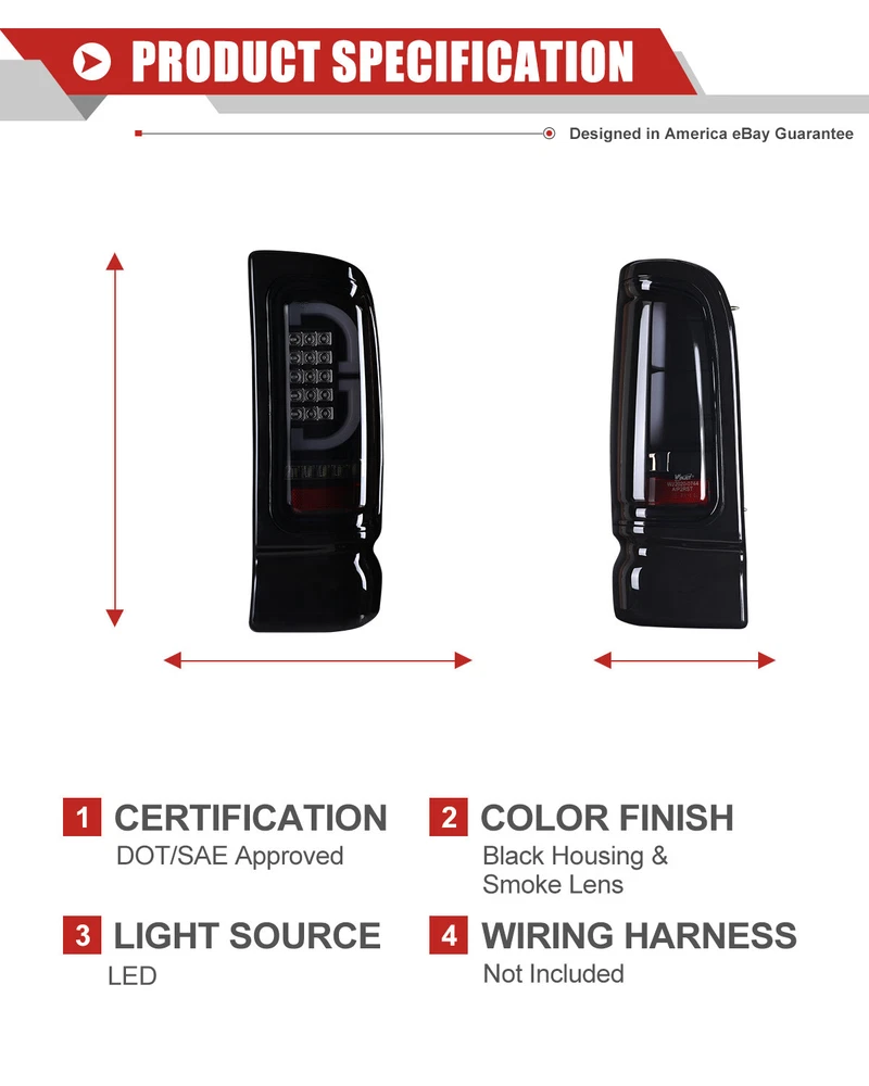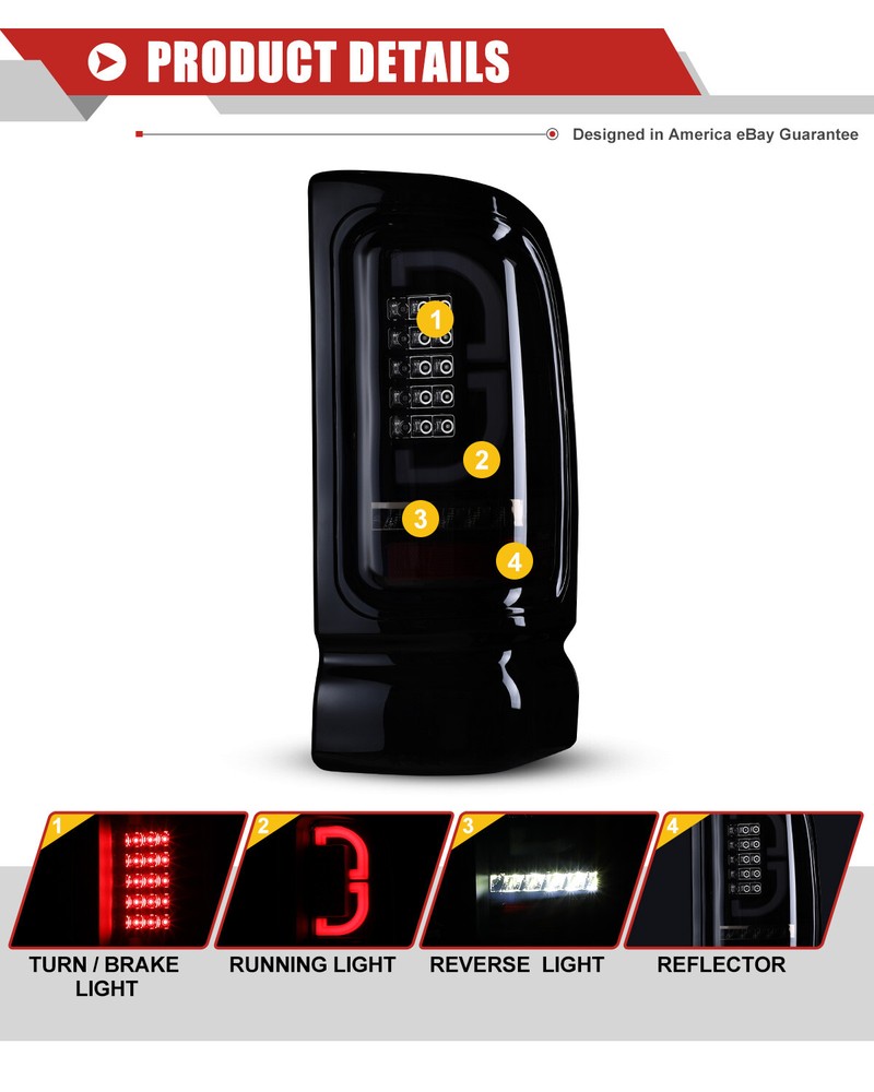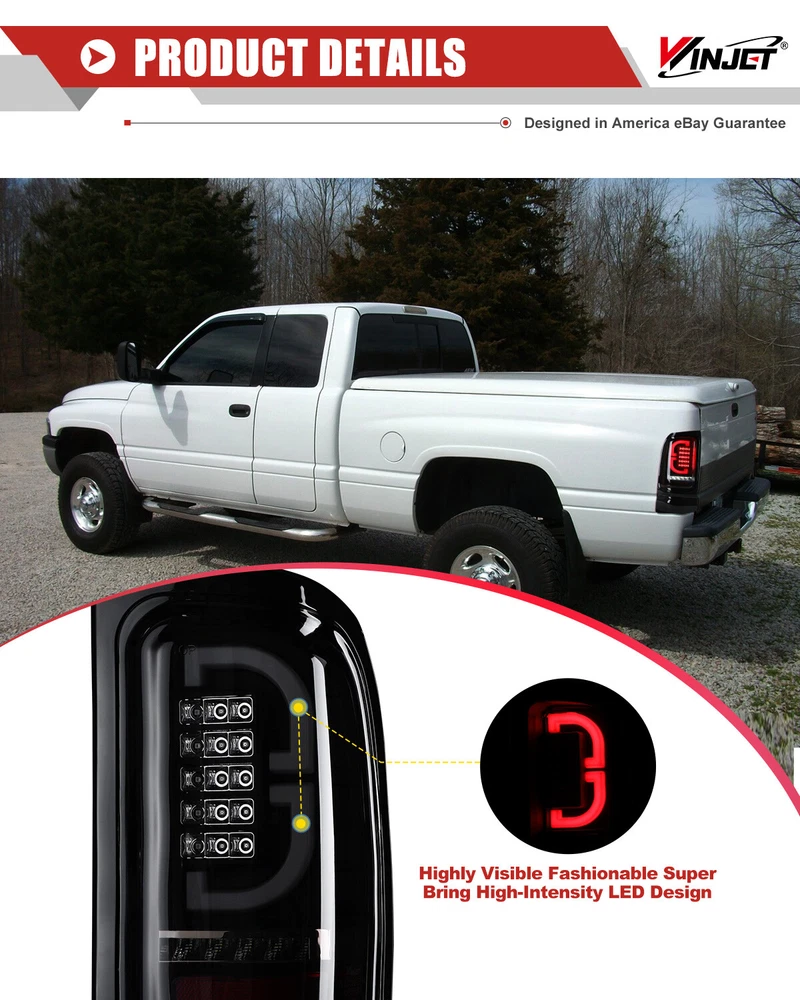LED Tail Lights For 1994-2001 Dodge Ram 1500 2500 3500 Black Smoked Brake Lamps Fitment: 1994-2001 Dodge Ram 1500 Pickup 1994-2002 Dodge Ram 2500 Pickup 1994-2002 Dodge Ram 3500 Pickup Specification: Lens Color: Smoke Lens Housing Color: Black Housing Certification: DOT / SAE Compliance Material:PMMA(OEM Grade) Color Finish: Black Housing / Smoke Lens / Chrome Reflector Repalce OEM Number: L: 55055265AC R: 55055264AC Partslink Number: L: CH2801122 R: CH2800122 Package Includes: 1 Pair of LED Tail Lights(Driver(Left) & Passenger(Right) Side) Payment Delivery details Terms of sales About us Contact us Payment 🤟 We accept PayPal (Recommended), credit card, VISA, Google Pay & Discover etc. 🤟 Please submit your payment within 7 days after your purchase. 🤟 If not, eBay will automatically open an Unpaid Item Dispute on our behalf if the item(s) are not paid within 7 days. Delivery details 🤟 Please double check your delivery address and contact information. 🤟 All items will be shipped within 1 business days after payment received. 🤟 Tracking numbers will be easily accessible ASAP they are created and processed. Terms of sales 🤟 Free 60 days Return, we will cover the return post fee. 🤟 If a defective product was received, please do not hesitate to message us via eBay message. 🤟 We will response in 24 hours in business to resolve the problem 🤟 We stand behind our products. Items can be returned for exchange or full refund within 60 days from the date you receive. About us 🤟 Winjet has a huge warehouse and office located in the United States. 🤟 All US domestic 48 states customers are able to benefit from the FREE SHIPPING services. 🤟 Our experienced, professional customer service representatives offers prompt and courteous service. 🤟 Best quality products, outstanding services and professional experience keep our customers. Contact us 🤟 Please feel free to contact us if you have any problems. 🤟 Emails will be replied within 24 hours in working days. 🤟 After hours emails will be replied on the next business day.