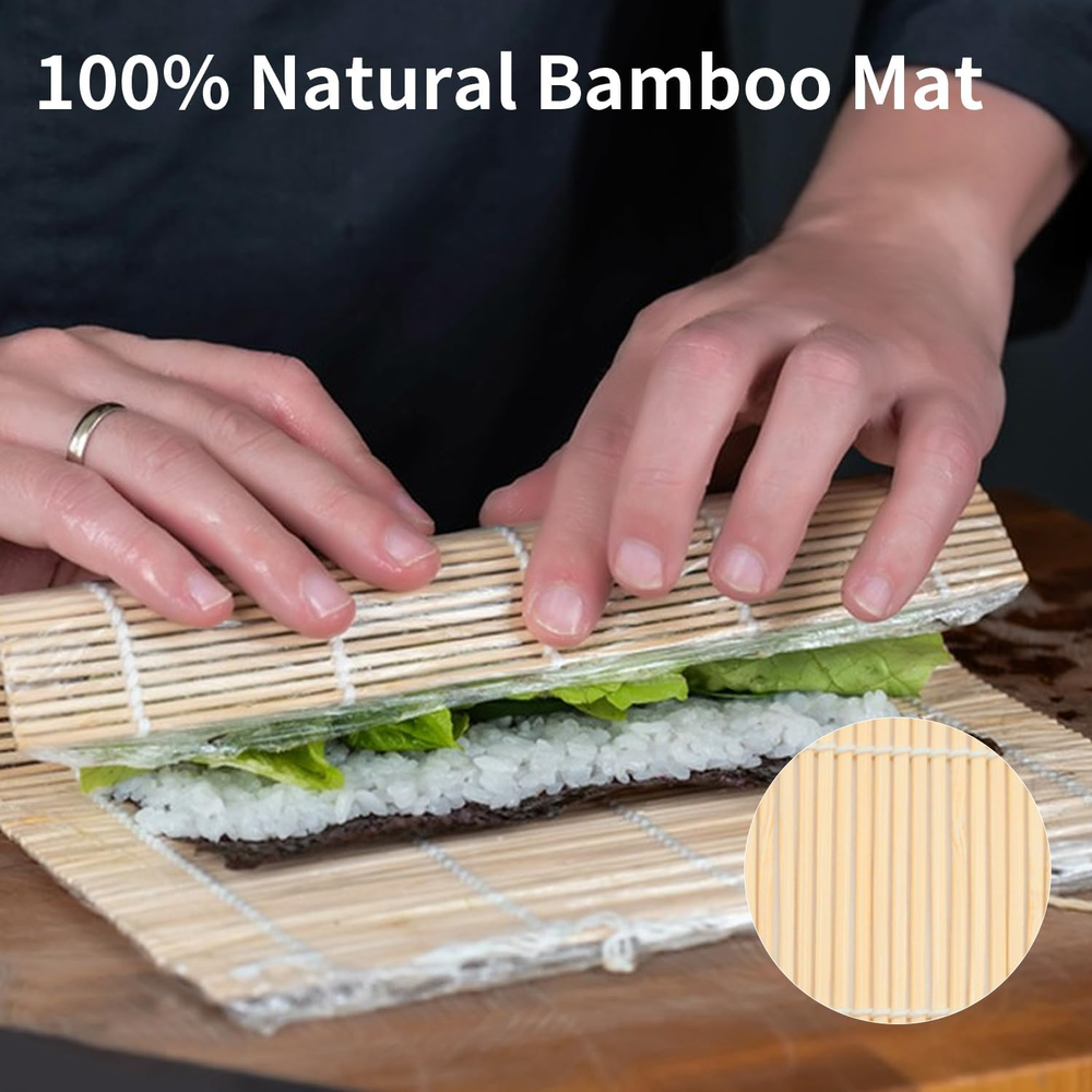 Top quality is guaranteed- crafted exceptionally well. Made of high quality bamboo material, lightweight, durable, all natural, no chemicals and glues. Size: 9.5" x 9.5". Each sushi mats bamboo is made from woven with cotton string, there are no splinters and no unraveling of the cotton string stitching. To extend the lifetime of this product, please make sure it is completely dry after use but don't expose it to high heat. No extra tools are needed, just add rice or other vegetables in the sushi mat, then roll it, and you will get your favorite sushi roll, non stick, easy to use, easy to operate for housewives or beginners. Hosting a sushi party is a fun, hands-on culinary experience that your guests will never forget! You can also cook sushi rolls with your children. It'll teach your kids something new, and develop the fine motor skills of their hands. A great chance to present to your friends or loved ones with something special. Sushi-making is a new experience, one that everyone should try. A compact, unique and useful gift that makes your friends always be cherished! Product Description Safe Material Each sushi roller is made of premium bamboo. The bamboo is renewable source, durable, all-natural, no chemicals or glues Easy to Use No extra tools are needed, just sushi mats can be used to make sushi, saving your money. Perfect for Beginners Making the sushi was very easy, the kit includes everything you need. It also came with a set of bamboo chopsticks which I felt was a nice touch. How to Make a Sushi Roll? Step 1 Spread a strip of plastic wrap over the bamboo mat.Then place a sheet of nori on the plastic wrap. Step 2 Wet your fingers and spread the sticky sushi rice over the nori. Step 3 Add your ingredients toward the center of the rice-covered nori. Step 4 Gently lift the bottom of the mat up and over the sushi.Press and shape the ingredients into a tube.