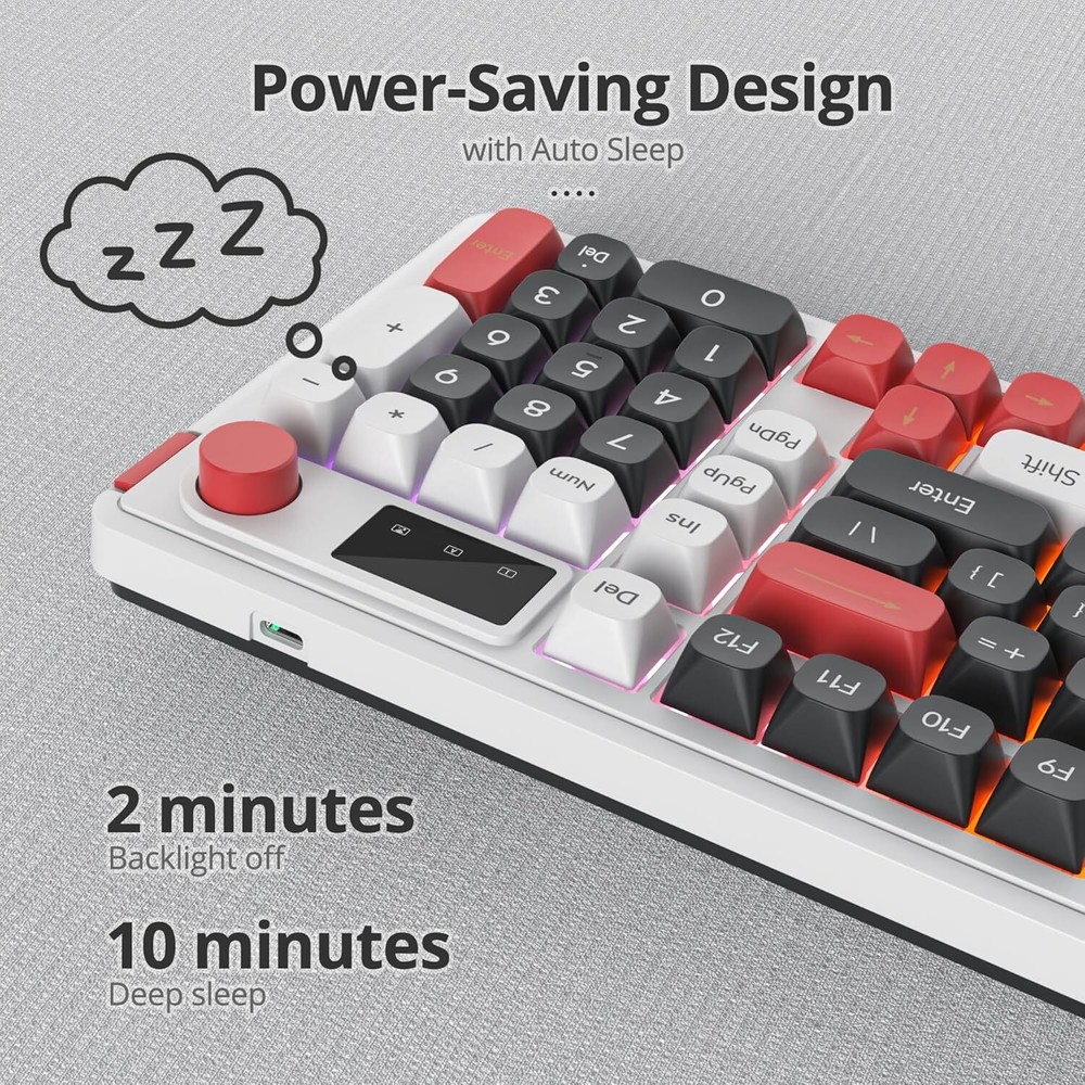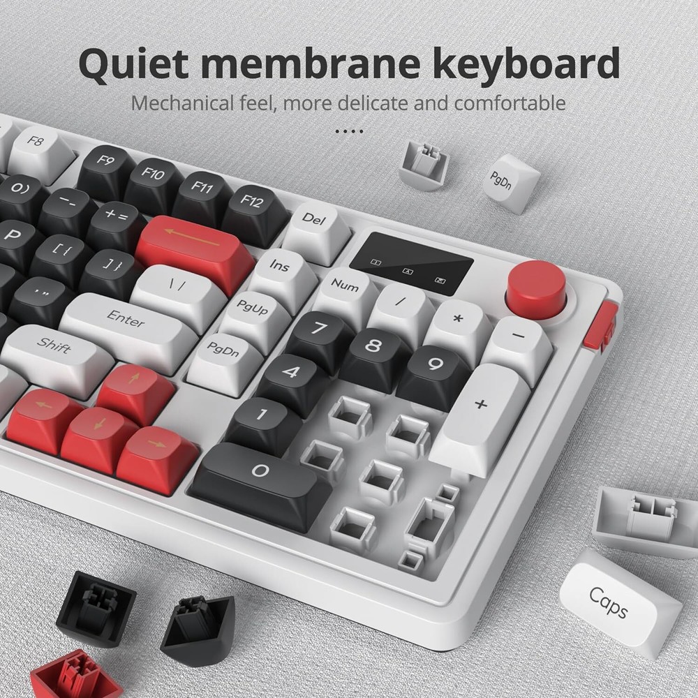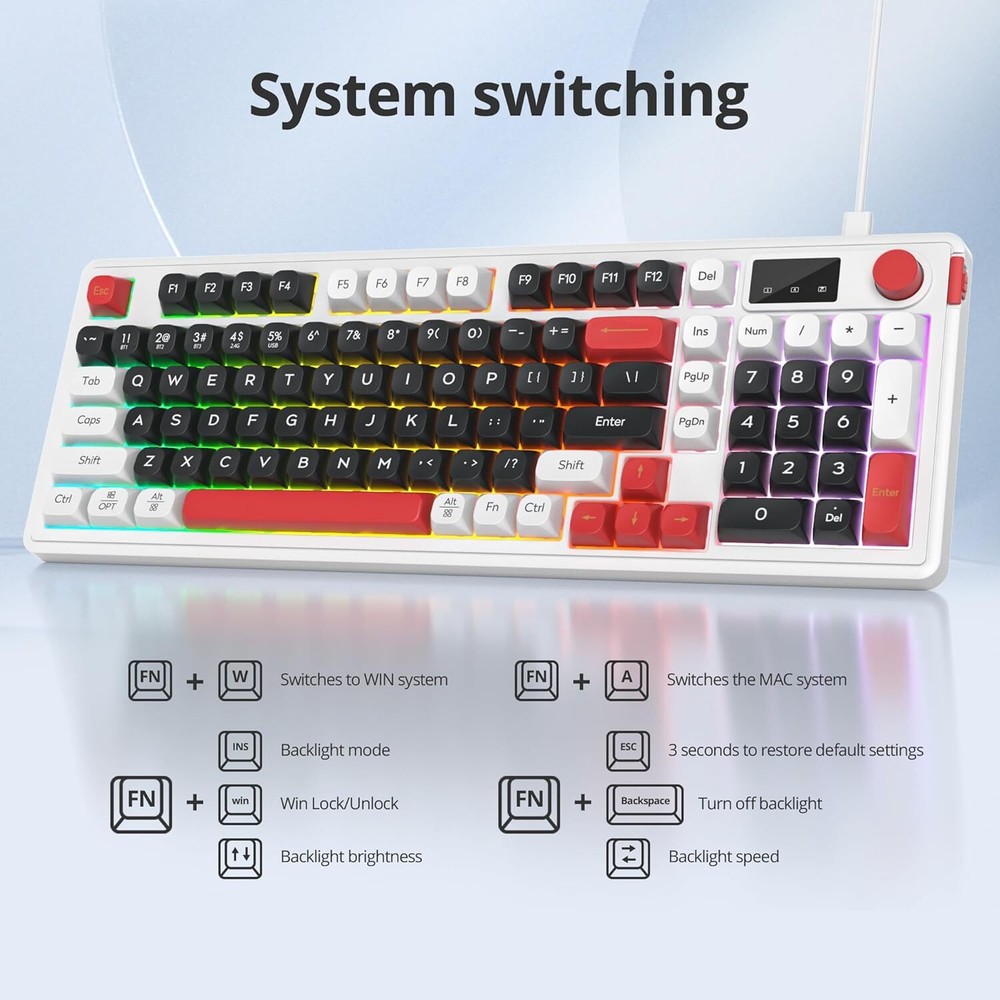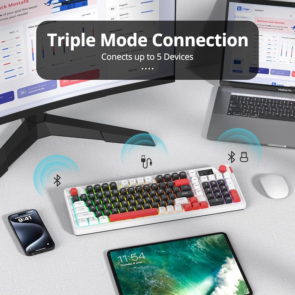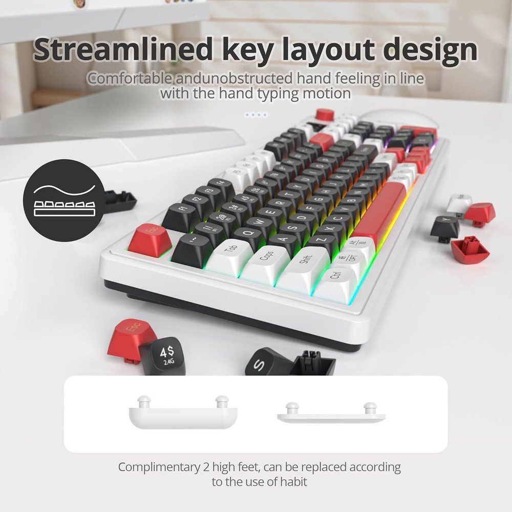 Product Description 【Triple Modes of Connection】This keyboard supports wireless and wired connections. By the wireless option, either Bluetooth (up to 5.0) or 2.4GHz can be chosen, and the polling rate can be up to 1000hz with 2.4GHz. This Bluetooth keyboard allows multi-tasking workflow for up to 5 devices. 【2-in-1Function Knob】One of the highlights of this keyboard is the classy knob. By default, the knob can be used for backlit mode, Switch backlit and adjust brightness.Press 5 seconds to switch the volume mute and adjust the sound up/down 【Mechanical Feeling Gaming Keyboard】96 Key PC Gaming Keyboard with gasket mount, durability and responsiveness. The keyboard features a solid ABS construction with precision engineered keycaps. The keyboard keys offer a mechanical keyboard feel with less resistance and a short key travel, they require less work to type and still deliver precise tactile feedback for a Flawless Gaming Performance 【With RGB Backlit Gaming Keyboard】Gaming keyboard is designed with RGB lighting effect,You can use FN+Ins to change RGB mode and FN+backspace and turn the light up/down, or switch the knob control. creating a cool and colorful game atmosphere to enhance the excitement of the game. 【Ergonomic Comfort】This keyboard has Silicone stands at the bottom of keyboard and complimentary 2 high stands to adjust keyboard height, for comfortable typing or gaming. ABS ball cap Delicate feel and more comfortable Adopting ABS spherical keycaps for delicateand lubricated performance.Delicate and comfortable strike feelingmore durabilityana wresistant 【Compatible with Mac and Windows】 98 is compatible with operating systems, from Mac to Android to Windows. Switch FN+A、FN+W between systems and devices. About Us We are a reputable seller with many years of experience selling on eBay. Our goal is to provide high-quality products and excellent customer service. Shipping Items will be shipped within 1-3 business days when we received payment. (Orders are not processed on weekends & holidays) Tracking information will be sent once item is shipped. Delivery time depends on destination and other factors Item is shipped to ebay address. Leaving correct address can minimize delay. For international shipping and shipping to Guam, Hawaii and Alaska, Please contact us before placing the order. International buyers please note: Import duties, taxes and charges are not included in the item price or shipping charges. These charges are buyer’s responsibility. We will try our best to reduce the risk of the custom duties. Local pick-up is unavailable at the moment. Contact Us We reply any email messages within 1 business / working days(off-duty at weekend). If you do not get a response from us, then please check your junk or spam mailbox. Our Business hours: Mon-Fri 9:00-18:00, UTC/GMT +8 hours. Please contact us either by clicking "contact seller" in the "purchase history" section or simply click "ask a question" at the bottom of this page. If you are unsatisfied with our item or service, please contact us before leaving any feedback. We are committed to resolve all issues in a friendly and satisfactory manner.