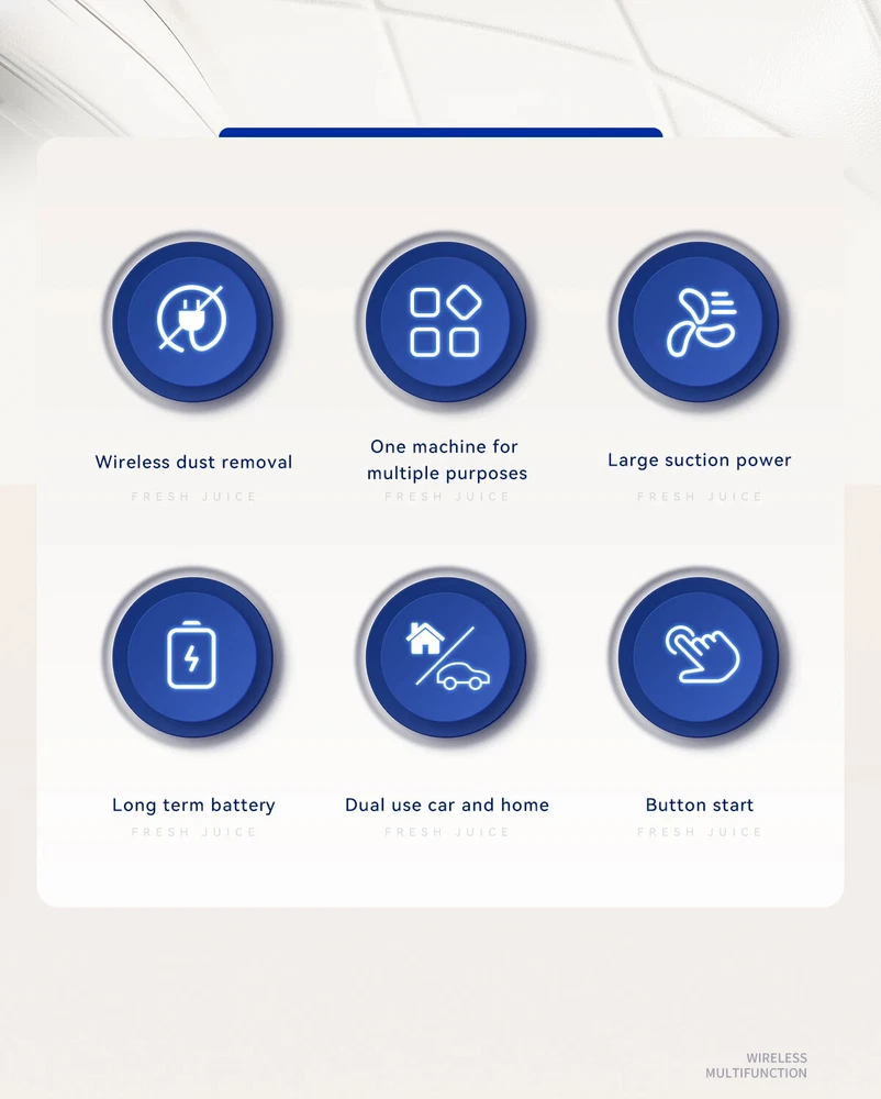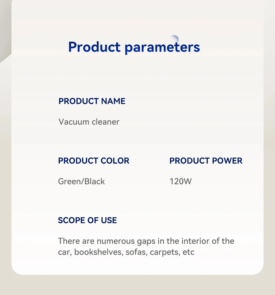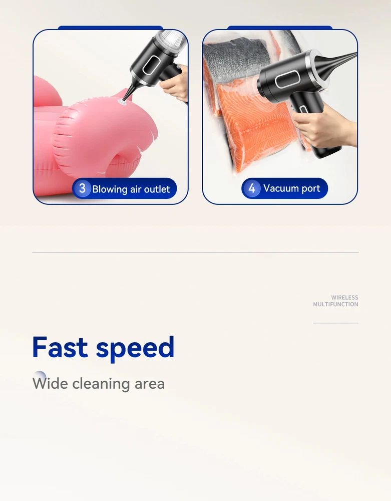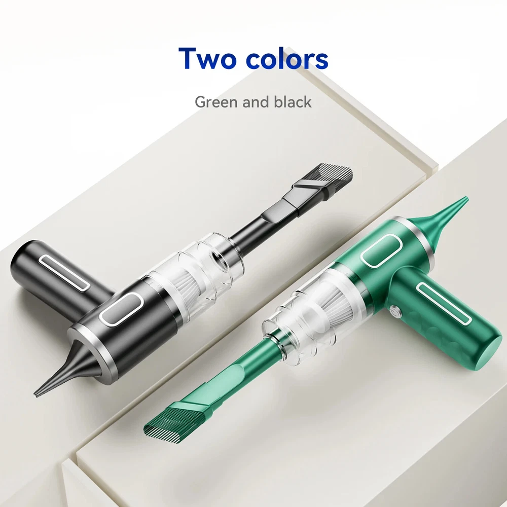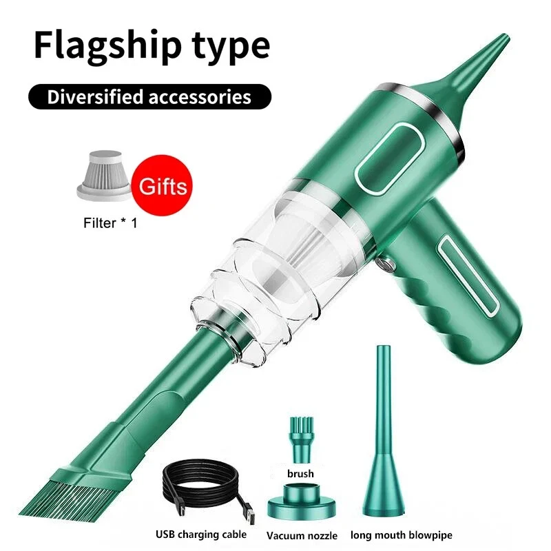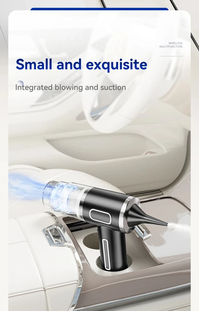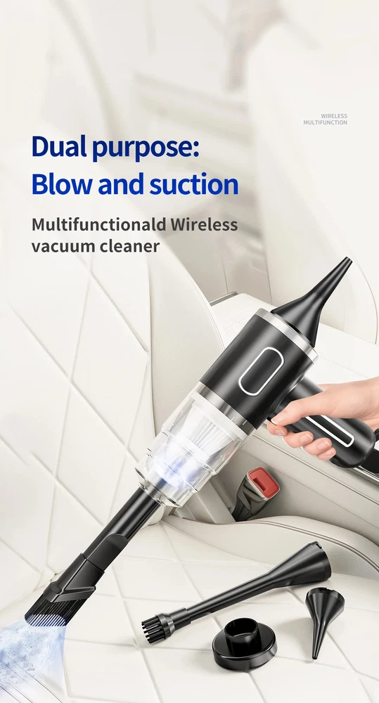 9600000Pa Wireless Vacuum Cleaner 5 in1 Strong clean Automobile Portable Vacuum Clean Handheld For Car Home Office Specification: Rated speed: 45000(r/min) Rated input power: 120 (W) Rated voltage: ≤24V (V) Vacuum suction: 9600000Pa (PA) Battery capacity: 2000mah Noise ratio: ≤70dB Charging time: 3-4hours About this product: 1.【Rechargeable Battery & Fast Charging】This electric vacuum cleaner has a built-in 2000mAh battery with a fast charging port. It can be easily charged using car chargers, power banks, laptop rechargeable batteries and other charging methods. Charging takes only 3 hours. This reusable vacuum cleaner is the perfect replacement for a compressed air tank, environmentally friendly and energy-saving. It also saves money and time. 2.【Powerful Air Duster and Vacuum Cleaner 5-in-1】Our vacuum cleaner has two functions: it can suck, pump, blow and charge. Easily blow away particles such as dirt, crumbs, and dust from surfaces, as well as remove small, stubborn dirt hidden in keyboards, nooks and crannies. 3.【Easy Maintenance】With just one click of removal, you can easily dump the garbage and clean the vacuum cleaner. Hepa filters can be washed and reused, ensuring efficient suction while keeping dust and dirt out and preventing clogging. 4.【Wide range of uses】The cordless vacuum cleaner comes with many different detachable brush head nozzle accessories for cleaning various scenarios. For example, it can thoroughly clean computer keyboards, cameras, air conditioners, sofas, windows, pets, plants, etc. Packing List: 【Double-use for blowing and sucking】: Standard: Vacuum cleaner *1+USB charging cable *1+ brush *1+ long-nosed straw *1+Vacuum nozzle*1+filter element *1 Upgraded: Vacuum cleaner *1+USB charging cable *1+ brush *1+ long-nosed straw *1+Vacuum nozzle*1+filter element *2