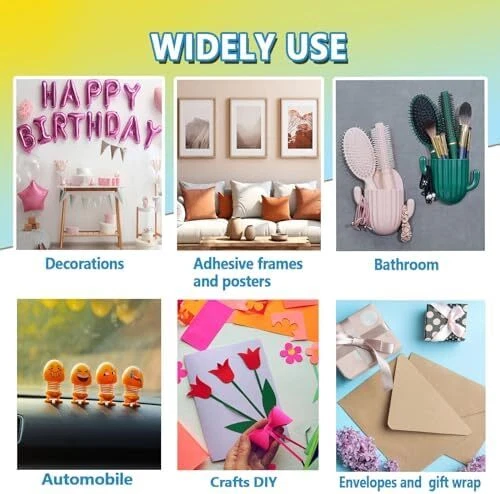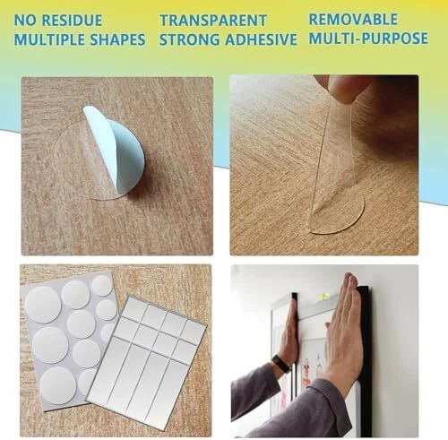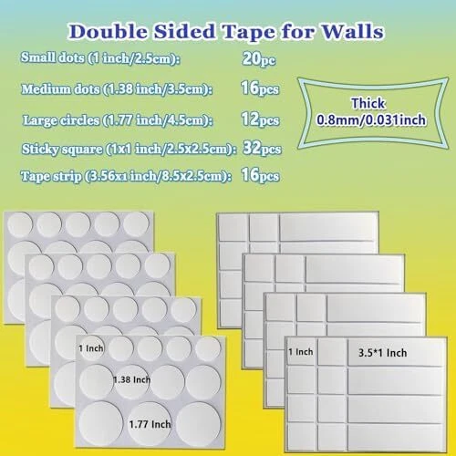 Strong Double Sided Adhesive Dots Heavy Duty: This double stick mounting tape for walls is high viscosity,strong adsorption,can work for a longer period of time will not easy to fall off, suitable for hanging and sticking small and medium-sized objects. Combined use of multiple picture hanging tape provides greater adhesive strength Removeble and No Residue: Double sided wall adhesive tape can be pasted on most smooth and flat surfaces, such as plastic, glass, metal, fabric, wood, tile, etc. Poster tape will not leave glue or marks when tearing off which no damage for surface of object, and will not cause a messy scene, but so careful consideration should be given when using double sided tape for painted walls that removing it may damage your painted wall Multipurpose Wall Adhesive Strips Heavy Duty: These double sided wall adhesive tape are suitable for DIY crafts,holiday and birthday decorations,balloon decorations,pasted envelopes,photo frames,wall decorations,hang pictures, posters,socket,art crafts,mirrors,and carpets ets. Two sided tape heavy duty for walls hanging usually used in home,office,school, party,wedding and decoration Washable, Reusable: This clear removable double sided tape can be reused. You only need to rinse it with water, and then wait for it to dry to regain its stickiness. This is a good aid for saving money 1OO% Service:If any question about the double sided mounting tape for walls,ask us and we will help you solve problem