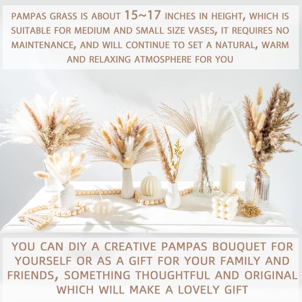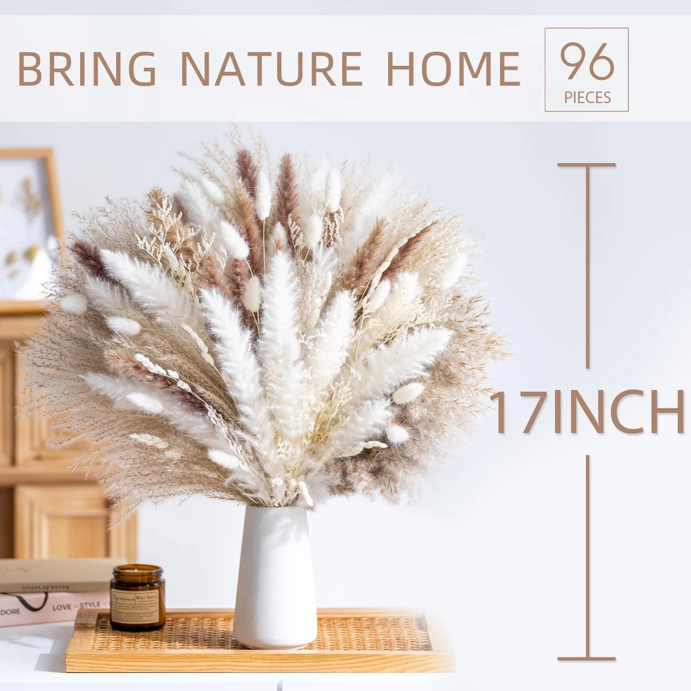 96PCS Natural Dried Pampas Grass Boho Home Decor Bouquet Phragmites Dried Flowers Bouquet for Wedding Floral Arrangements Home Decorations (96PCS) Product Details Size: 96PCS Brand: WILD AUTUMN MPN: Wa-b EAN: 9490408965321 UPC: Does not apply Color: Natural,white,beige Plant or Animal Product Type: Hierba de la Pampa Brand: WILD AUTUMN Specific Uses For Product: Home Décor Unit Count: 96 Count Manufacturer: WILD AUTUMN Product Dimensions: 4 x 4 x 17 inches Item Weight: 4.2 ounces Item model number: Wa-b Date First Available: October 24, 2021 BEAUTIFUL HOME DECOR - Be ready for our attention-grabbing pampas grass to stand out in any room!Whether it be homes, offices, or weddings, our pampas grass fits effortlessly with boho, farmhouse, and modern style decorations! With proper care -our Pampas Grass Bouquet can last up to three years, making it a sustainable and eco-friendly decorating option.keep it dry and enjoy the beauty of this low-maintenance floral arrangement,our pampas grass is an easy and low-maintenance way to add natural beauty to your home or wedding floral arrangements. EASY AND LOW-MAINTENANCE - Easy to maintain simply lightly shake,Leave the pampas grass in the sun for three to six hours to allow the sun's energy to fluff it up. and Spray some hairspray to preserve pampas fluffy. BRING NATURAL IN TO YOUR HOME - Our pampas grass is ethically sourced and all-natural,making it the perfect choice for environmentally conscious-consumers who want to decorate their homes with sustainable products. ENJOY FLOWER ARRANGEMENTS - Trim it to the length you like and insert it into the vase . It will be a surprise to decorate your life and a perfect gift for your friends. our pampas grass bouquet is the perfect choice.