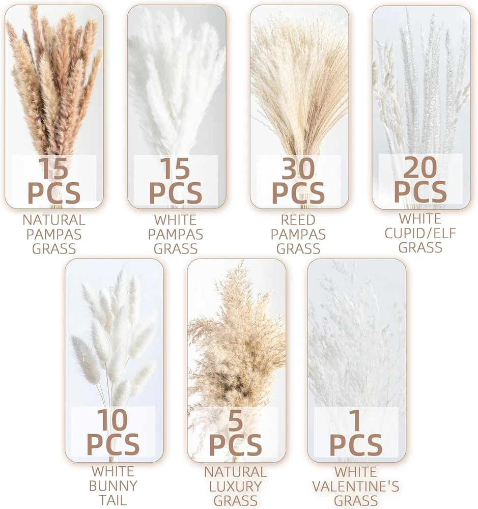 BEAUTIFUL HOME DECOR - Be ready for our attention-grabbing pampas grass to stand out in any room!Whether it be homes, offices, or weddings, our pampas grass fits effortlessly with boho, farmhouse, and modern style decorations! With proper care -our Pampas Grass Bouquet can last up to three years, making it a sustainable and eco-friendly decorating option.keep it dry and enjoy the beauty of this low-maintenance floral arrangement,our pampas grass is an easy and low-maintenance way to add natural beauty to your home or wedding floral arrangements. EASY AND LOW-MAINTENANCE - Easy to maintain simply lightly shake,Leave the pampas grass in the sun for three to six hours to allow the sun's energy to fluff it up. and Spray some hairspray to preserve pampas fluffy. BRING NATURAL IN TO YOUR HOME - Our pampas grass is ethically sourced and all-natural,making it the perfect choice for environmentally conscious-consumers who want to decorate their homes with sustainable products. ENJOY FLOWER ARRANGEMENTS - Trim it to the length you like and insert it into the vase . It will be a surprise to decorate your life and a perfect gift for your friends. our pampas grass bouquet is the perfect choice. Product Description Hi~ We are committed to bringing nature into your home. The bouquet is made up of six kinds of high-quality materials selected by our experienced florist. We hope high quality Pampas bouquets will take your home decorating style to the next level. Hopefully it's not just a pampas bouquet but integrated into your home and into your life. We are always developing new home decoration products. Bring you the best shopping experience through high quality and imagination. We try different styles to find the perfect home decor for you. As we all know, the fall of pampas is inevitable. Therefore, enjoy the gift of nature and inclusive for this little imperfection. Thank you for your choice and love~~ Bring nature home perfect for creating a cozy and inviting atmosphere.