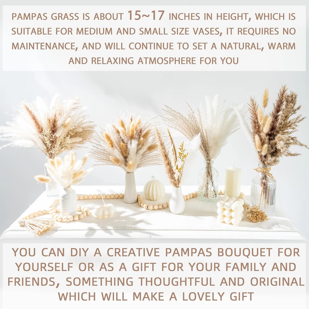 BEAUTIFUL HOME DECOR - Be ready for our attention-grabbing pampas grass to stand out in any room!Whether it be homes, offices, or weddings, our pampas grass fits effortlessly with boho, farmhouse, and modern style decorations! With proper care -our Pampas Grass Bouquet can last up to three years, making it a sustainable and eco-friendly decorating option.keep it dry and enjoy the beauty of this low-maintenance floral arrangement,our pampas grass is an easy and low-maintenance way to add natural beauty to your home or wedding floral arrangements. EASY AND LOW-MAINTENANCE - Easy to maintain simply lightly shake,Leave the pampas grass in the sun for three to six hours to allow the sun's energy to fluff it up. and Spray some hairspray to preserve pampas fluffy. BRING NATURAL IN TO YOUR HOME - Our pampas grass is ethically sourced and all-natural,making it the perfect choice for environmentally conscious-consumers who want to decorate their homes with sustainable products. ENJOY FLOWER ARRANGEMENTS - Trim it to the length you like and insert it into the vase . It will be a surprise to decorate your life and a perfect gift for your friends. our pampas grass bouquet is the perfect choice. Product Description Hi~ We are committed to bringing nature into your home. The bouquet is made up of six kinds of high-quality materials selected by our experienced florist. We hope high quality Pampas bouquets will take your home decorating style to the next level. Hopefully it's not just a pampas bouquet but integrated into your home and into your life. We are always developing new home decoration products. Bring you the best shopping experience through high quality and imagination. We try different styles to find the perfect home decor for you. As we all know, the fall of pampas is inevitable. Therefore, enjoy the gift of nature and inclusive for this little imperfection. Thank you for your choice and love~~ Bring nature home perfect for creating a cozy and inviting atmosphere.
