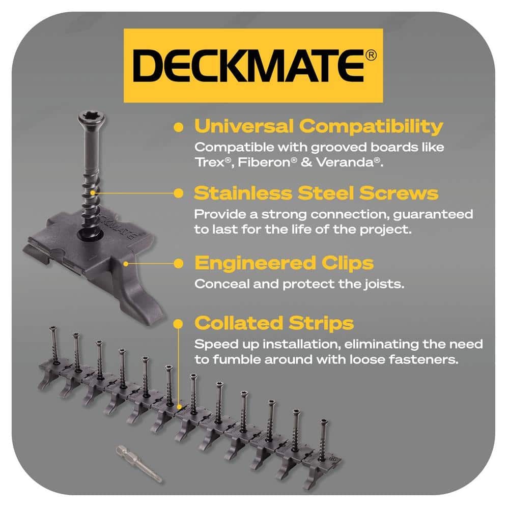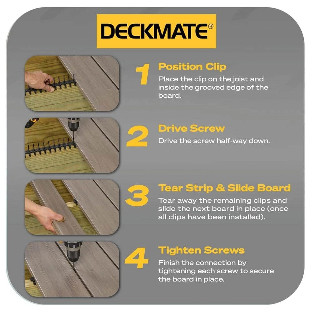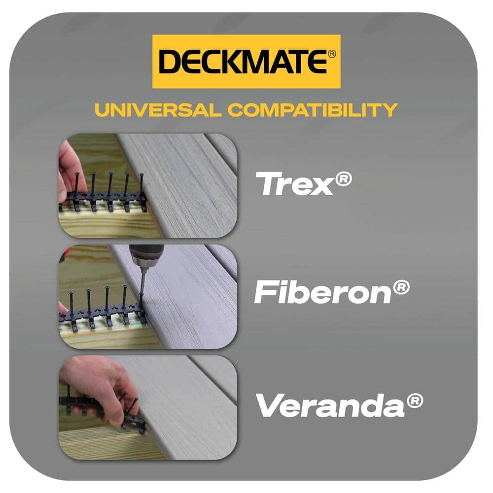 Collated hidden deck clips and screws for trex, fiberon & veranda Durable polymer clips guaranteed to last the life of the project Collated clips speed up installation for a fastener free finishIntroducing the DeckMate Universal Collated Hidden Deck Fastener, now available exclusively at The . The DeckMate Hidden Fastener is engineered to deliver a simple and strong way to hide fasteners in grooved boards like Trex, Fiberon, Veranda and more. The 12 clip collated strips speed up installation, eliminating the need to fumble around with loose fasteners, and the stainless steel screws provide a strong connection, guaranteed to last for the life of the project, while the DeckMate clips conceal and protect the joists. To install, simply position the clip inside t... Happylistings DECKMATE 96-Pack 55 sq ft. Black Collated Universal Hidden Deck Fasteners for Grooved Decking Collated hidden deck clips and screws for trex, fiberon & veranda Durable polymer clips guaranteed to last the life of the project Collated clips speed up installation for a fastener free finishIntroducing the DeckMate Universal Collated Hidden Deck Fastener, now available exclusively at The . The DeckMate Hidden Fastener is engineered to deliver a simple and strong way to hide fasteners in grooved boards like Trex, Fiberon, Veranda and more. The 12 clip collated strips speed up installation, eliminating the need to fumble around with loose fasteners, and the stainless steel screws provide a strong connection, guaranteed to last for the life of the project, while the DeckMate clips conceal and protect the joists. To install, simply position the clip inside the board, drive the stainless steel screw, then tear away the strip. Repeat this at every joist the board passes over, then slide the next board into place. Finish the connection by tightening each fastener to secure the decking. Covers approximately 55 sq. ft. of decking. Includes 96 clips and screws and 1 T15 star drive bit. The DeckMate Universal Collated Hidden Deck Fastener, available exclusively at The .Fastener free finish Covers 55 sq. ft. for decking, 96 clips and screws, bit included Compatible with Trex, Fiberon and Veranda Collated clips speed up installation Stainless steel screws provide a strong connection Creates a consistent 3/16 in. gap between boards Guaranteed to last for the life of the project Black clip conceals and projects the joist T 15 star drive bit included Item Specifics Brand Unbranded Type Hidden Deck Fasteners MPN DMCLIP-55 Item Length 4.5 in Item Width 10.5 in Item Height 4 in Color Family Black Decking Hardware Type Hidden Deck Fasteners Fastener Color Black Fastener Material Stainless Steel Included Driver Bit,Screw Number in Package 96 Thread Style Coarse Thread Total Product Weight (lb.) 1.59 Individual Product Height (in.) 4 Individual Product Width (in.) 10.5 in Individual product length (in.) 4.5 in Product Depth (in.) 4.5 in Product Height (in.) 4 in Product Width (in.) 10.5 in Square Footage Coverage per Package (sq. ft.) 55 Model DMCLIP-55 Contact Us 1.Dear customers, we appreciate your business, our aim is to provide Top Level Customer Service,if you are satisfied with our service, please leave us a 5 star positive feedback . 2.If you have any question or concern about your eBay order, please feel free to let us know. We will try our best to reply all questions within 24 hours. However, no answer will be replied during weekends or holidays. Please allow up to 48 hours delay in receiving our response after long weekends or holidays. 3.Please via eBay Message for a solution for resolutions before leaving negative feedback, we strive to providing the greatest service and bringing the highest satisfaction to all of our customers. Shipping 1.We usually ship within 3-5 business days of receiving cleared payment., and we provide Free Shipping for most items. 2.Fast shipping is very important for us. We use multiple fulfilment warehouse around the United States. We only ship to the lower 48 States and do not ship to PO Boxes. 3.Please make sure the correct Ship-To address is entered before checking out. Once the payment is completed, you may not be able to change the shipping address. We shall not be held responsible for any wrong or undeliverable addresses. Returns 1.We provide 14 days return upon the buyer received the item. It must be in good condition and you will undertake the returned shipping cost. 2.We will offer replacement or refund for all DEFECTIVE items (not including damage resulting from accidents / abuse / misuse / improper care), but a photo is needed for our reference beforehand and should be reported to us within 7 days from purchase date. 3.All items are brand new and have been passed the quality check. All are packed in a good condition before item dispatch. Payment We accept PayPal payment,PayPal Credit,Credit card or debit card and so on. Payment should be completed within 4 (Four) days of auction closing. Or unpaid dispute will be filed for closing auction. We will leave a positive feedback immediately after payment is received. We appreciate a positive feedback as much as you do. If for some reason there is any issue with the purchase, please contact us prior to leaving feedback, we will be glad to work together and provide a satisfying solution. Happylistings DESCRIPTION PAYMENT SHIPPING RETURN POLICY CONTACT US Help & Info Payment Policy Shipping Policy Return Policy FAQ About Us DECKMATE 96-Pack 55 sq ft. Black Collated Universal Hidden Deck Fasteners for Grooved Decking Collated hidden deck clips and screws for trex, fiberon & veranda Durable polymer clips guaranteed to last the life of the project Collated clips speed up installation for a fastener free finishIntroducing the DeckMate Universal Collated Hidden Deck Fastener, now available exclusively at The . The DeckMate Hidden Fastener is engineered to deliver a simple and strong way to hide fasteners in grooved boards like Trex, Fiberon, Veranda and more