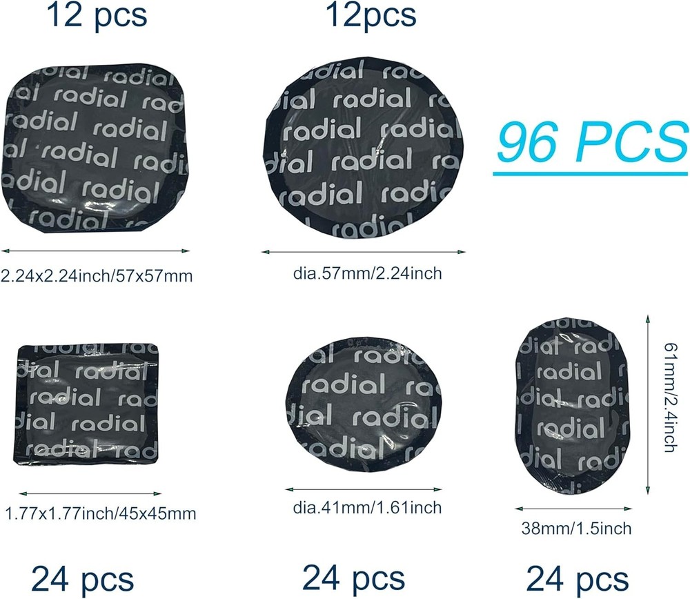 96-Piece Heavy-Duty Tire Repair Kit - Self-Vulcanizing Patches for All Vehicles ‹ › ‹ › ‹ › ‹ › 96-Piece Heavy-Duty Tire Repair Kit A must-have for every vehicle owner, this comprehensive repair kit is designed to ensure your safety and peace of mind on the road. Equipped with self-vulcanizing patches suitable for all types of vehicles, this tire repair kit is your reliable companion during unexpected tire punctures. Features: Versatile Patch Sizes: Includes a variety of patches to accommodate different puncture sizes and types: Dia. 1 5/6" (41 mm) - 24 pcs Dia. 2 1/4" (57 mm) - 12 pcs 1 3/4" x 1 3/4" (45 x 45 mm) - 24 pcs 2 1/4" x 2 1/4" (57 x 57 mm) - 12 pcs 1 1/2" x 2 3/8" (38 x 61 mm) - 24 pcs Durable Construction: Made with black vulcanizing gum and blue poly backing for enhanced chemical vulcanization. Perfect for Different Tire Types: Ideal for puncture repair in both radial and bias ply tires, as well as inner tubes. Comprehensive Kit: 96 pieces, ensuring you have a patch for every situation. Benefits: Reinforced reliability to keep you moving without fear of tire issues. Quick and straightforward installation allows for immediate repairs. Space-efficient packaging helps you store it easily in your vehicle. Quality patches designed to withstand harsh conditions for lasting performance. Why Choose Our Heavy-Duty Tire Repair Kit? Don’t let a tire puncture ruin your day or jeopardize your safety. With our 96-Piece Heavy-Duty Tire Repair Kit, you gain a powerful ally on the road. Each patch is meticulously crafted to provide strong, long-lasting repairs that restore your tires effectively. Whether you're at home, on a road trip, or in an emergency situation, this kit provides the solutions you need to keep your journeys uninterrupted. Invest in safety and reliability—add our Heavy-Duty Tire Repair Kit to your vehicle essentials today! Shipping Free & Fast Shipping - We offer free shipping to most of the USA with a normal delivery time of 3-7 days. However, due to the current situation, additional delivery time (up to 3 weeks) may be required for some items. Alternative Carriers - We may use alternative carriers (e.g. USPS, FedEx, UPS, etc.) to ensure your package arrives safely and on time. Due to the use of multiple carriers, we are unable to provide a tracking number automatically. Handling Time - Orders are processed and shipped within 1-2 business days of receiving cleared payment. Shipping Restrictions - Shipping to Alaska, Hawaii, Puerto Rico, Guam, and other US territories may incur shipping charges or delivery restrictions. Please contact us before ordering, or your order can be refunded/cancelled. State Restrictions - There may be restrictions based on your state of purchase. For example, certain items may not be shipped to California due to state regulations. Contact for Tracking Updates - If you require tracking updates or have any concerns about the delivery of your order, please feel free to contact us, and we will be happy to assist you. Return 30-Day Hassle-Free Returns - We want you to be completely satisfied with your purchase. If you are not, you can return the item within 30 days of receiving it for a full refund or exchange. Easy Return Process - To start a return, simply contact us and we will provide you with a prepaid return shipping label and detailed instructions. Restocking Fee - There are no restocking fees for returns. However, the buyer is responsible for return shipping costs if the return is not due to a seller's error. Refund Processing Time - Refunds will be processed within 5 business days of receiving the returned item in its condition. Payment We accept all major credit cards, PayPal, and Apple Pay for your convenience. Your payment information is secure and encrypted to ensure a safe and seamless transaction. Please complete your payment within 3 days of purchase to avoid any delays in shipping. Feedback Your feedback is extremely important to us. We strive to provide the best products and customer service possible. If you are satisfied with your purchase, please take a moment to leave us a positive review. If you have any concerns or issues with your order, please contact us before leaving negative feedback. We are committed to resolving any problems and ensuring your satisfaction. Contact Us If you have any questions or concerns, please feel free to out to our customer support team. You can contact us through the eBay messaging system. We are available Monday to Friday, 9:00 am to 5:00 pm EST, and we will do our best to respond to your inquiry within 24 hours. Buy it now and enjoy a pleasant shopping experience! Placement on Vehicle: Tire Repair Patches Material: Rubber,Vulcanizing Gum,Poly Backing Finish: Uncoated Type: Tire Patch
