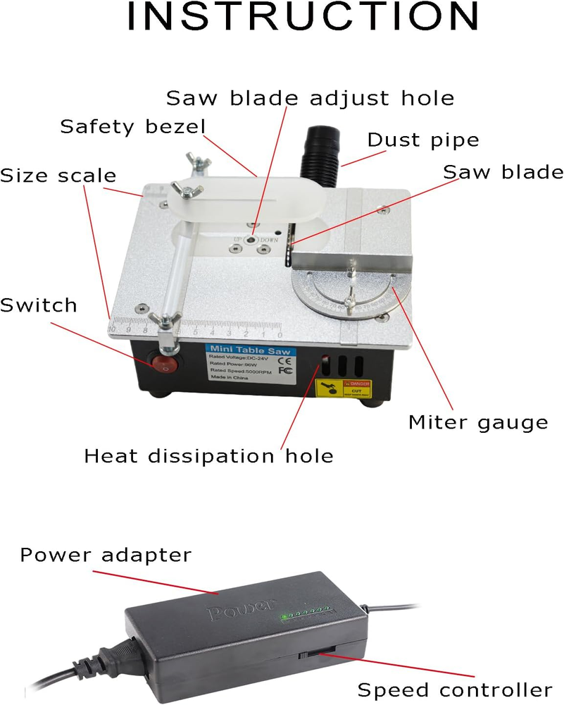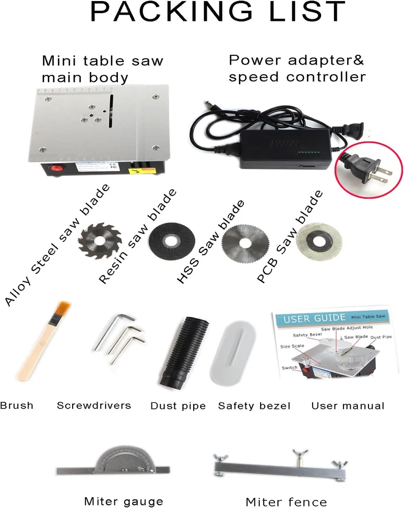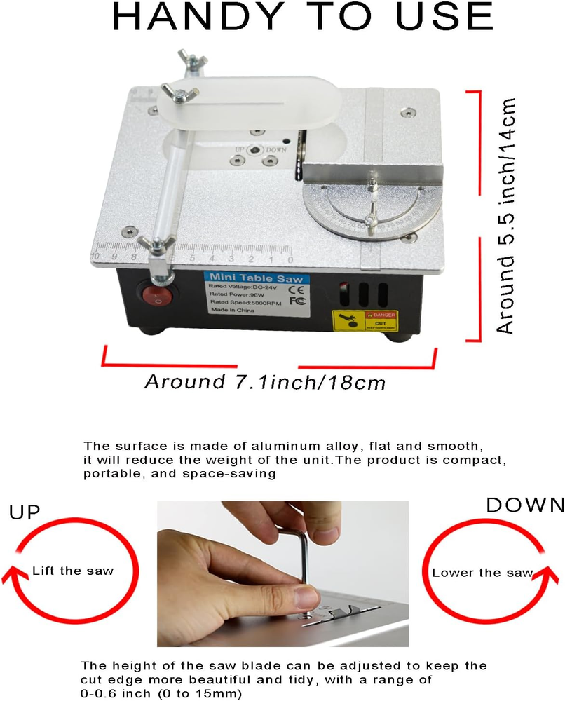 【Lightweight Aluminum Alloy】: The panel of the mini table saw is made of aluminum alloy, which makes it lightweight, compact, and durable. The overall weight is about 3.9lbs/1.8kg. Product Dimension: 7.1*5.5*2.95 inch (18*14*7.5 cm) 【7-Degrees Speed】:The craft table saw supports 7 degrees of speed. You can control the speed according to material (e.g. wood/PCB board/acrylic/plastic/metal, etc.) 【Controllable Cut Thickness】:The height of the saw blade can be adjusted for different thicknesses of materials, which makes the cut surface clean and smooth. The blade height can be adjusted in the range of 0-0.6 inch (0 to 15mm) 【Available for 0-180 Angle】: Push the material toward the blade with the angle controller(miter gauge) on the body to control the cut angle of 0-180 degrees 【Comes with Dust Pipe】: Waste and dust are inevitable in every cutting operation. It is equipped with a dust pipe so the user can connect it to a small dust collector, which is very important for the user's health 【Packing List】: 1*Mini table saw main body, 1* Power adapter, 4* blades,1* brush, 3* screwdrivers, 1* dust pipe, 1* safety bezel, 1* user manual, 1* miter gauge Product Description Mini Table Saw, RTOVZON 4 Blades Mini Desktop Electric Saw Mini Table Saw, RTOVZON 96W Mini Desktop Electric Saw Cutter, Cut Thickness Adjustable Precision Craft Table Saw with Speed & Angle Adjust 4* Blades, Available for Wood/PCB/Acrylic/Plastic/Aluminium