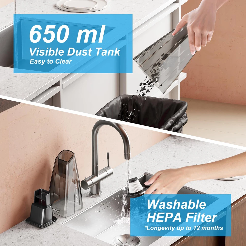 Powerful Suction -- Say goodbye to stubborn dirt and pet hair! Handheld Vacuum is equipped with a powerful High-Speed Motor, with a suction force of Up to 9700 Pa and a power of 100W. Strong suction can help you quickly complete cleaning tasks. With long-lasting suction, vacuum cleaners can easily remove dust, debris, pet hair, etc., ensuring a spotless home with minimal effort. Ultra Long Battery Life - High performance battery provides ultra long usage time. Hand held vacuum cordless 14.8 V lithium-ion battery provides battery life of about 25 mins and can be fully charged within 4 hours through the fast charging function of the charging station. Thanks to the practical wall mounted bracket, handheld vacuum cleaner can be conveniently stored to save space Wide Range of Accessories for any Situation - The hand vacuum cordless rechargeable impresses with 4 attachments. Crevice Tool - Suitable for cleaning dust in cracks, corners or car interior. Dust Brush Nozzle - Easily remove crumbs and pet hair on sofas, cushions, carpets, etc. Rubber Nozzle - Quickly and effortlessly sucks liquids. Hose - Clean those extra deep or high hard-to-reach places Low Noise + Lightweight - Cordless handheld vacuum cleaner can be installed on wall brackets. Small in size and occupying little space. The hand vacuum cordless can work at 65 dB, which sounds less annoying and provides you with a quiet cleaning experience. The 1 KG hand vac has an ergonomic handle that is easy to handle and non slip, ensuring you don't feel tired during the cleaning process Large Dust Bin + Washable HEPA Filter - The 650 ml large dust collection box can hold more dust and can be easily emptied with just a press of a button. Cordless handheld vacuum has a three-layer HEPA filtration system that can remove up to 99.99% of dust particles. It has a longer service life than traditional filters and can remove dust with clean water