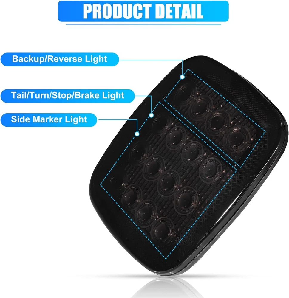 2 x 7 Inch Round LED Headlight Angle Eyes DRL Turn Signal Light For Jeep Wrangler 2007-2017 JK Notice: Note: The tail light can perfectly fit Jeep Wrangler TJ(1997-2006), ( for Jeep Wrangler JK)You need to change the hole yourself ,Professional installation is highly recommended if you have any difficult in installation. Please check whether it is fit for your vehicle before purchase. Please allow 1-3mm in size deviation due to manual measurement. Due to the light and shooting angle, pictures may have slightly chromatic aberration. Fitment: Fit for Jeep Wrangler TJ 2 Door 1997~2006 Fit for Jeep Wrangler LJ unlimited (4 Door) 2004~2006 Fit for Jeep Wrangler JK 2 Door 2 2007~2015 Fit for Jeep Wrangler Unlimited JK 4 Door 2007~2015 Fit for Jeep CJ-8 Scrambler 1981-1985 Fit for Jeep CJ-7 1976-1986 Fit for Jeep Wrangler 1997-2015 Fit for Land Rover Defender 90 1997 Fit for Land Rover Defender 90 1995 Fit for Land Rover Range Rover County Classic Sport Utility 4-Door 1995 Fit for Land Rover 90/110 1983 to 1991 (including 2.5N/A, 2.5 Turbo, V8) Fit for Land Rover 90/110 Defender 200 Tdi Fit for Land Rover 90/110 Defender 300 Tdi Fit for Land Rover 90/110 Defender Td5 Fit for Land Rover 90/110 Tdi Specification: Material: Durable ABS and LED Color: Black Voltage: DC 9-32V Life Span: 50000 hours Dimension: (7 inches) 7.01" x 7.01" x 3.07"(178mm x 178mm x 78mm) Features: 7 inches LED Headlight is Multi- function - can be White or Amber. Amber is for turn signal; white is for DRL. Faster on/off response time, striking warning effect to enhance driving safety. Weatherproof, low power consumption, long lasting. Simple installation - Plug & Play. 2Pcs 16LED Dual Color Trailer Taillight Turn Signal Brake Light Driving Light Red White Light for Wrangler Features: - Very bright Flux LED. - Epoxy sealed, waterproof. - Function as stop, turn, tail and back up lights. - High light efficiency, low power consumption, energy saving. - Waterproof, Dustproof, Anti-shock & Anti-vibration. - Long lasting, lifespan above 50,000 hours. - Easy Install to different types vehicles. - Acrylic lens is screwed on to the housing. - Features chrome reflector inside the lens which is MUCH brighter and MORE visible from different angle. - Each contains 12 red square LED (stop, turn and tail) and 4 white square LED (back-up/reverse). - Stud Mount, five wires (2 black, 1 red, 1 white and 1 brown). Specification: Material: Plastic Color: Red/White Size: 173x147x32mm Voltage: 12V LED Quantity: 16pcs (4pcs White LEDs and 12pcs Red LEDs) Waterproof rating: IP68 Light source: LED Light source power: 0.06 * 16 (W) Life: 50000 (hours) Function: steering, braking, driving Applicable models: trucks, trailers, trucks, buses, trailers Wire Connection Tips: Black Wire (negative) + Red Wire (Positive), Red light is high brightness Black Wire (negative) + Brown Wire (Positive), Red light is low brightness 2 x Black Wire (negative) + White Wire (Positive), White light works Packing included: 2 x 16 LED Red/White Light 2 x 7 inches Round LED Headlight 2x Wiring Harness Kit