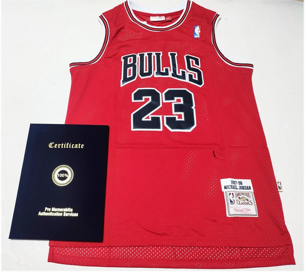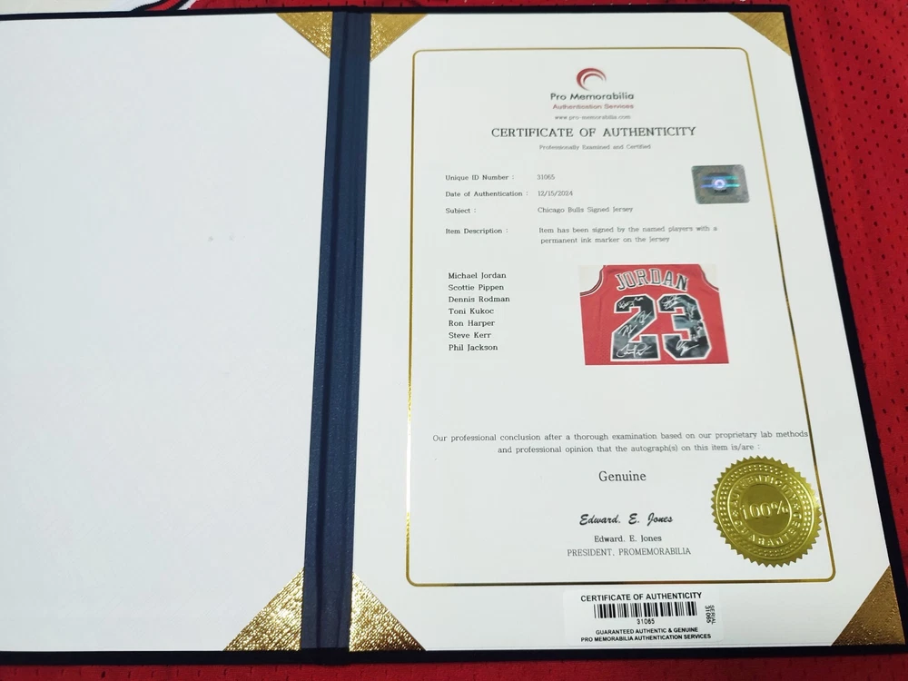 Chicago Bulls No.23 Jordan Jersey Product Details Signed By: Michael Jordan, Scottie Pippen, Dennis Rodman, Toni Kukoc, Ron Harper, Steve Kerr, Phil Jackson Jersey Size: Men's XL Condition: New With Tags Certificate of Authenticity (COA): Provided by PROMemorabilia Certificate Number: 31065 Security Features: Bar Code, Hologram Sticker, Book Case, and Photo in COA Return Policy Returns are accepted, but the buyer is responsible for return shipping costs . Why Buy This Item? This is a rare and iconic autographed jersey signed by the legendary Chicago Bulls team, including Michael Jordan and other members of the dynasty. It is authenticated by PROMemorabilia, ensuring its legitimacy and value. Perfect for collectors and fans of the greatest basketball team in NBA history! Contact me for any questions or additional information. Thank you for visiting!