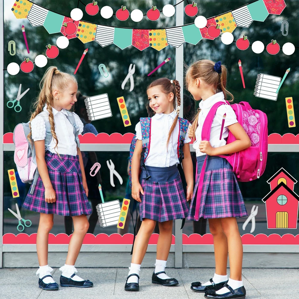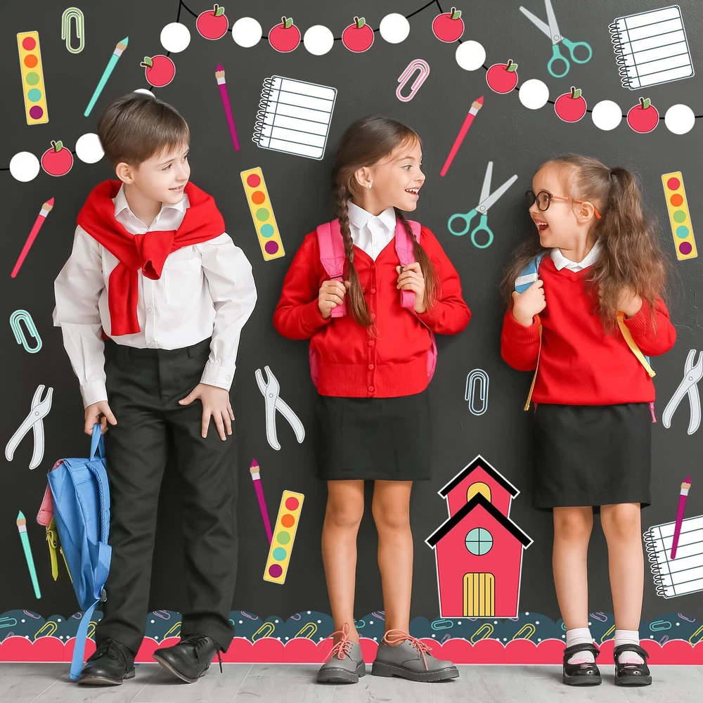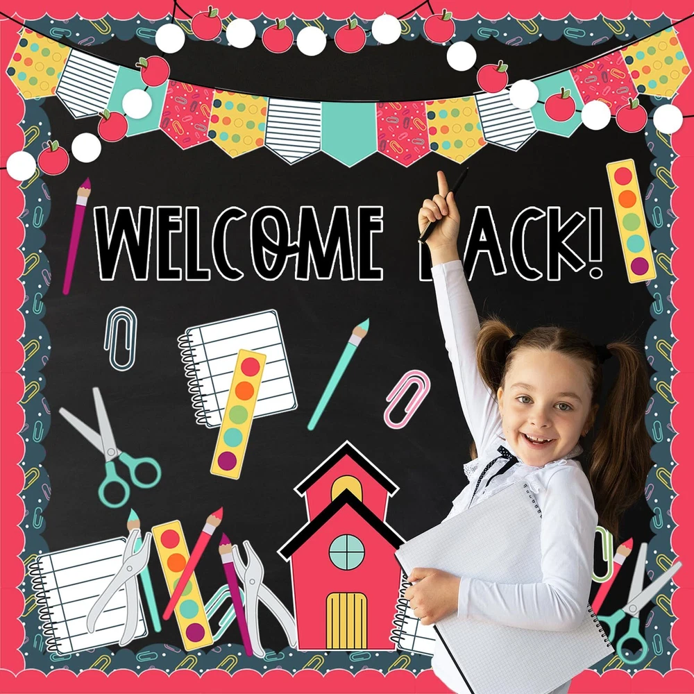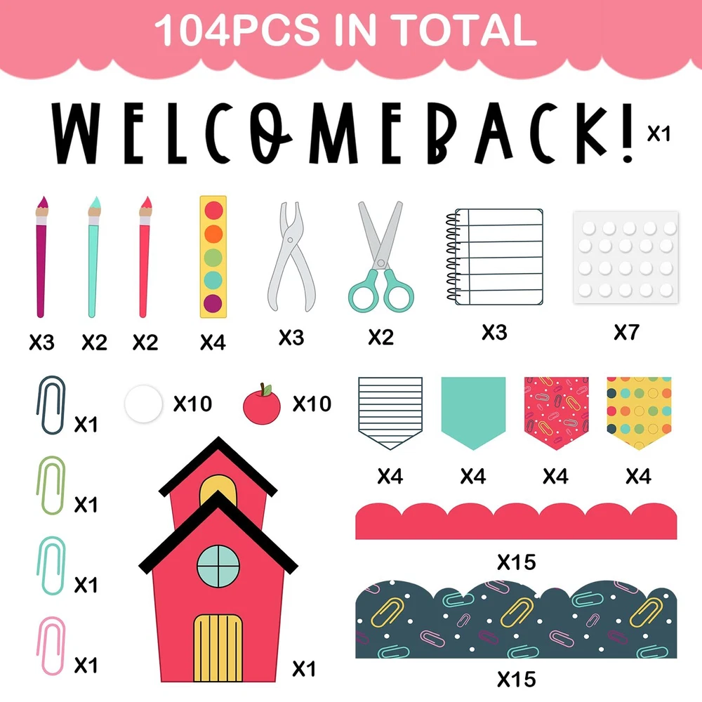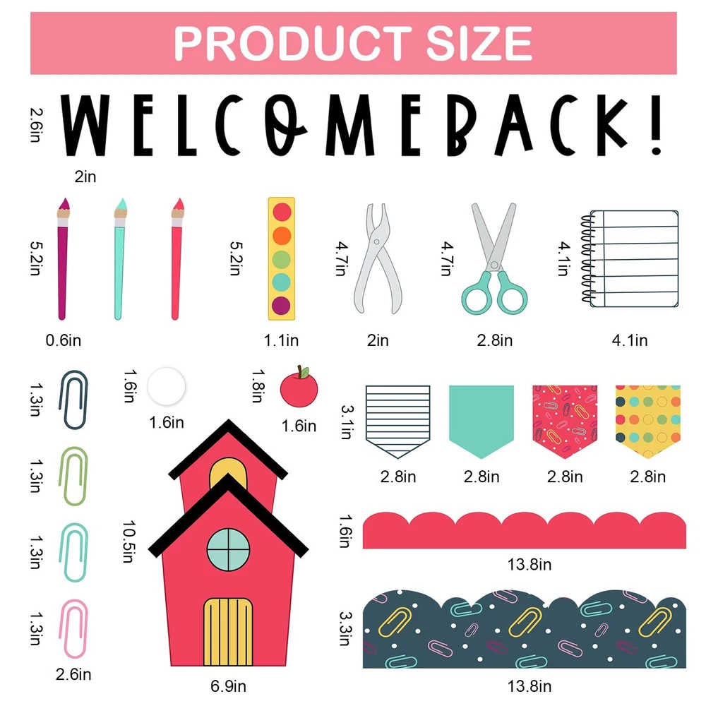 Features & Benefits: A complete classroom bulletin board decoration kit for you, includes cutouts and bulletin board borders, perfect for back to school party use. These cutouts and bulletin board borders take back to school theme design, easy to stick and peel, durable and safe to use, create a happy atmosphere. Specifications: Material: paper Package includes: 97 x Bulletin Board Decoration Kit 140 x glue point Sufficient Quantity - The package comes with 30pcs bulletin board borders and 67pcs cutouts, plus 140pcs glue points, large quantity and rich styles for your bulletin board decorations. Back to School Design - Rich varieties of school elements are contained in our bulletin board decoration kit, notebook, scissor, pencil, apple, paper clip , etc., colorful and lovely, also have letter WELCOME BACK, perfect to DIY back to school decorations. Easy to Use - There are glue points in the package so it is easy to stick these back to school theme cutouts and bulletin boards to anywhere you want, create you own decoration style. Good Quality - Made of good quality paper, durable and safe, hard to tear off and fade, which can be kept for a long time. Perfect Decorations - Wonderful decoration for classroom, home, party, office, etc., perfect for bulletin board, blackboard, wall, door, window, mirror, table and other places you want, to create a happy first day of school atmosphere.