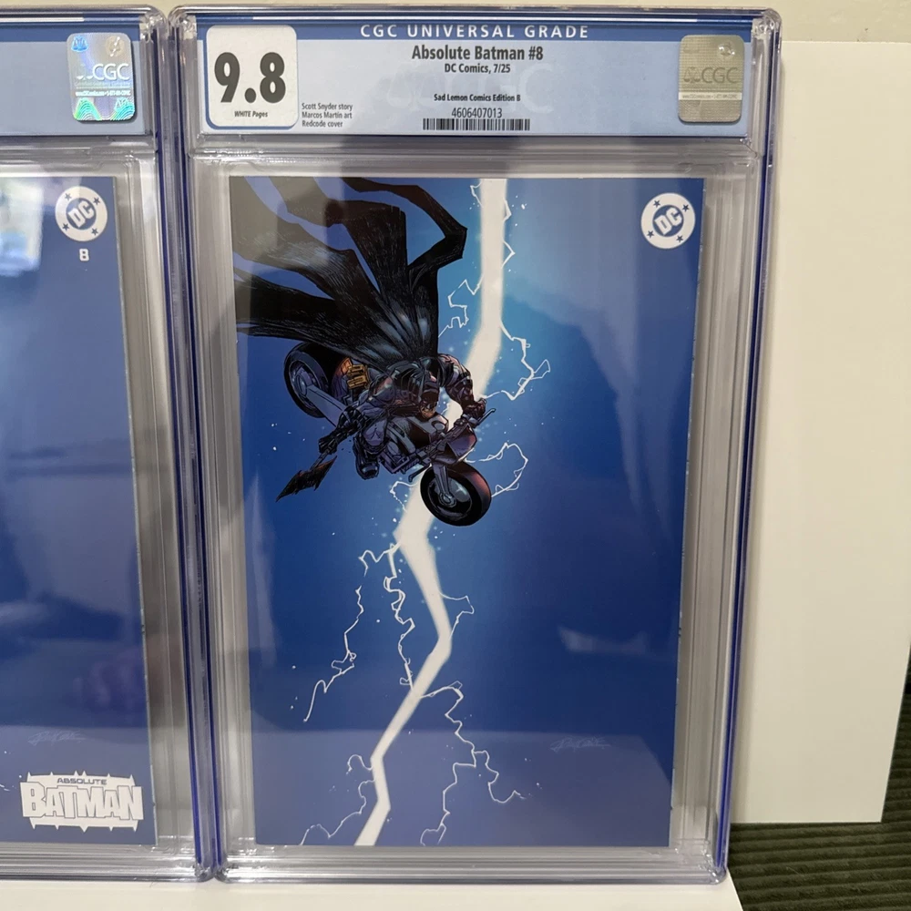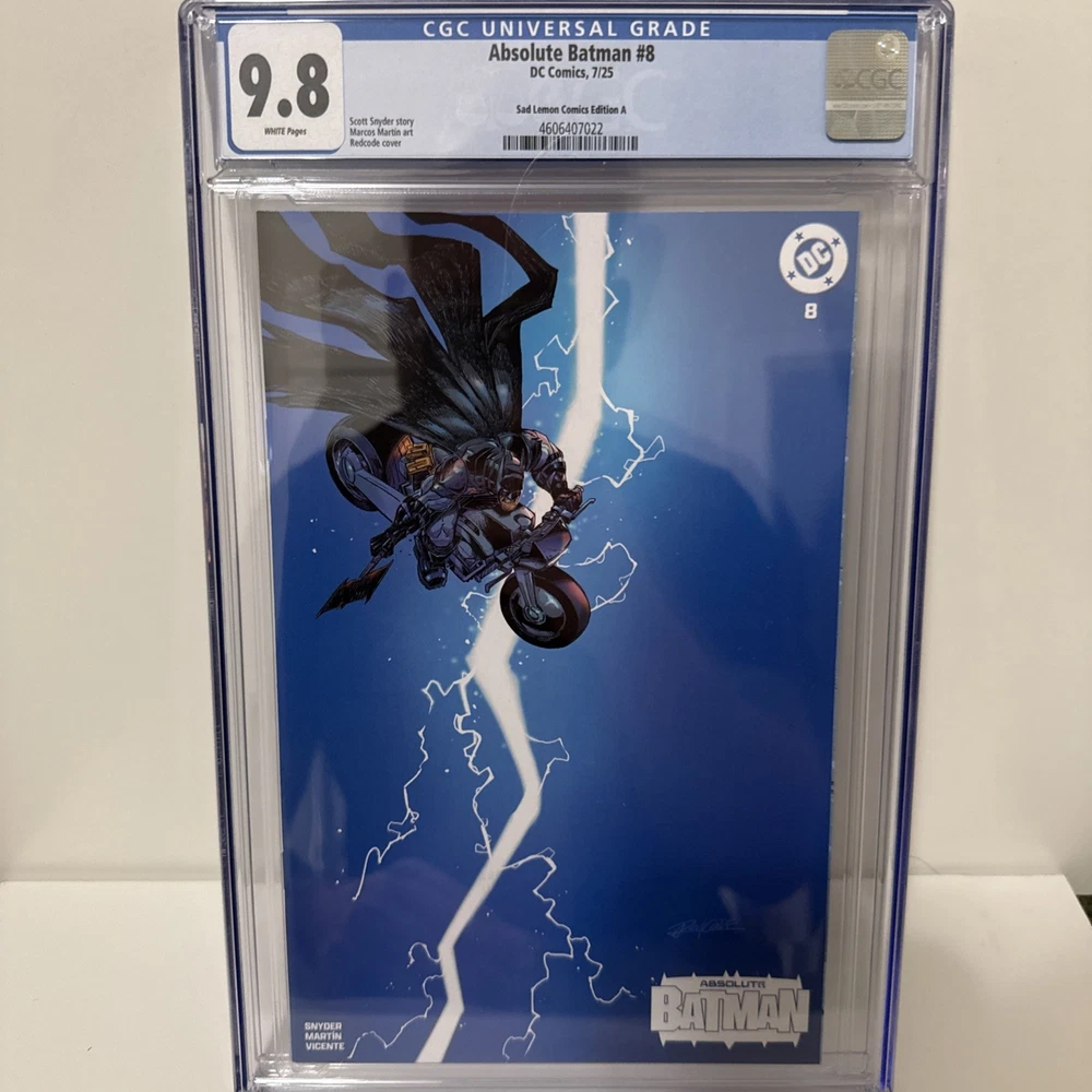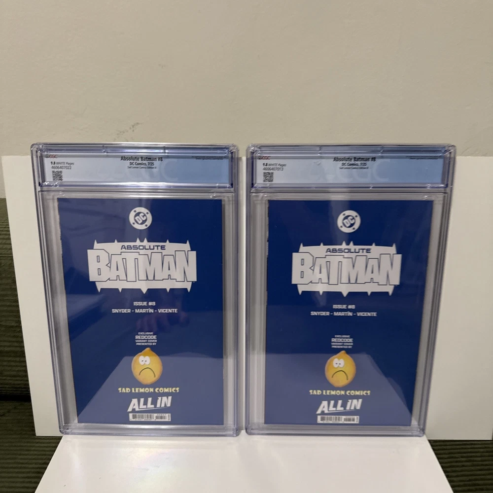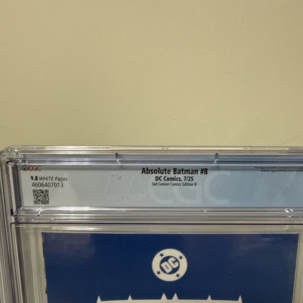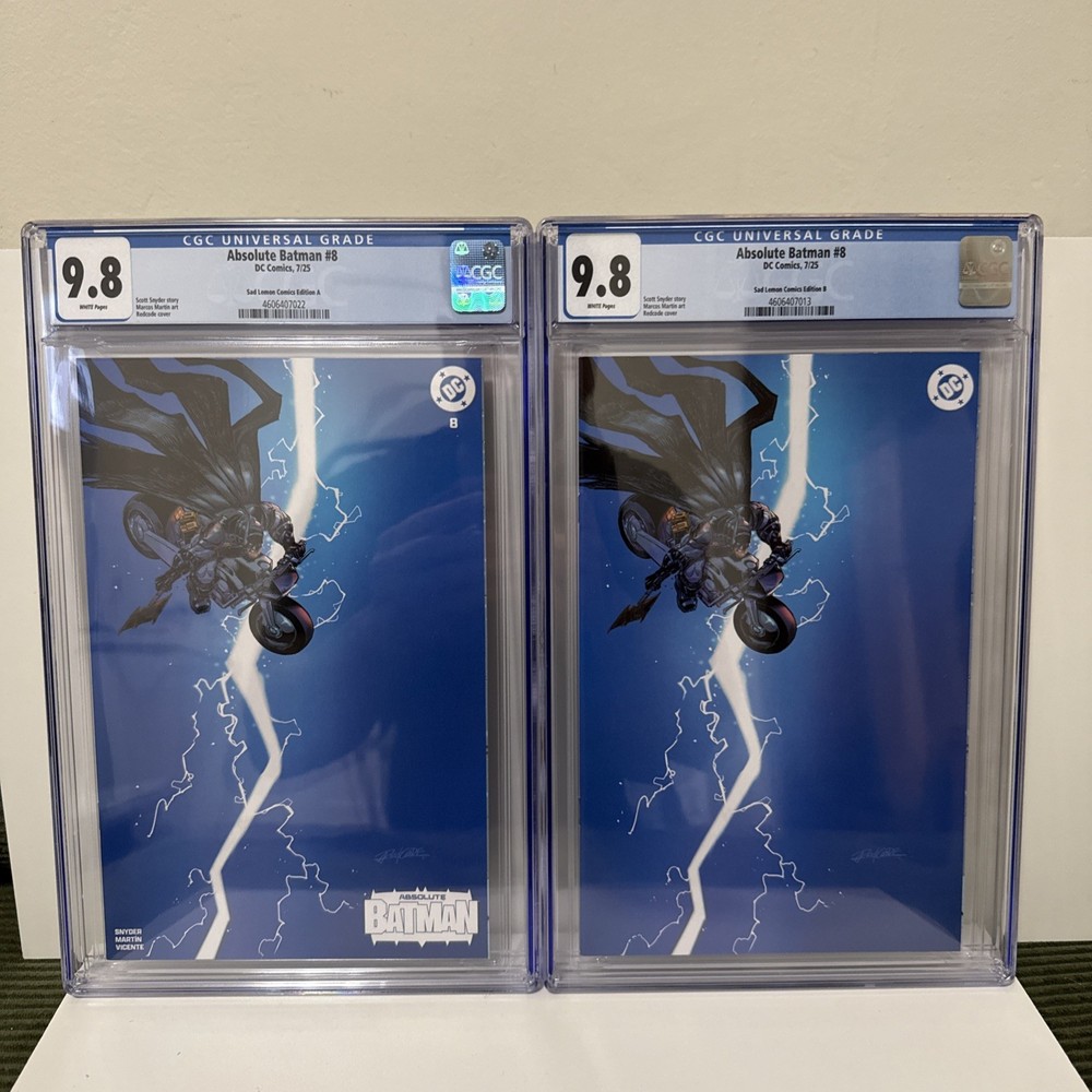 This is for 2 graded Absolute Batman #8 comics Trade and Virgin Variants 9.8 CGC! The product is a highly collectible set of two Absolute Batman comic books, each graded 9.8 Near Mint/Mint by CGC. The variant covers feature artwork by REDCODE, paying homage to The Dark Knight Returns with a Dark Knight-style design. These retailer exclusive variants are part of the modern era of US Comics and fall within the DC Universe. The comics, with an issue number of 8 and published by DC Comics in 2025, are intended for a general audience and showcase Batman in action and adventure within the colored pages of the limited edition single issues.
