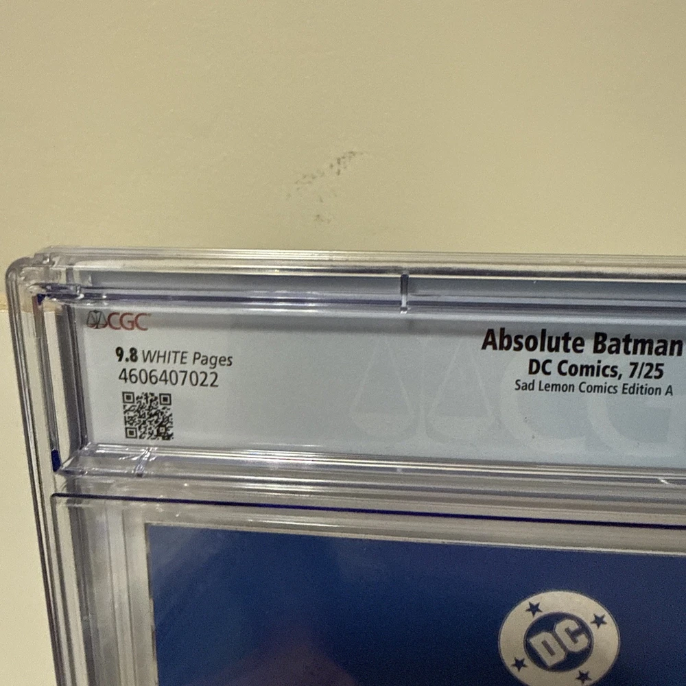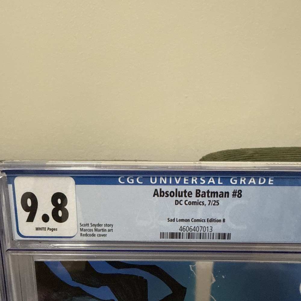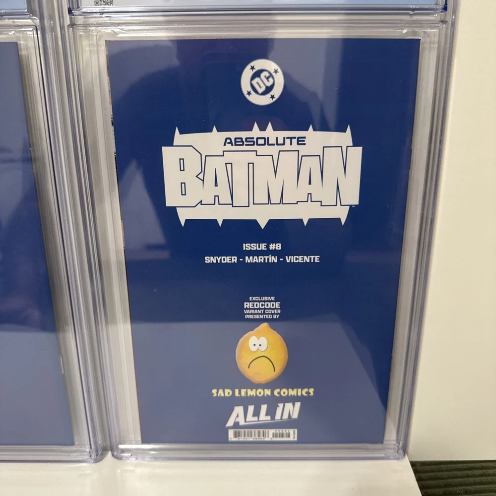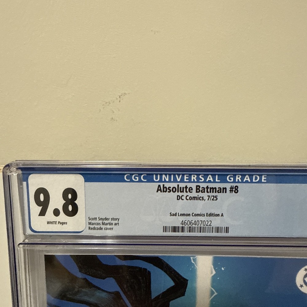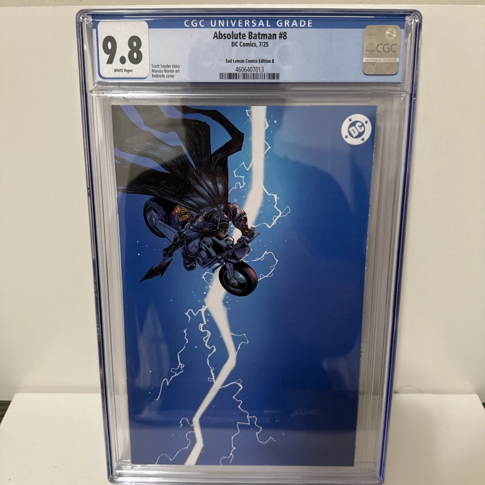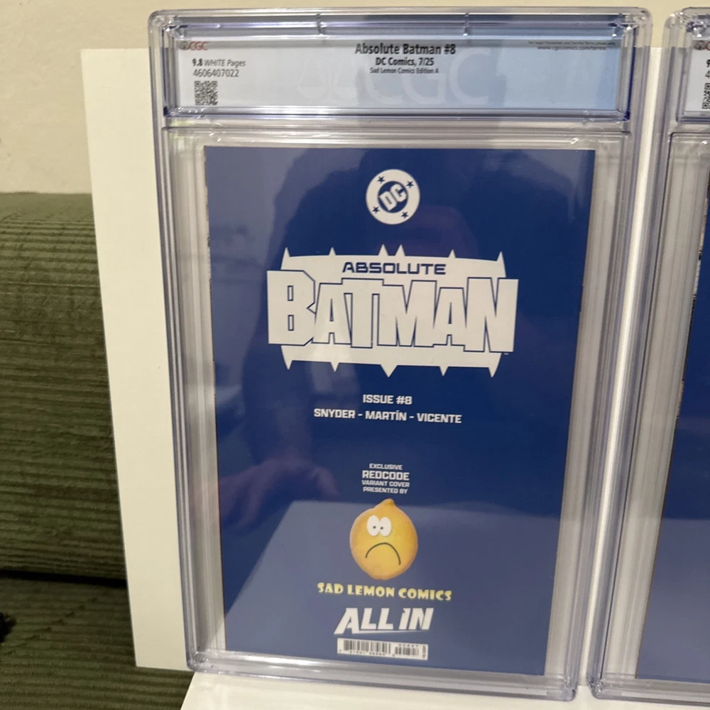This is for 2 graded Absolute Batman #8 comics Trade and Virgin Variants 9.8 CGC! The product is a highly collectible set of two Absolute Batman comic books, each graded 9.8 Near Mint/Mint by CGC. The variant covers feature artwork by REDCODE, paying homage to The Dark Knight Returns with a Dark Knight-style design. These retailer exclusive variants are part of the modern era of US Comics and fall within the DC Universe. The comics, with an issue number of 8 and published by DC Comics in 2025, are intended for a general audience and showcase Batman in action and adventure within the colored pages of the limited edition single issues.
