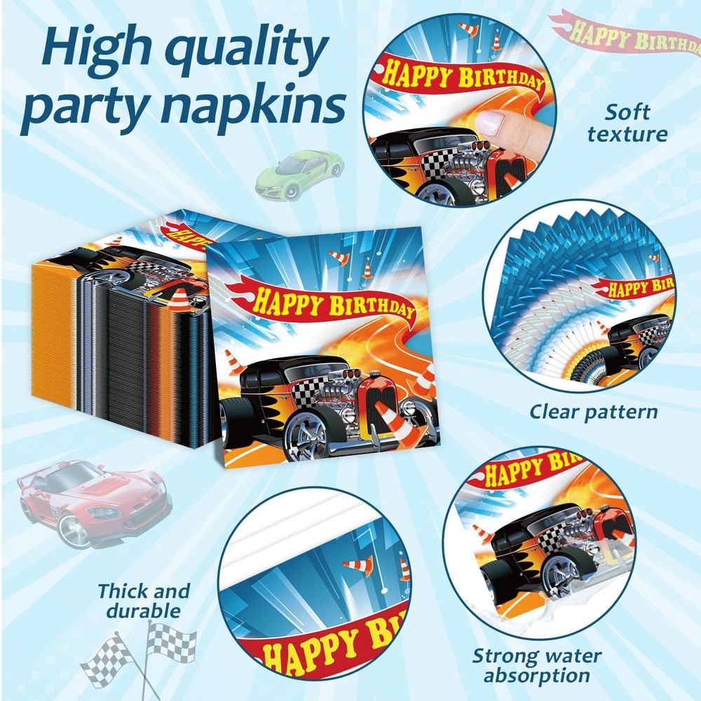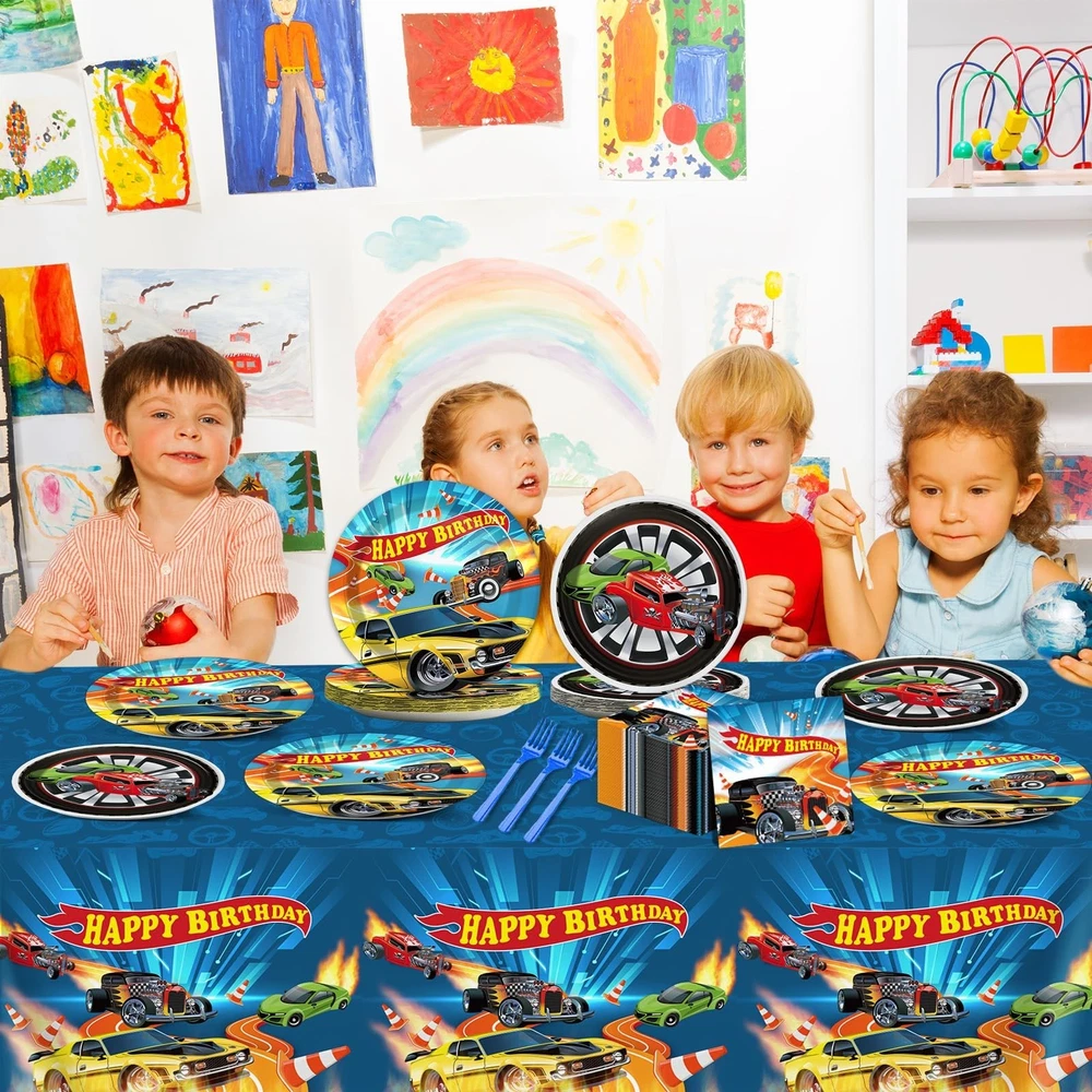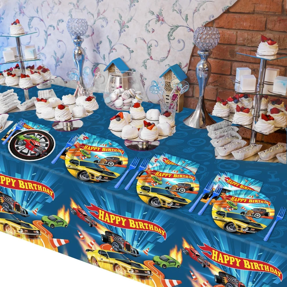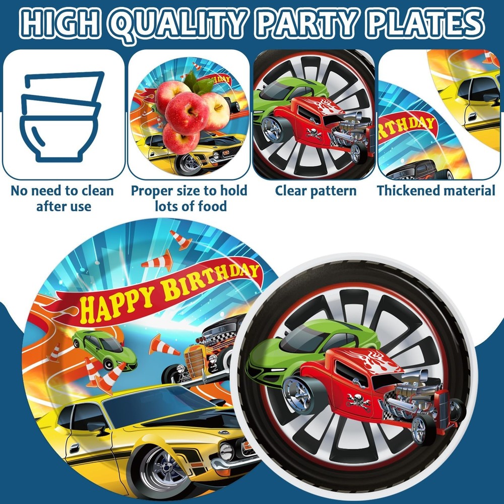 Racing Car Party Decorations for 24 Guests Hot Car Tableware Set Racing Car Plates Napkins Tablecloth Party Supplies Kit for Kids Boys Racing Birthday Table Cover Dinnerware Party Favors Package included: Total 98pcs will get! You will receive 2 pack racing car plastic tablecloths, 24 9" racing car paper dinner plates, 24 7" racing car paper dessert plates, 24 6.5" racing car napkins and 24 pieces plastic forks, each set can serve 24 guests. Car racing design: This car theme party tableware tablecloth set is all designed in different racing cars, which is highly cool and fantastic patterns. Decorating your party with these tableware kit can make your party be full of the speed-up atmosphere. Save your time: No wash up! Save your time on cleaning. You just need to throw disposable plates, napkins, plastic forks and plastic tablecloth into the trash can after the party, could spend more time playing with your kids and friends. Premium material: Our racing car tableware are made of quality paper and well-printed, which is safe and reliable to use. The racing car party tablecloth is made of plastic, waterproof and splash-proof, not easy to wrinkle, you can feel its smooth and comfortable. Those are wonderful complements to a racing car birthday themed party. Wide application: These racing car tableware sets are great for racing car-themed celebrations, including birthday parties, school events, and baby showers. The racing car decorations pair well with car-themed tablecloths, banners, balloons, hanging swirls, and backdrops to create an unforgettable racing car party atmosphere.