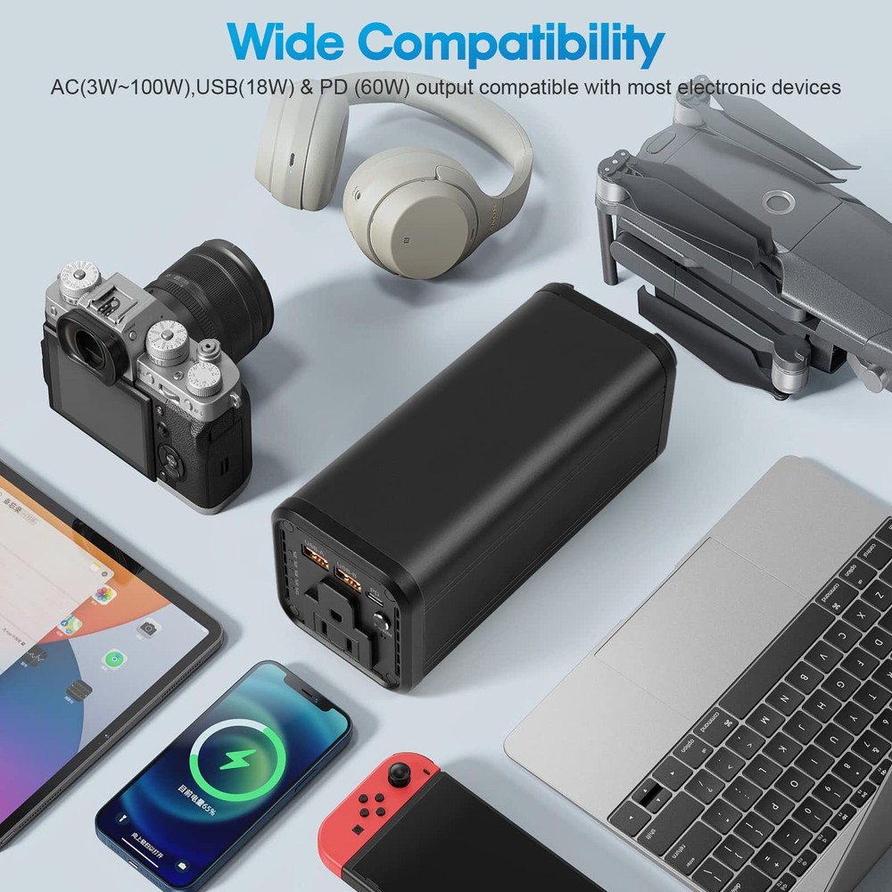 Portable Laptop Charger When you're on-the-go you can quickly put this power bank in your briefcase, backpack or carrying bag. It keeps everything going smoothly when your devices are thirsty for power. Universally for Laptop and Smart Devices For AC Output: MacBook 12", MacBook Air 13.3", MacBook 13.3", MacBook 15", Dell XPS 13", Microsoft Surface 4 12.3", HP TPN-C116, THINKPAD E430, etc. For USB and Type-C Output: iPhone series, Galaxy series, GoPro, Digital Cameras, , Nintendo Switch, etc. WARM TIPS: 1. Please do carefully read the user manual before use. To ensure its long-term usability and lifecycle, don't take apart or strike the product. 2. When the AC output is turned on, it 's normal to hear a slight noise from the battery. Because the internal fan is working to cool down the battery. 3. Don't shake when using AC outlet for charging. Safe and Reliable: With FCC, CE and RoHS certifications, multiple protection technologies can keep the power bank from over-charging, over-voltage, over-current and short circuit. When electronic devices surpass AC power limit, it will automatically turn into the protection mode to ensure Ultra-Safety performance. Huge 27000mAh Capacity: Enough power to keep you going for days. The battery provides enough juice to power most of phones over 6 times, at least 3 times and laptops about 1.5 times. It can simultaneously charge a laptop and a . Our portable power bank is able to charge laptops, phones, cameras, fans, and other electronic gadgets and appliances. Portable Power Source: Featured with 1 x AC outlet (max 100W), 2 x USB-3.0 output (18W), 1 x PD type-c output & input (60W). 100 watt AC port for those devices that need a pronged plug. 60W power delivery power bank can recharge your device in a hurry and you can refill our portable power bank in just and a half hours.18W USB charging ports that can charge smartphones and . Multiple charging ports meet the needs of various devices. 60W Power Delivery: The PD Type-C port provides 60W output and input, perfect solution for your usb-c devices and charge at the fastest speeds. And its fast recharging capabilities from the Type-C port allows the large capacity power bank to be fully recharged in 1.5 hours, saving your time substantially. What You Get: Laptop power bank x 1; Carrying pounchx 1; Type-C charging cable x 1; User manual x 1, If you have any question, please feel free us.
