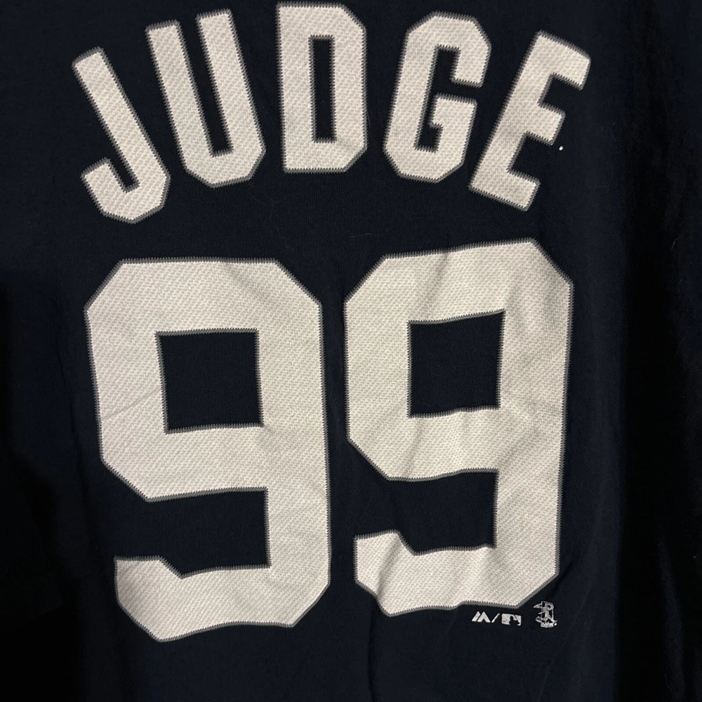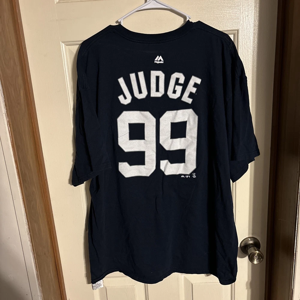 Show your support for the New York Yankees and Aaron Judge with this navy blue Majestic jersey t-shirt. Perfect for any baseball fan, this unisex adult XXL shirt features the Yankees' star player's name and team logo on the front. Made with high-quality materials, this shirt is perfect for wearing to games or just around town. W30 Celebrate your love for the Major League Baseball team with this stylish and comfortable shirt. Whether you're a long-time fan or just starting to support the Yankees, this shirt is a must-have for any baseball enthusiast. Add it to your collection of fan apparel and souvenirs today! Chest: Pit to Pit-23” Sleeve: Shoulder to Cuffs Edge-9” Length: Neck to Seam-29” International charges are the buyer’s responsibility. No international returns.