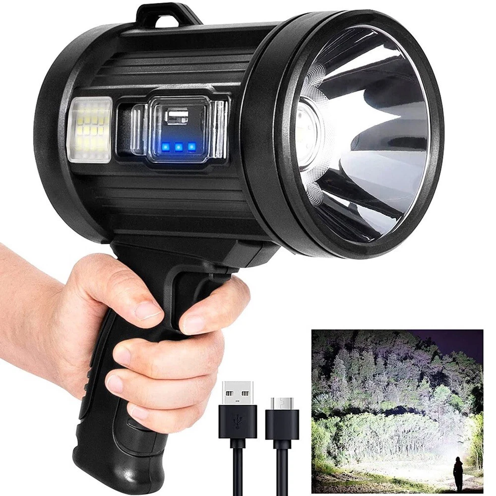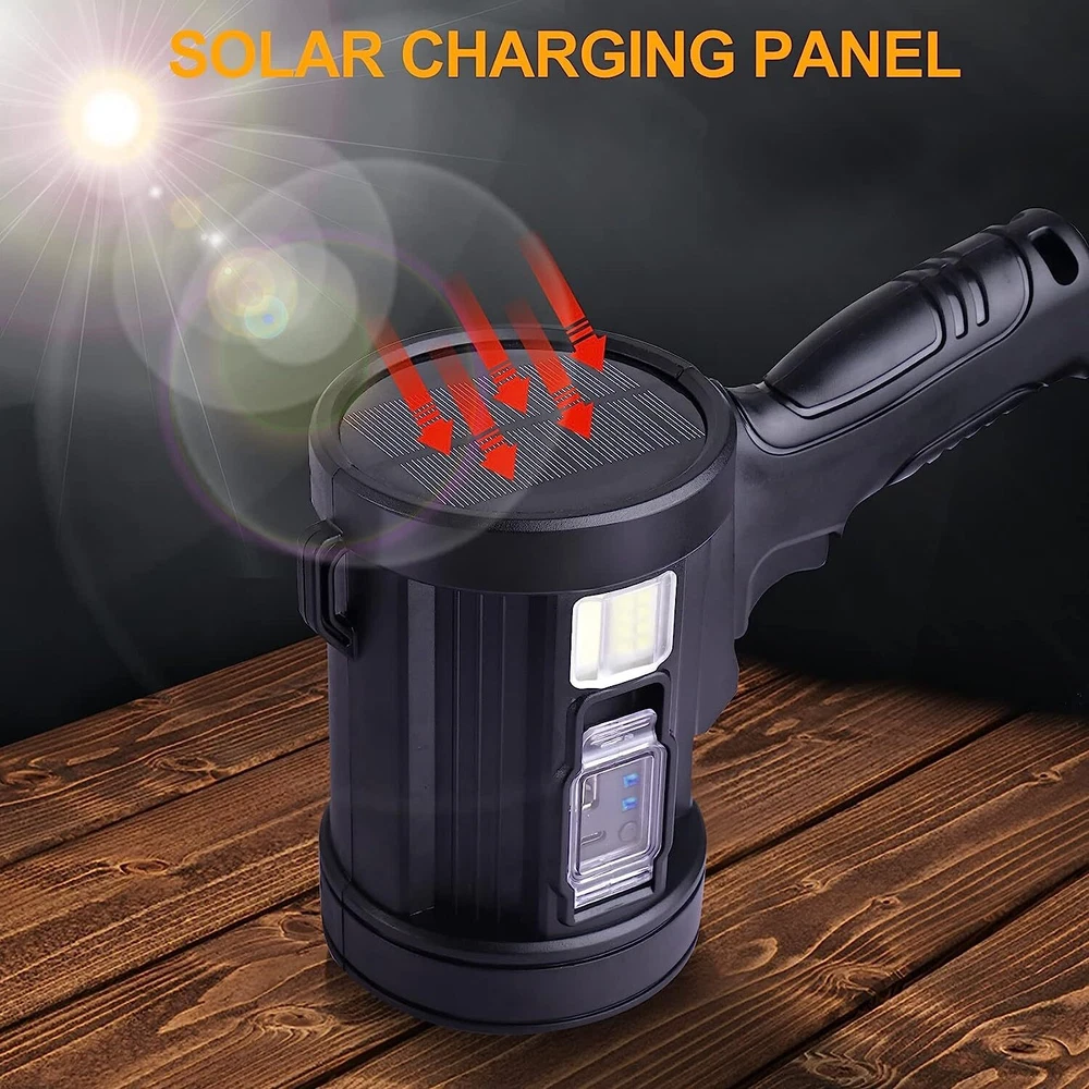 【Super Bright Large Searchlight 】Spotlight flashlights Built-in 9600mAh Battery Pack, can generate up to 90000 lumens light output,Irradiation distance is about 3280 feet(1000m), perfect for use hiking, camping, sailing or hunting outdoors, or emergency home light etcs. 【3 Main Lights Modes & 3 Side Modes】Most practical multi-functional spotlight has 3 main modes and 3 side light, front light (High -Meidum- Strobe), side light (High-Low-Safety warning light) . the warning light with red & blue light flash, which can be used as a searchlight or warning light in bad weather outdoor activities. Press and hold for 4-5 seconds to turn all off light. 【3 Charge Choice】Our solar flashlights include built-in battery USB input & output & solar, Come with a USB charging cable support rechargeable 100000 times, That's included USB Cable (4-5hrs) or by solar power (10-20hrs).The 3 blue indicator lights will show the battery situation (35%,65%,100%).USB output become power bank for your mobile phone, camera, digital product in emergency. 【IPX6 Waterproof & Durable】Super Bright flashlight ergonomic handles made of high quality ABS and aluminum alloy materials, upper tightness and IPX6 waterproof can easily handle water drops and other scratches you will encounter, Also with skid-proof, shock-proof, waterproof,rainproof, dustproof etcs advantages. 【Enjoy your 3 Color Filter】The spotlight also come with 3 color lens (red,yellow,blue), Made your own have 9 different lighting modes to indoor and outdoor activities, Put on the Blue /Yellow/Red filter both have 3 lighting modes (High - Medium - Strobe). 【Unique design】Handheld spotlight flashlight with one-touch off and power display. When you are ready to turn off the spotlight, you can simply press and hold the button for three seconds to achieve one-touch shutdown. When you turn on the LED spotlight, the power display light will automatically light up to show the real-time power level; you can also press the button next to the power display light to check the power level 【2 Years After-sale Service】Despite our best efforts, we still cannot guarantee that our led searchlights will be 100% trouble-free. So the rechargeable spot lights provide 7 x 24 hours customer service guarantee. If you receive a defective product, contact us and we will immediately send you a replacement unit for free. 【Upgraded switch Button & Package Kits】Press and hold for 4-5 seconds to turn off all lights. Spotlight kit include: 1 X Flashlight Spotlight, 3 X Filter (Red, Blue, Yellow),1 X USB Cable, 1 X Packing Box. Note: Item built-in 2pc 18650 rechargeable battery(4500mAh) Best gifts for men. The LED spotlight has has 3 main modes and 3 side light. Choose the appropriate lighting mode according to your needs. Solar spotlight is suitable for farm use, daily indoor work, and car emergency use. Nine hours full NEXTWOOD Solar Charging Spotlight We found that as an outdoor camping light, one must have an endless supply of power, so we added a solar charging panel to the outdoor spotlight, which made this searchlight one of the hottest in the entire category of outdoor handheld spotlights in the second half of 2022. This is an all-round spotlight, it can be used as a handheld flashlight, searchlight, handheld spotlight, camping light, fishing light, table lamp, desk lamp. Product main function Additional features of the product Xhp70 chip This high-power spotlight is with a xhp70 chip, stable and bright, it has a powerful output, message clearly illuminate the objects within 3260ft. 9600mAh battery Built-in large rechargeable 9600mah battery, the flashlight can be used for up to 8 hours, lighting time up to 30 hours in low lighting mode. Radiator Cup Spotlight uses an upgraded radiator cup. Prevent LED lamp beads from being damaged during use, reduce flashlight temperature and power consumption. Add 3 color filters With red, blue and yellow filters. You can switch between different lighting colors by putting on the corresponding color filter. The spotlight is equipped for a variety of scenes, is a must for home, outdoor.