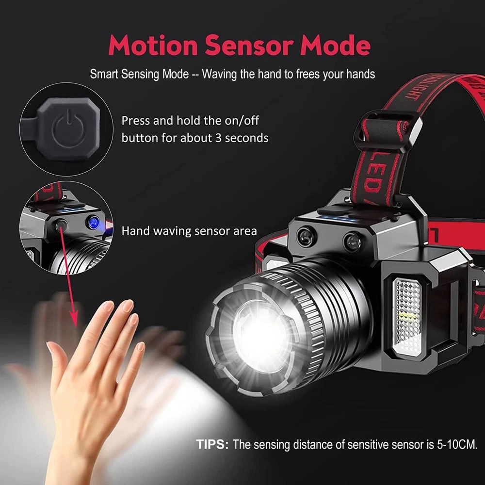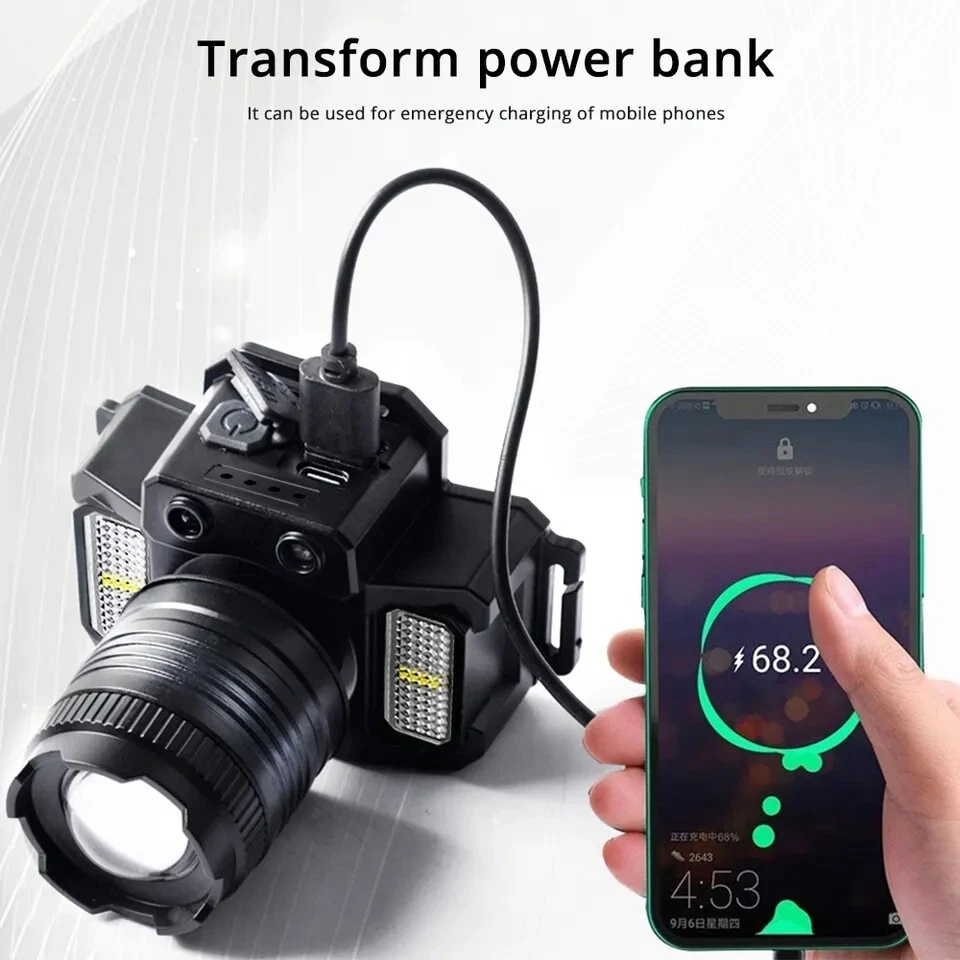 Description 1. Material: high-quality aluminum alloy + ABS material, light and durable, anti-fall and wear-resistant 2. Lamp bead: This product adopts XPG high-brightness main core, and is equipped with red and blue LED warning lights to maintain a stable high-brightness field of vision at all times 3. Zoom: Rotary zoom design, taking into account both distance and near, mechanical telescopic zoom, with optical lens, bursting with powerful light 4. Charging method: Smart USB dual interface, compatible with various charging methods, and can also charge mobile phones in an emergency, convenient and practical 5. Intelligent induction: Long press the switch to turn on the induction mode, intelligent sensitive sensor, wave induction, free your hands 6. Lighting mode: 5 gears (main light: strong light/weak light/strobe, side light: white light/side light red and blue fast flash), you can adjust the angle and light source according to your own needs, easy to operate and easy to use 7. Suitable for: camping, mountaineering, cycling, night fishing, night running, dog walking, maintenance and exploration, etc. Package includes 1*Headlamp 1*Headband 1*Charging Cable Product Highlights Name: USB rechargeable zoomable bright LED headlight Colour: Black Light color: white light + red and blue light Lamp bead: XPG+ red and blue LED Charging method: USB charging Battery: built-in rechargeable lithium battery Battery capacity: 2000mAh Charging time: 3-5h Battery life: 4-25h (100% strong light 10-12h, 50% medium light 18-20h, 25% low light 35-40h) Lighting mode: 5 gears (main light: strong light/weak light/strobe, side light: white light/side light flashes red and blue quickly) Whether to zoom: zoom Power display: 4*LED display lights (25%-50%-75%-100%) Sensing distance: within 15cm Maximum range: 300m Waterproof grade: IPX4 Product size: 45*92mm Product net weight: 128g