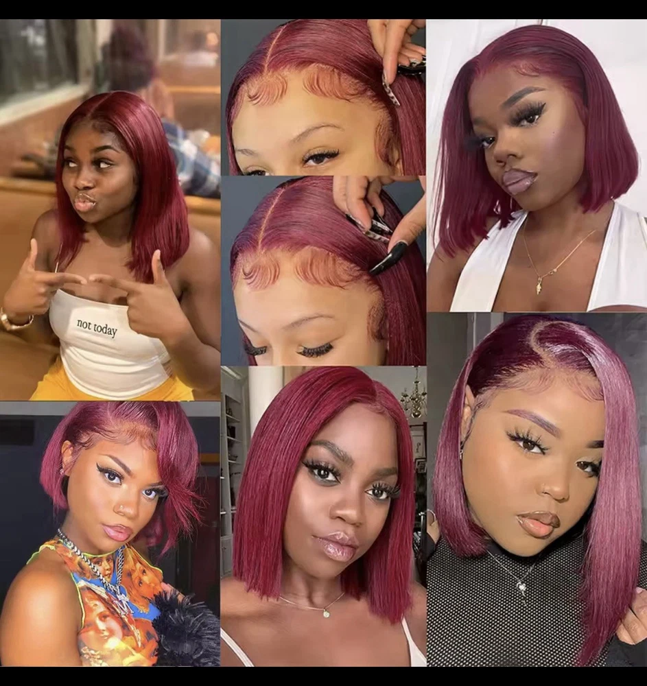 99J Short Wigs Human Hair Bob Straight Hair Wigs Burgundy 13x4 HD Transparent Lace Front Wig 180% Density Hair —12 inch