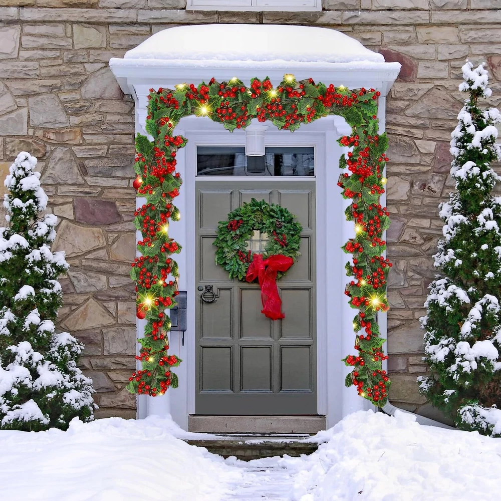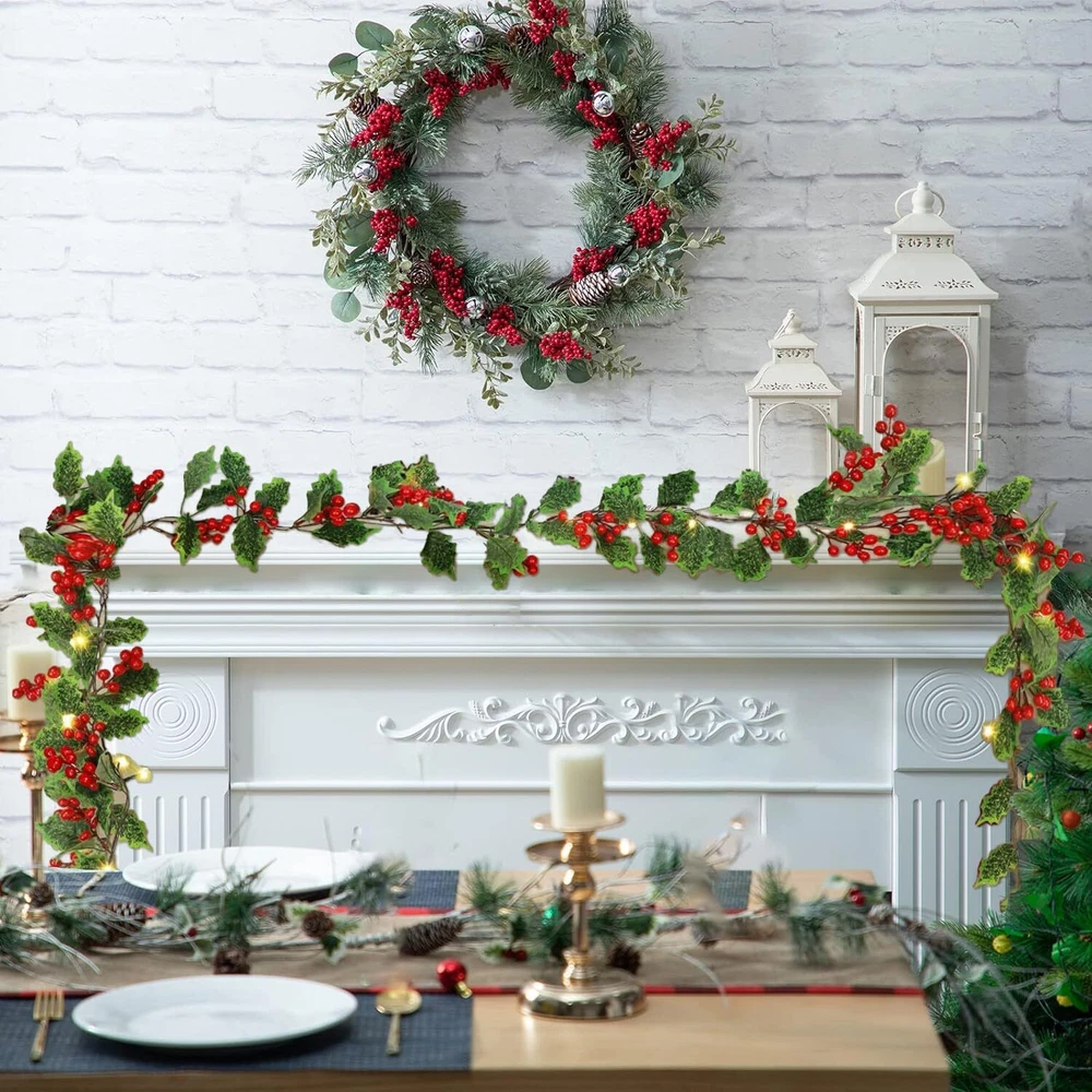 2024 Lighted Christmas Garland,Christmas Decorations,holiday and New Year decor.Christmas porch decor,Fireplace christmas decorations 9FT Lighted Christmas Garland: The Christmas mantle garland measures 9ft long, with individually crafted branch tips, decorated with warm white LED lights, red berries and green holly leaves, create a lively feel to your holiday and New Year decor. Light Up Your Christmas: This cute Christmas garland lighted with LED warm white lights among the leaves create a glowing nighttime display. Illuminate your home for enjoy all shine to create a festive and enjoyable Christmas atmosphere. Battery Powered : Operated by 3 AA batteries (not included) to give a long-lasting brightness. No trouble with mess extra wires and worry about there is no plug nearby. The battery case is not waterproof, please keep away from water. Widely Christmas Decorations: For indoor and covered outdoor use. These beautiful natural-looking garland decorations add elegance to any party, home, classroom, or office. Perfect for Christmas party, wedding, bedroom, garden, balcony, swing stand, shopping malls, mantels, doors, table centerpiece and covered front porch staircase and many other decorations Easy to Use: The lighted garland comes pre-assembled to save you time and effort. The lightweight construction of the garland also makes it easy to handle and hang. You can easily place it on your front door, mantelpiece or anywhere else you like. The flexible garland allow you to adjust the shape and arrangement to suit your taste.