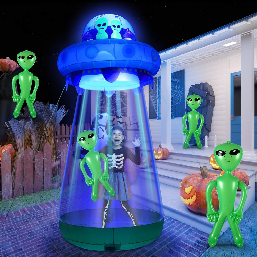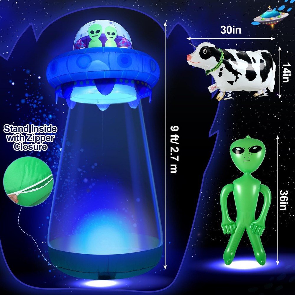 Features: It comes equipped with built in LED lights, making it visible in the dark and enhancing the eerie presence of the UFO alien, it's an ideal showpiece to amuse your Halloween party guests. Crafted from quality, reliable, and weather resistant material, this Halloween decoration is designed to withstand outdoor conditions, ensuring you can use it year after year. Specifications: Main material: waterproof material Main color: blue and green Size: UFO: about 9 ft/ 2.7 m high Alien: about 36 inches tall Cow: about 30 inches long Package includes: 1 x Inflatable UFO with LEDs 1 x Alien decor 1 x Inflatable cow decor Notes: Manual measurement, please allow slight errors on size. The color may exist a slight difference due to different screen displays. 9 Feet Tall UFO Inflatable Yard Decor Sets: three piece outdoor inflatable UFO set, including inflatable UFO, alien and cow; The oversized UFO is very decorative in the yard; The UFO has a zipper; People can enter when the zipper is opened, and then close the zipper, as if a person is trapped by the UFO; It's like it's been sucked away Extra Large Size: the entire UFO is about 9 ft/ 2.7 m high, and can accommodate an adult when unzipped; The alien is 36 inches tall, and the cow is 30 inches long; It is very eye catching and is a novelty and cool Halloween decoration Halloween UFO Yard Fun: there is a hook in the middle of the product; After the cow is inflated, attach it to the hook and enter the inflatable UFO kit; It is as if the UFO sucked you and the cow away together; 36 inch green alien inflatable toy, take you to experience the excitement of extraterrestrial life! Light up the lights at night to provide optimal appeal to neighbors and guests; Ideal for space themed Halloween parties and yard decorations Bright Built in LED Light: the entire UFO inflatable model exudes blue purple light, full of mystery and horror; The outdoor inflatable UFO is made of high strength waterproof material, which is sturdy, reliable, and reusable; In addition, this outdoor inflatable equipment is equipped with a powerful blower, which can inflate the decorations with continuous air flow; Since the inflatable product is large, it takes a while to wait for the blowing time after plugging in the power supply Ideal Decoration for Halloween: ideal for Halloween outdoor patio garden decorations, trick or treat event decorations, Halloween night events, Halloween haunted house decorations, Halloween space themed decorations, Halloween costume party decorations, stage props, birthday parties, and more
