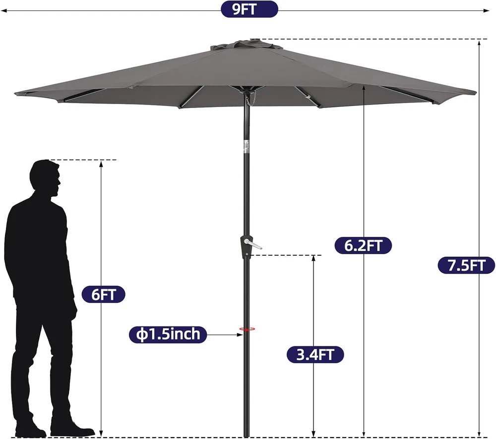 Store New Arrivals Add to Favorite View Feedback Contact 9FT Patio Umbrella Outdoor Table Umbrella with Push Button Tilt and Crank for Garden, Deck, Backyard, Pool Description Color Deep Grey Shape Round Package Dimensions 54.72 x 5.71 x 5.71 inches Item Weight 14.74 pounds Shaft Material Aluminum Handle Material Ethylene Vinyl Acetate Frame Material Aluminum Recommended Uses For Product Patio Target Audience Adult Specific Uses For Product Sun Premium Material : The 9Ft patio umbrella is made of polyester. waterproof and UV resistant, easy to clean Wide Shade: This outdoor umbrella easily shades patio table. square or rectangle table with 4 to 6 chairs Easy to Use: Push-button tilt 45°design.Operates with crank lifting system for your easy and quick use Durable Construction: 9ft patio umbrella is made of stainless steel heavy-duty ribbed brackets Umbrella Base is Not Included: Umbrella base is not included. Outdoor patio umbrella perfect for your patio, garden, pool. Please contact us with any problem at anytime ABOUT US We offer the best prices around on high quality products. Our E-store includes media such as books, movies, music and games while offering electronics, toys, sporting apparel, clothing, tools, general home, garden items and more. SHIPPING We are always working hard to ensure your package arrives as soon as possible. Please understand that some factors like weather, high postal traffic, and the performance of shipping companies are outside of our control. We offer free shipping to the lower 48 states and ship within 2 business days of payment, usually sooner. We do not accept P.O. Boxes. Please provide a physical address. For shipping outside of the continental USA, we only use eBay's Global Shipping Program.The item is shipped to KY and then sent to the rest of the world. International customers are responsible for all duties and taxes. Continue to check out in order to calculate costs for shipping the item to your country. Messages regarding eBay's Global Shipping Program MUST be directed at eBay EXCLUSIVELY. RETURNS We offer a 30-Day Return Policy on items which you are not completely satisfied with. You have the option for a full-refund or an exchange of the item. No returns are available on items shipped outside of the USA. PAYMENT We accept PayPal. CONTACT US This page content is yet to come Please ad us to your favorite seller and visit again later Thank You CUSTOMER SATISFACTION We try our very best to make sure every customer is completely satisfied. If there's a problem, message us! We're happy to help. WE ACCEPT Copyright © 2021 AutoDS. | All Rights Reserved