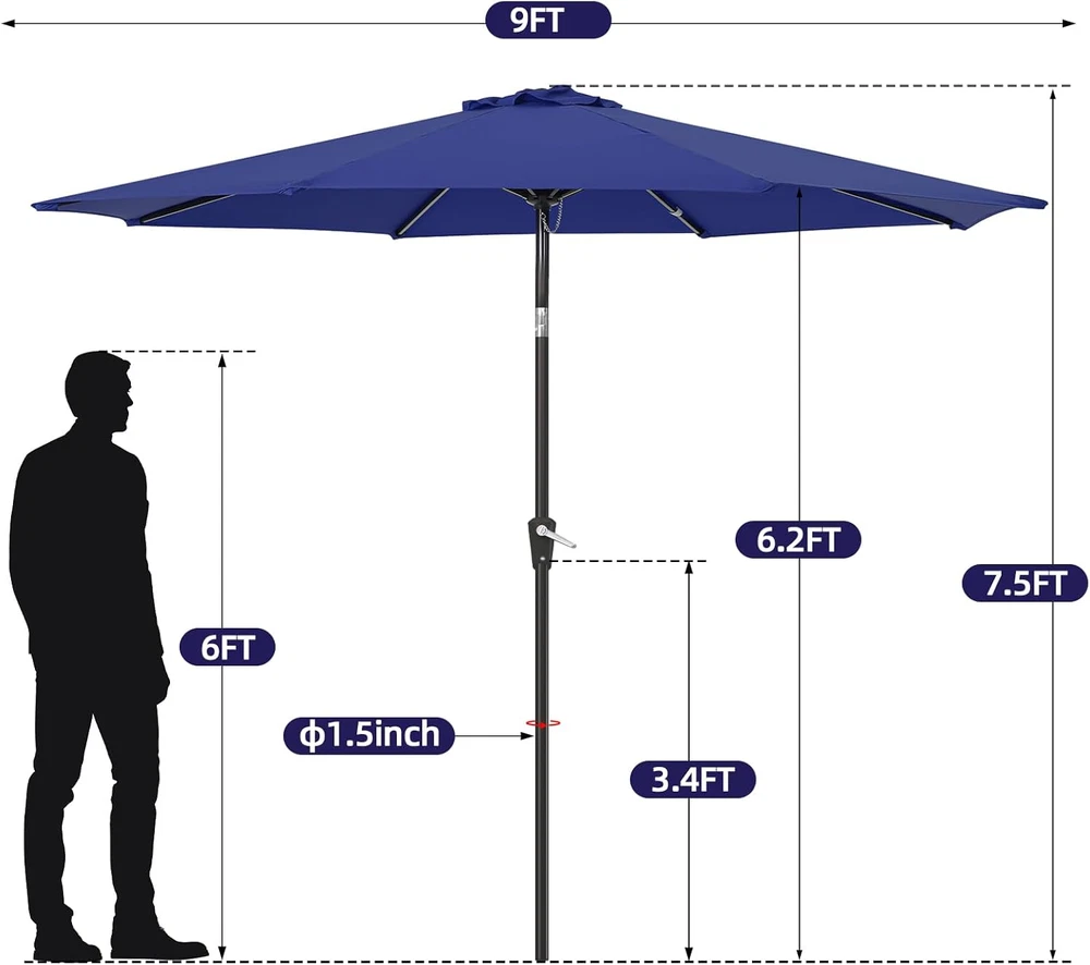 Store New Arrivals Add to Favorite View Feedback Contact 9FT Patio Umbrella Outdoor Table Umbrella with Push Button Tilt and Crank for Garden, Deck, Backyard, Pool Description Color Blue Navy Shape Round Package Dimensions 54.72 x 5.71 x 5.71 inches Item Weight 14.74 pounds Shaft Material Aluminum Handle Material Ethylene Vinyl Acetate Frame Material Aluminum Recommended Uses For Product Patio Target Audience Adult Specific Uses For Product Sun Premium Material : The 9Ft patio umbrella is made of polyester. waterproof and UV resistant, easy to clean Wide Shade: This outdoor umbrella easily shades patio table. square or rectangle table with 4 to 6 chairs Easy to Use: Push-button tilt 45°design.Operates with crank lifting system for your easy and quick use Durable Construction: 9ft patio umbrella is made of stainless steel heavy-duty ribbed brackets Umbrella Base is Not Included: Umbrella base is not included. Outdoor patio umbrella perfect for your patio, garden, pool. Please contact us with any problem at anytime ABOUT US We offer the best prices around on high quality products. Our E-store includes media such as books, movies, music and games while offering electronics, toys, sporting apparel, clothing, tools, general home, garden items and more. SHIPPING We are always working hard to ensure your package arrives as soon as possible. Please understand that some factors like weather, high postal traffic, and the performance of shipping companies are outside of our control. We offer free shipping to the lower 48 states and ship within 2 business days of payment, usually sooner. We do not accept P.O. Boxes. Please provide a physical address. For shipping outside of the continental USA, we only use eBay's Global Shipping Program.The item is shipped to KY and then sent to the rest of the world. International customers are responsible for all duties and taxes. Continue to check out in order to calculate costs for shipping the item to your country. Messages regarding eBay's Global Shipping Program MUST be directed at eBay EXCLUSIVELY. RETURNS We offer a 30-Day Return Policy on items which you are not completely satisfied with. You have the option for a full-refund or an exchange of the item. No returns are available on items shipped outside of the USA. PAYMENT We accept PayPal. CONTACT US This page content is yet to come Please ad us to your favorite seller and visit again later Thank You CUSTOMER SATISFACTION We try our very best to make sure every customer is completely satisfied. If there's a problem, message us! We're happy to help. WE ACCEPT Copyright © 2021 AutoDS. | All Rights Reserved