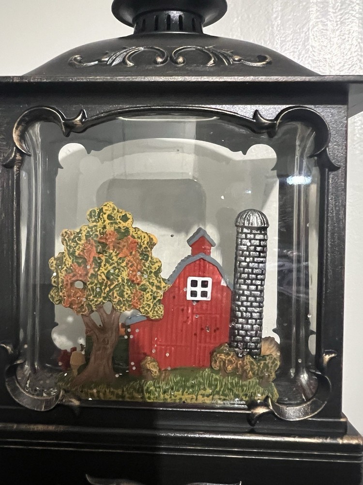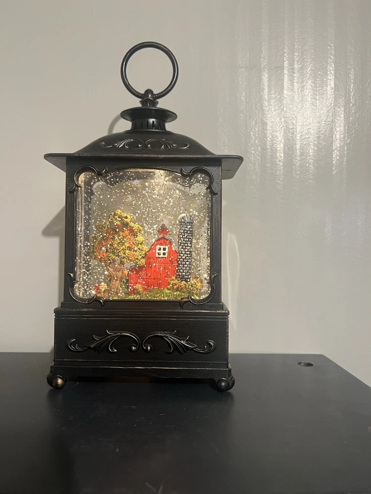 The 9" Farm Scene Lantern Lighted Swirling Glitter is a festive and charming addition to your fall and Halloween decorations. This Valerie brand snow globe features a multicolor farm scene with glittering swirling accents, creating a magical ambiance in your home. Made of glass and metal, this lantern adds a touch of whimsy and sparkle to your holiday decor, standing at 9" tall and 5.5" wide. Perfect for adding a cozy and seasonal touch to your space, this lantern is sure to delight guests and bring a touch of charm to your home during the festive season.Preowned