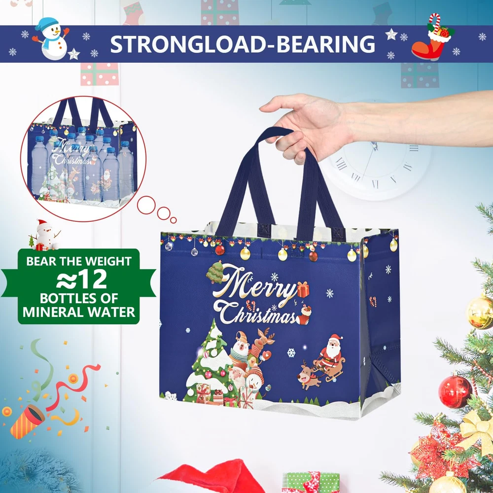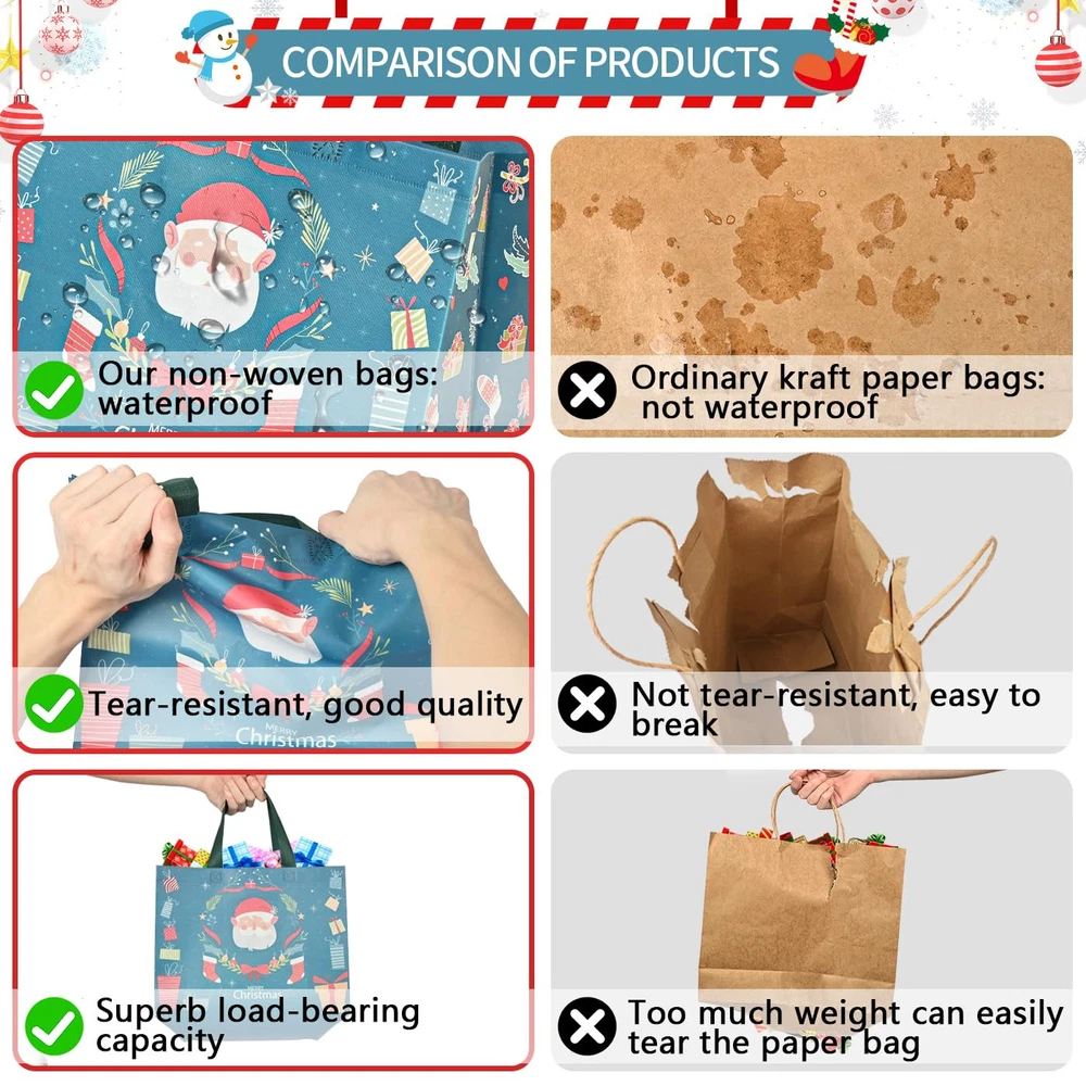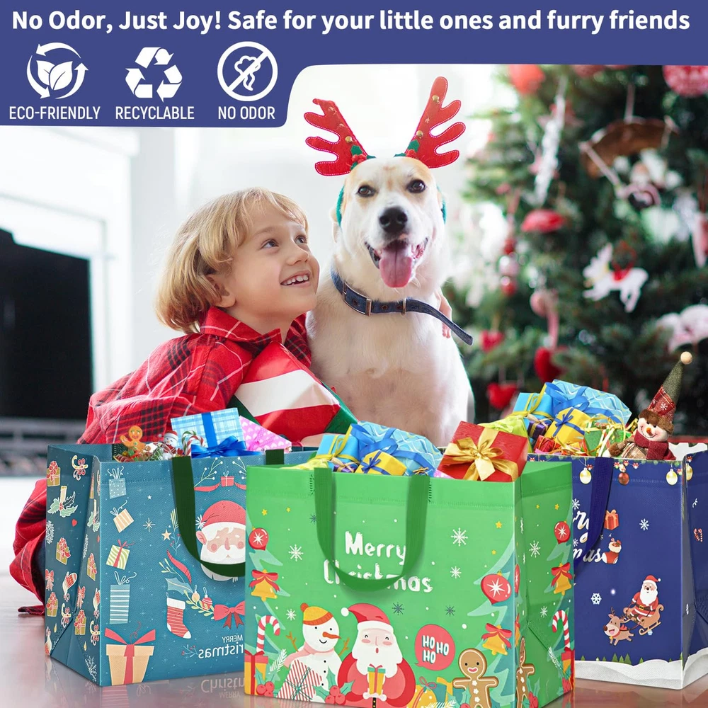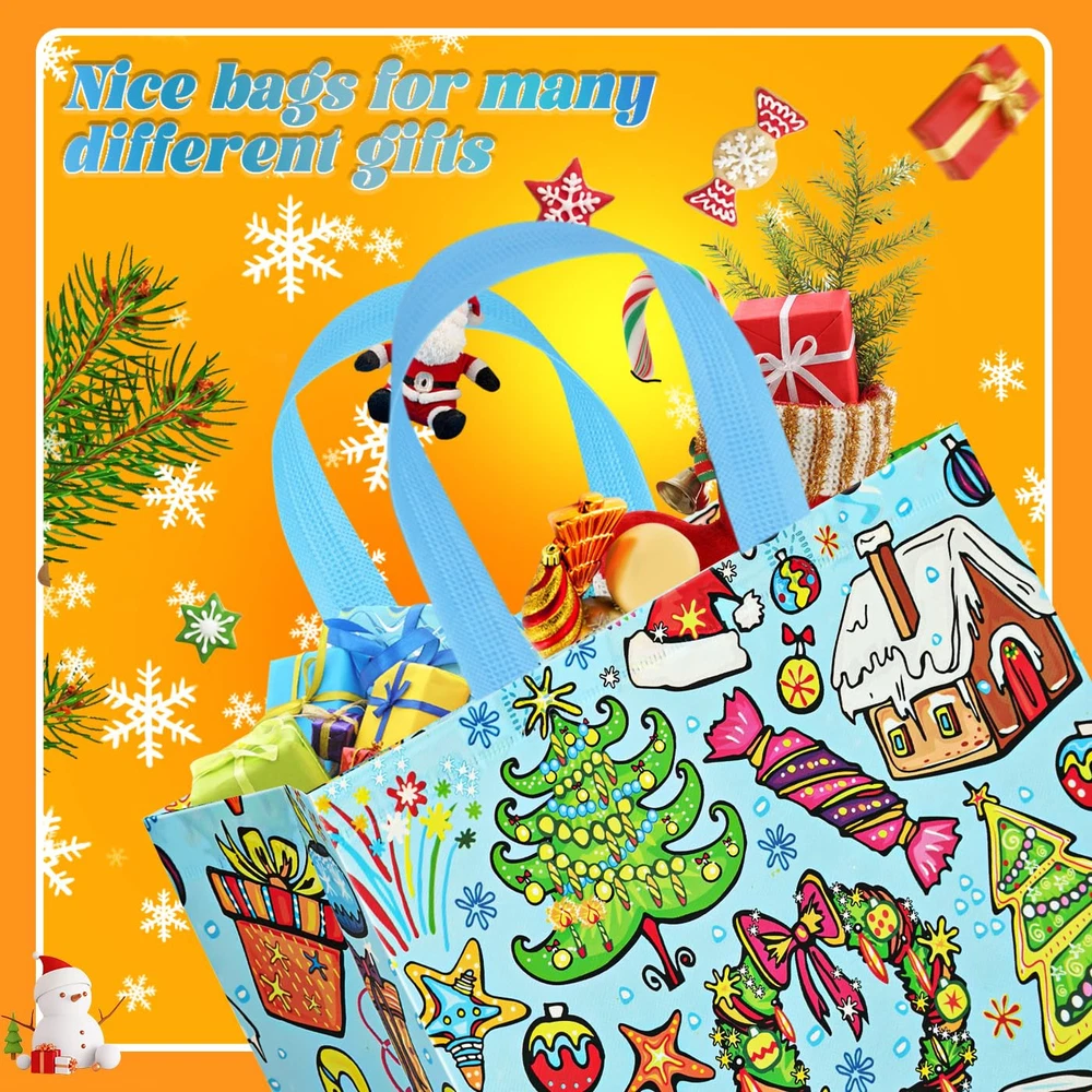 【Fun and Festive Christmas Designs】This set of 9 large christmas gift bags for kids is perfect for bringing Christmas magic to life for everyone. Each christmas gift bag features vibrant, kid-friendly holiday designs, including adorable images of Santa Claus, reindeer, snowmen, gingerbread men, and Christmas trees. With playful motifs and cheerful colors, these bulk christmas bags ensuring that both kids and adults will be delighted by their festive charm. 【Durable and Child-Safe Gift Bags】Crafted from high-quality, non-toxic, and odorless non-woven fabric, these reusable christmas tote bags are completely safe for children to handle. The widened, reinforced handles make it easy to carry even heavier presents, making them perfect for holiday parties or family gatherings. Sturdy and reliable, these xmas bags for gifts will hold up to the excitement of gift-giving without tearing or breaking, offering peace of mind for parents 【Perfect Size for Kids' Gifts】Each medium christmas gift bags measures 12.4 x 9.7 x 6.8 inches, making it an ideal size for a wide variety of children's gifts. Whether you're wrapping toys, books, or clothing, these medium-sized bags provide just the right amount of space. The sleek design ensures that your presents look polished and festive, while still being practical and easy to carry, allowing kids to enjoy unwrapping their gifts in style 【Eco-Friendly and reusable christmas bags】These holiday bags for gifts are as practical as they are fun, offering an eco-friendly alternative to traditional wrapping paper. After the holidays, they can be repurposed as christmas shopping bags or grocery bags, reducing waste and adding long-term value. Ideal for families who want to celebrate the holidays sustainably, these bags are a cost-effective and environmentally conscious choice. 【Make Every Gift Unforgettable This Christmas】Add a sprinkle of holiday magic to your celebrations with these delightful christmas bags for gifts large. Crafted to make every present feel truly unique, these bags are sure to bring joy and excitement to both kids and adults. Order now to make your holiday gift-giving more memorable and fun, while spreading festive cheer to everyone!