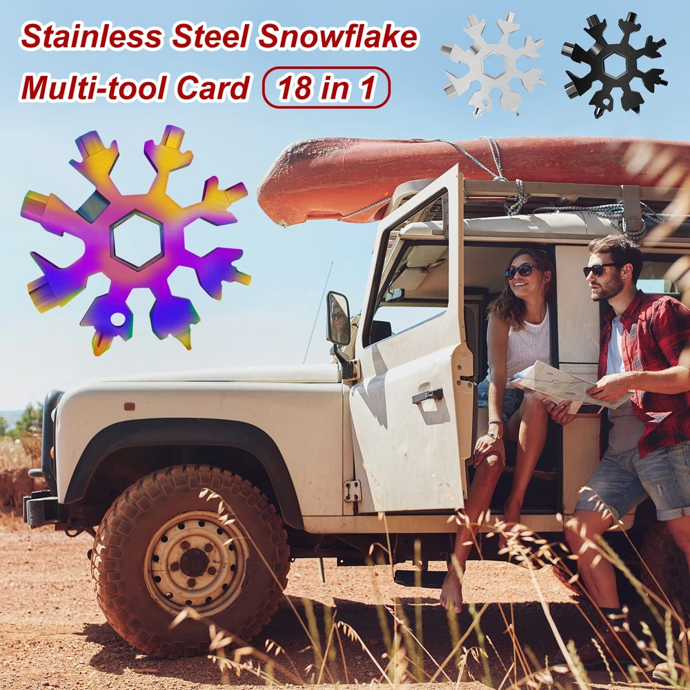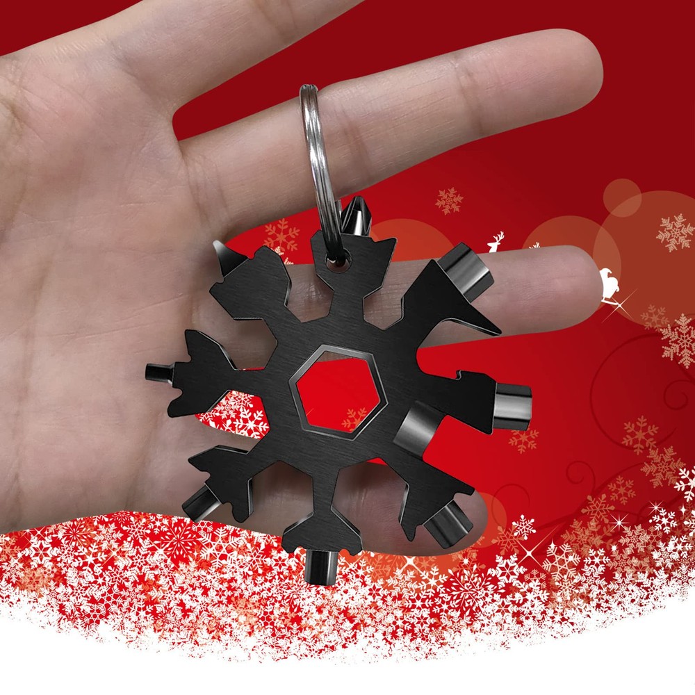 18 in 1 JOLLY SNOW SNOWFLAKE MULTITOOL:Each snowflake tool has more than 18 uses,such as hexagon screwdrivers,wrenches,slotted screwdrivers ,phillips screwdrivers of different sizes.It can be also used ,Bottle Opener, Box Cutter,Rope Cutter,Gift Hanging Drop,etc. SMALL SIZE& KEYRING DESIGN: Our snowflake multi tool is Pocket Size.It just over 2.5" in diameter.It is so easy to be taken along.Because snowflake tool comes with a key ring that can be hung on a key or backpack.Key ring is designed to avoid the possibility of loss. MULTIPLE USES: One snowflake tool to unlock for multiple purposes.One snowflake multitool can be used to open the beer bottle,turn the screw,fix snowboarding,bicycle,Toys and more.It can be also used to open the carton, hung on the key or backpack. Hang on the Christmas tree for decoration or as a gift.When camping,rescue,boarding also be used. BEST CHRISTMAS GIFT: You will get 9 x multi-tool,9 x key rings,1 x Merry Christmas gift card,1 x gift box.It is an excellent gift for Christmas gifts.It's a good choice whether it's for Christmas decorations or as gifts. STURDY&DURABLE:Snowflake tools 18-in-1 multi-tool is made of high quality stainless steel,exquisite workmanship.It is so sturdy and durable.Unique snowflake shaped design.Combine function and design in our compact multi-tool. Practical and beautiful.