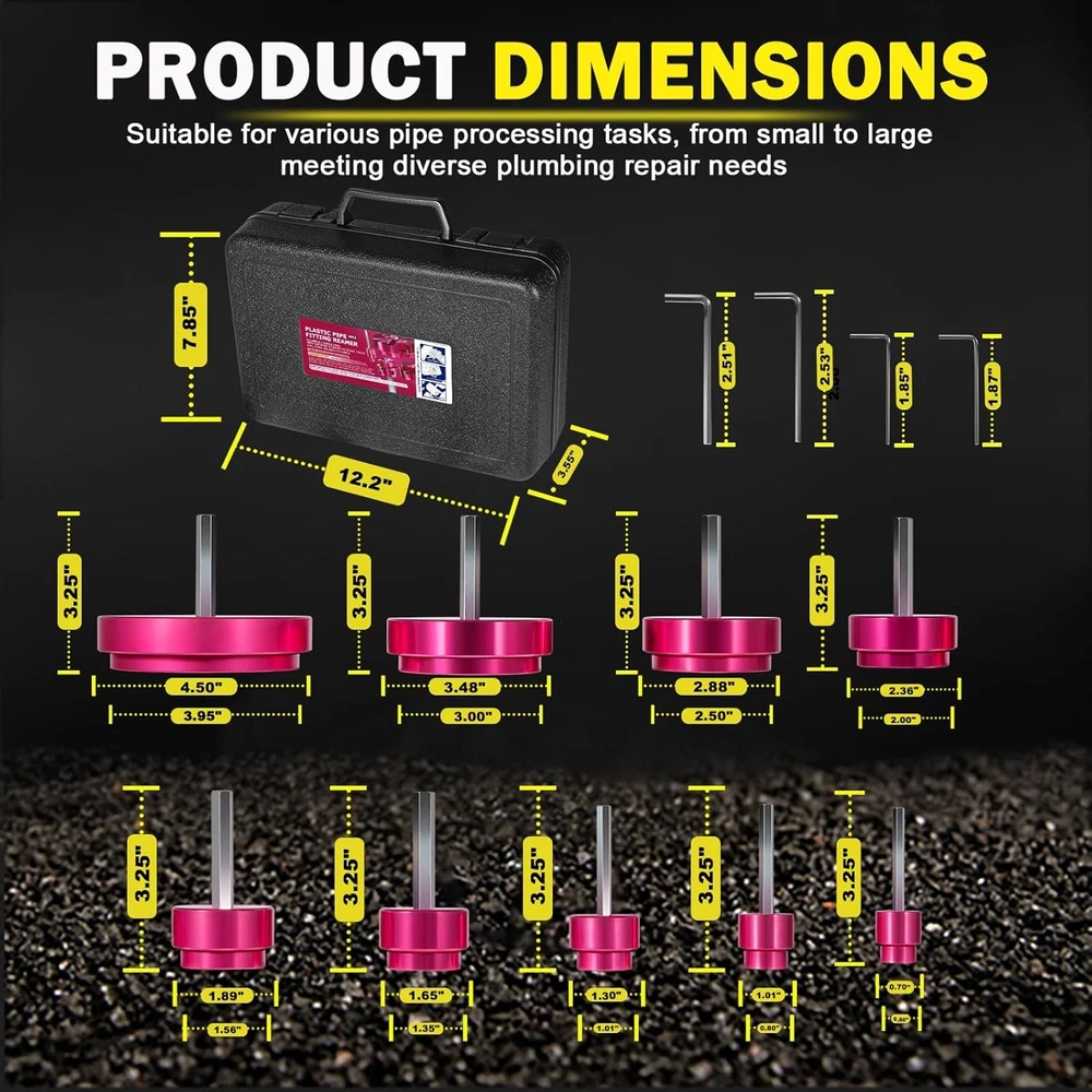 Premium 9-Piece PVC Pipe Reamer Kit, Includes Sizes 1/2", 3/4", 1", 1-1/4", 1-1/2", 2", 2-1/2", 3", 4", For Standard 1/2" Drills, Ideal for PVC, CPVC, ABS Pipes, Perfect for Plumbing Repairs 【Comprehensive 9-Piece Set Design】 This PVC pipe reamer kit comes with 9 different reamer sizes, including 1/2", 3/4", 1", 1-1/4", 1-1/2", 2", 2-1/2", 3", and 4". The kit is ideal for a wide range of plumbing tasks, from small repairs to larger installations, providing versatility for professionals and DIYers alike. Whether you are working on pipes for residential or commercial projects, this set offers everything you need. 【Compatibility with Standard 1/2" Drills】 Designed to fit standard 1/2" drills, each reamer features a 3/8" hex shaft for easy compatibility. Whether you are using a corded, cordless, or impact drill, this kit ensures seamless integration into your toolset, making it ideal for both professional plumbers and DIY enthusiasts. 【Precision and Efficiency】 Tailored specifically for North American pipe diameters, this reamer kit delivers precise reaming for critical tasks. Made from advanced hard alloy, these reamers provide superior strength, durability, and longevity. The custom design ensures perfect compatibility with pipes and facilitates efficient cleaning by removing residual pipes and cement, thereby saving time and material costs. 【Professional's Choice】 This 9-piece PVC pipe reamer kit is an essential tool for plumbing professionals. With a full range of sizes, it offers unmatched versatility and convenience for various repair and maintenance tasks. Professionals trust its proven reliability and comprehensive size options to handle any plumbing job with precision and efficiency. 【Cost and Time Efficiency】 By enabling the cleaning and reuse of existing pipe fittings, this product significantly reduces the need for complete pipeline replacements. This not only saves time and effort but also cuts down on material costs, making it an economical solution for pipe maintenance and repairs. 【Tested Reliability】 Each reamer in this kit has been rigorously tested for up to 1000 reams to ensure consistent performance and reliability. This thorough testing guarantees that the tool can withstand extensive use, providing a dependable solution for long-term pipe management. 【Leak-Free Joints】 This reamer ensures the creation of leak-free joints, enhancing the overall performance and lifespan of PVC, CPVC, and ABS piping systems. By eliminating irregularities, it ensures optimal flow and secure connections, making it a valuable addition to any plumbing tool kit. CONTACT US: If you meet any problem after receiving our product, please feel free to contact us. We will try our best to solve your problem. SHIPPING POLICY: Orders will be ship out within 1-2 business days after payment has cleared. Orders from Saturdays, Sundays or holidays will process on next business day and will be ship within 24 hours. Please allow 10-30 days for international deliveries. Some shipments could take longer subject to your local customs authorities. RETURE & WARRANTY: 1 We accept 30 days return guarantee for all Items If you are unsatisfied with something you bought from us, you may send it back within 30 days of receipt, and we shall be happy to exchange or refund. 2 Leave a message note in returned box quoting your item(s) ID and buyer ID. 3 All returned products must be in their original condition and packaging. Unfortunately, if products have been assembled or modified, we cannot take them as returns. 4 It is important that we know when your return is expected. Please save your return tracking number or post receipt, and email it to us. We need this in case there are any issues during transit. 5 Refund will only be issued upon our receipt of the returned parcel. Please allow 2 working days for us to process with your return. ABOUT REPLY: If you have any questions, please feel free to email our service specialists 24 Hours a Day, 7 Days a Week, and we will reply you ASAP. If no response within 24 Hours, please check the spam of mail box or kindly re-send it to us. ABOUT FEEDBACK: Please contact us before leaving Netural or Negative feedback if you are not satisfied our service or products. Good communication is helpful for both of us to resolve any problems and issues. We work hard to make sure EVERY CUSTOMER 100% SATISFIED and resolve any problem for you and always leave positive feedback to all our customers. If you are satisfied with our service, please leave FOUR 5-Detailed Selling Rating (DSR). Thanks!